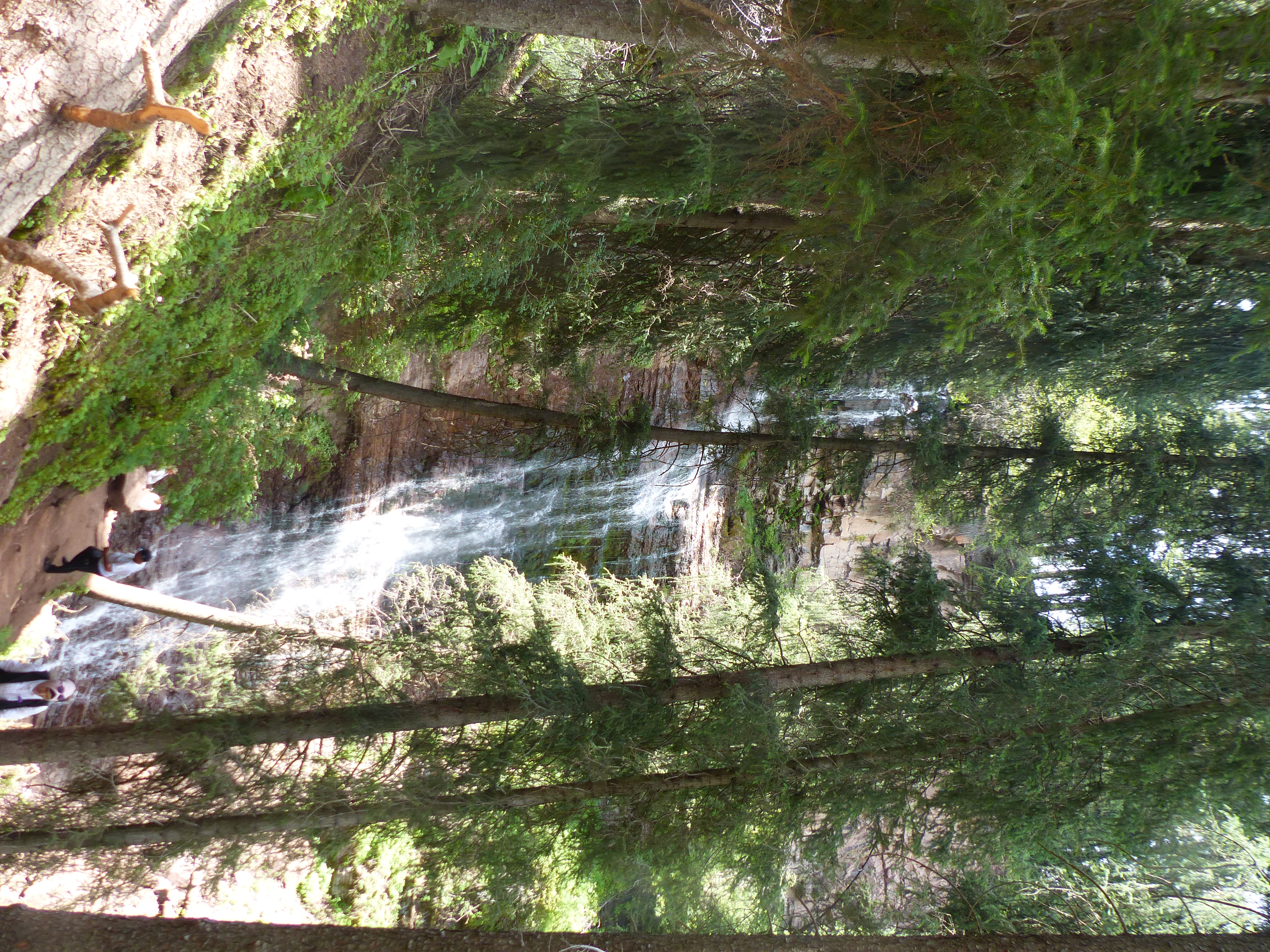 Après une petite heure de marche en montée sur un sentier à flanc de montagne dans la forêt (je précise qu’on croise des touristes notamment russes tout le long du sentier), nous arrivons enfin à cette fameuse cascade qui est effectivement très belle et très haute. Une petite anecdote intéressante : la forêt que nous traversons a été plantée par des prisonniers allemands, à la fin de la seconde guerre mondiale, comme pas mal d’autres forêts dans le pays (il fallait bien les occuper…) et il se trouve que dans plusieurs endroits, les soldats ont planté les sapins en forme de croix gammée, au nez et à la barbe de leurs gardiens russes.