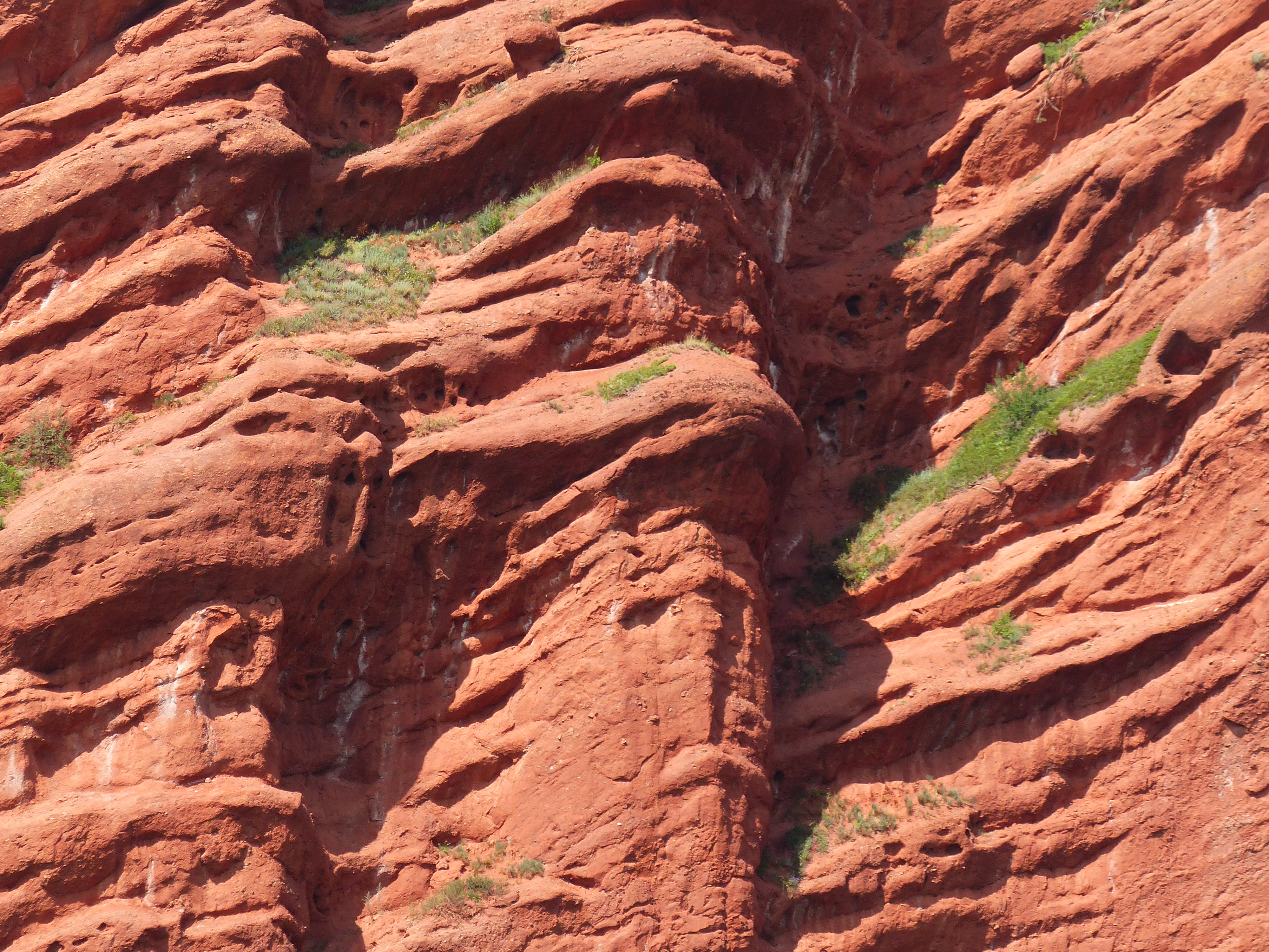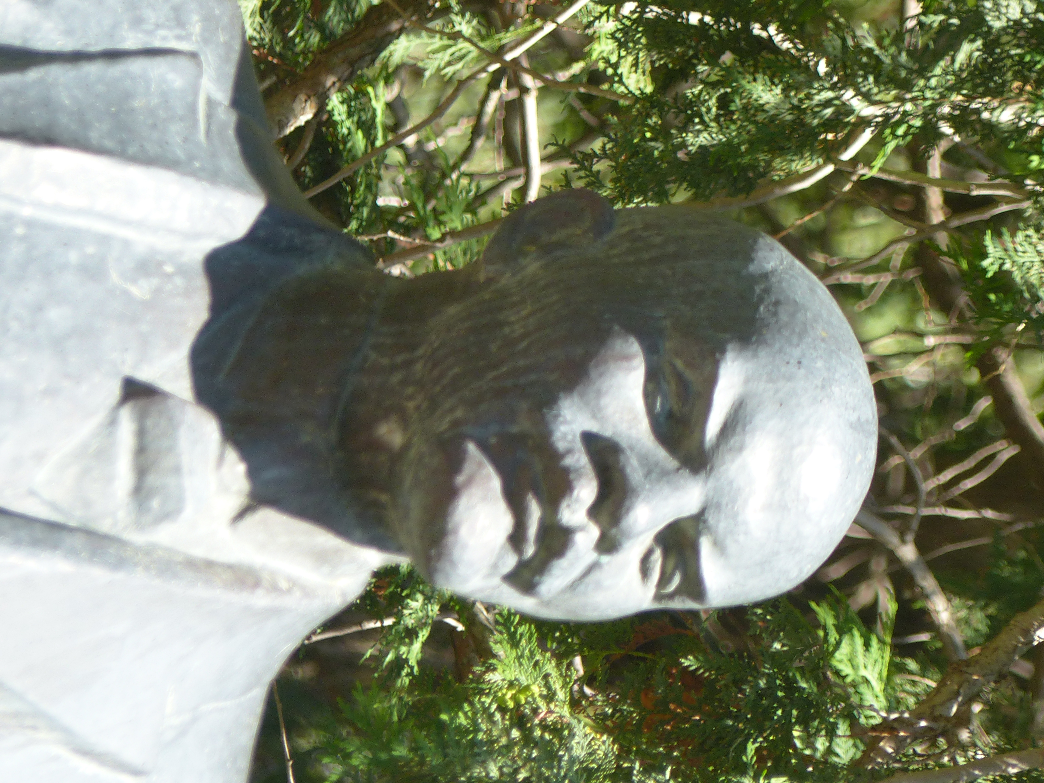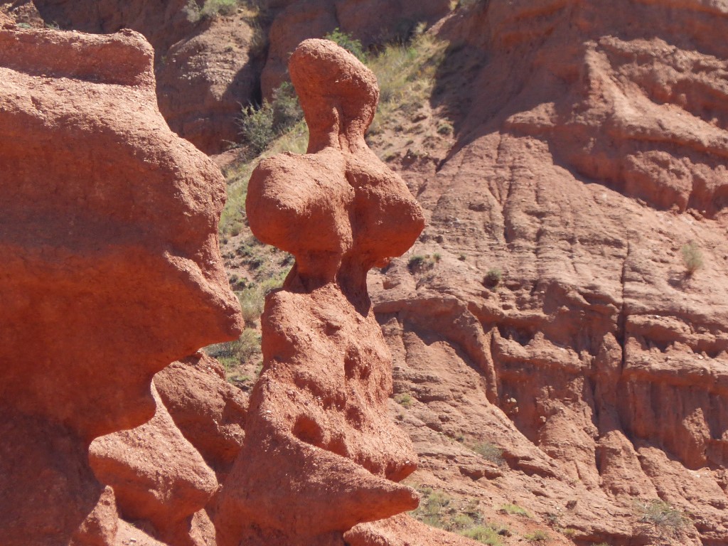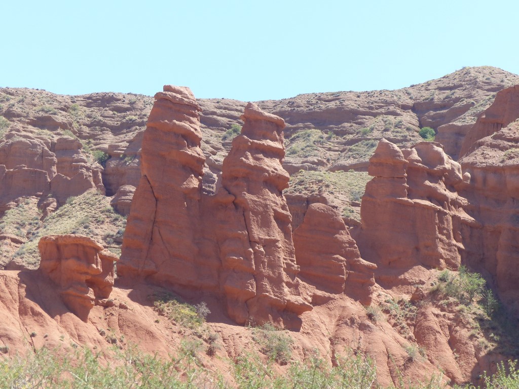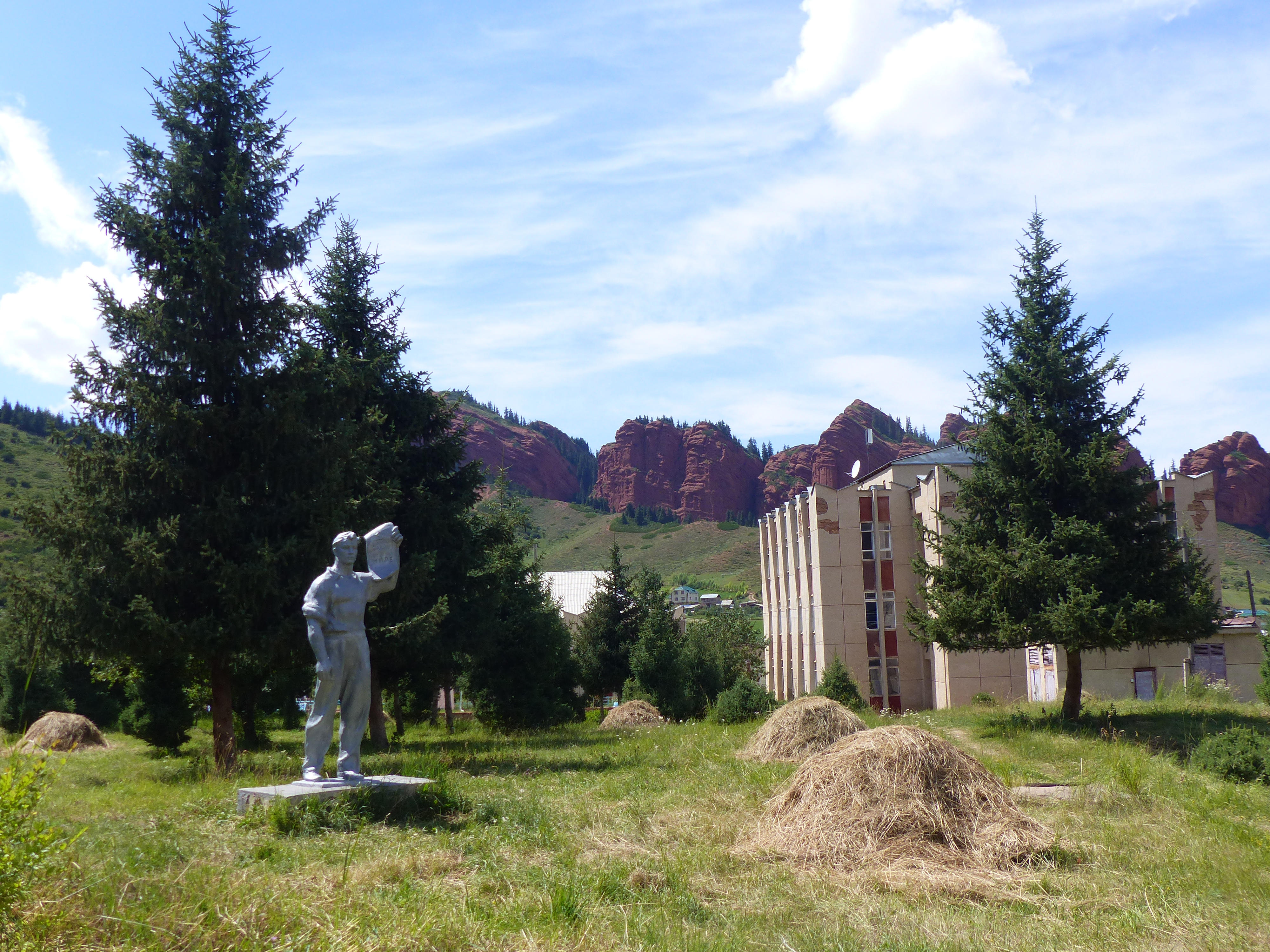 Au retour, nous nous arrêtons comme convenu près du célèbre rocher dit « des 7 taureaux » (il y a une légende à ce sujet dont j’ai oublié les détails mais il est question je crois d’un amour contrarié, et bien sûr de 7 taureaux … ne me demandez pas le rapport entre les 2, je ne m’en souviens pas!). Au pied de ces rochers monumentaux se trouve un petit village qui abrite un « sanatorium » (en fait un centre thermal) datant de l’ère soviétique et passablement décrépit. C’est quand même agréable de se balader dans les allées du parc, entre les pelouses à la tonte « bio » (c’est à dire dont l’herbe est fauchée à la main…). Il y a 3 ou 4 bâtiments qui logent les curistes, et 1 autre qui accueille le centre de soin. Il y a aussi plusieurs statues qui « agrémentent » le parc, et nous posons sous celle de Lénine. Cette visite instructive terminée nous prenons de la hauteur pour admirer encore mieux la vue sur les 7 taureaux et les montagnes de couleur rouge qui entourent le village. De l’autre côté, les 7 taureaux se transforment en un coeur brisé (et c’est encore plus beau) … d’où peut être le rapport avec l’amour contrarié (je viens juste de faire le lien ….).