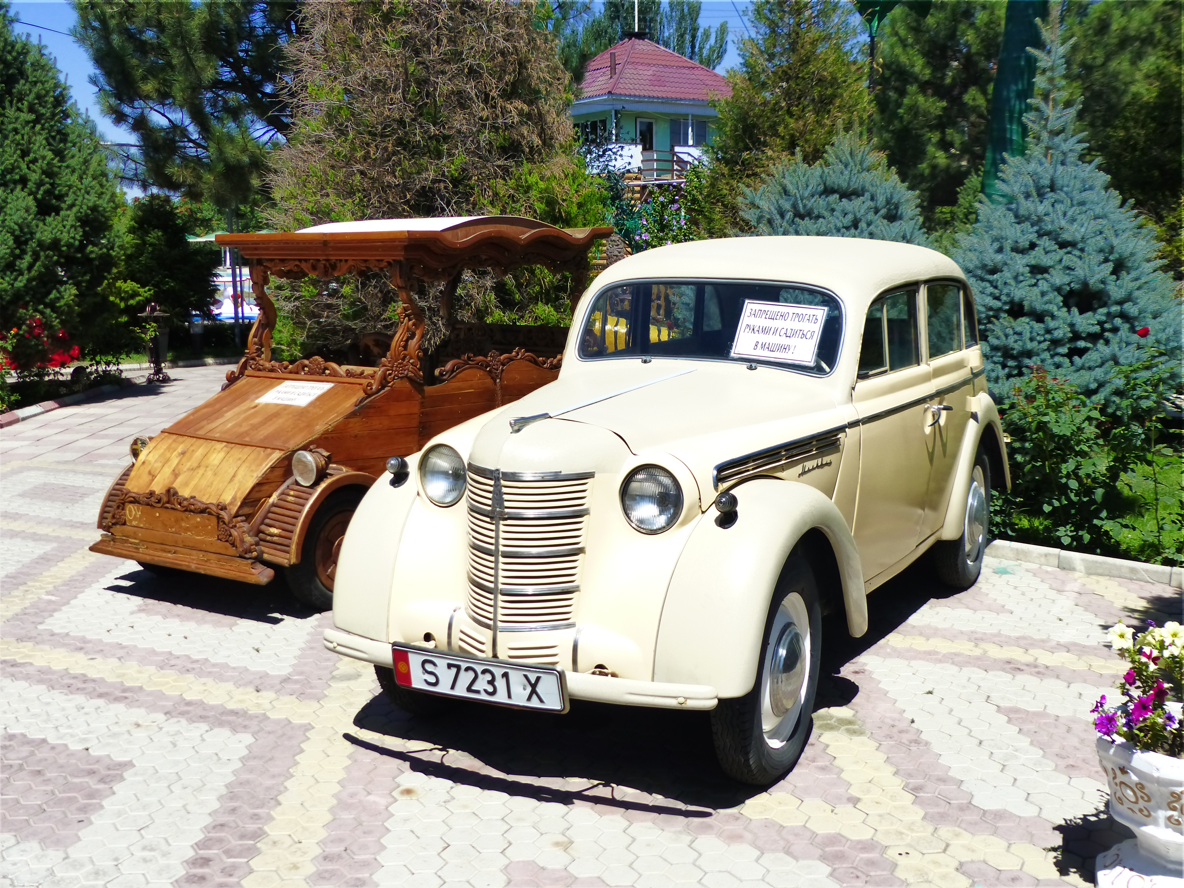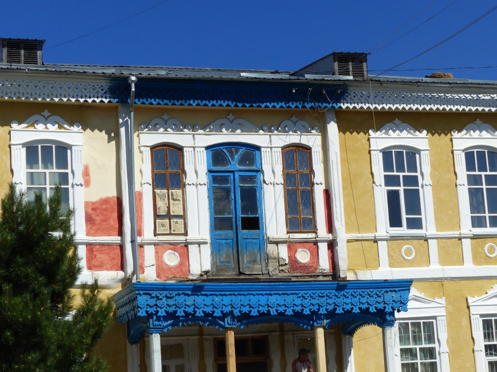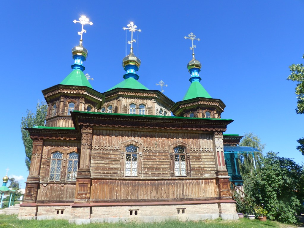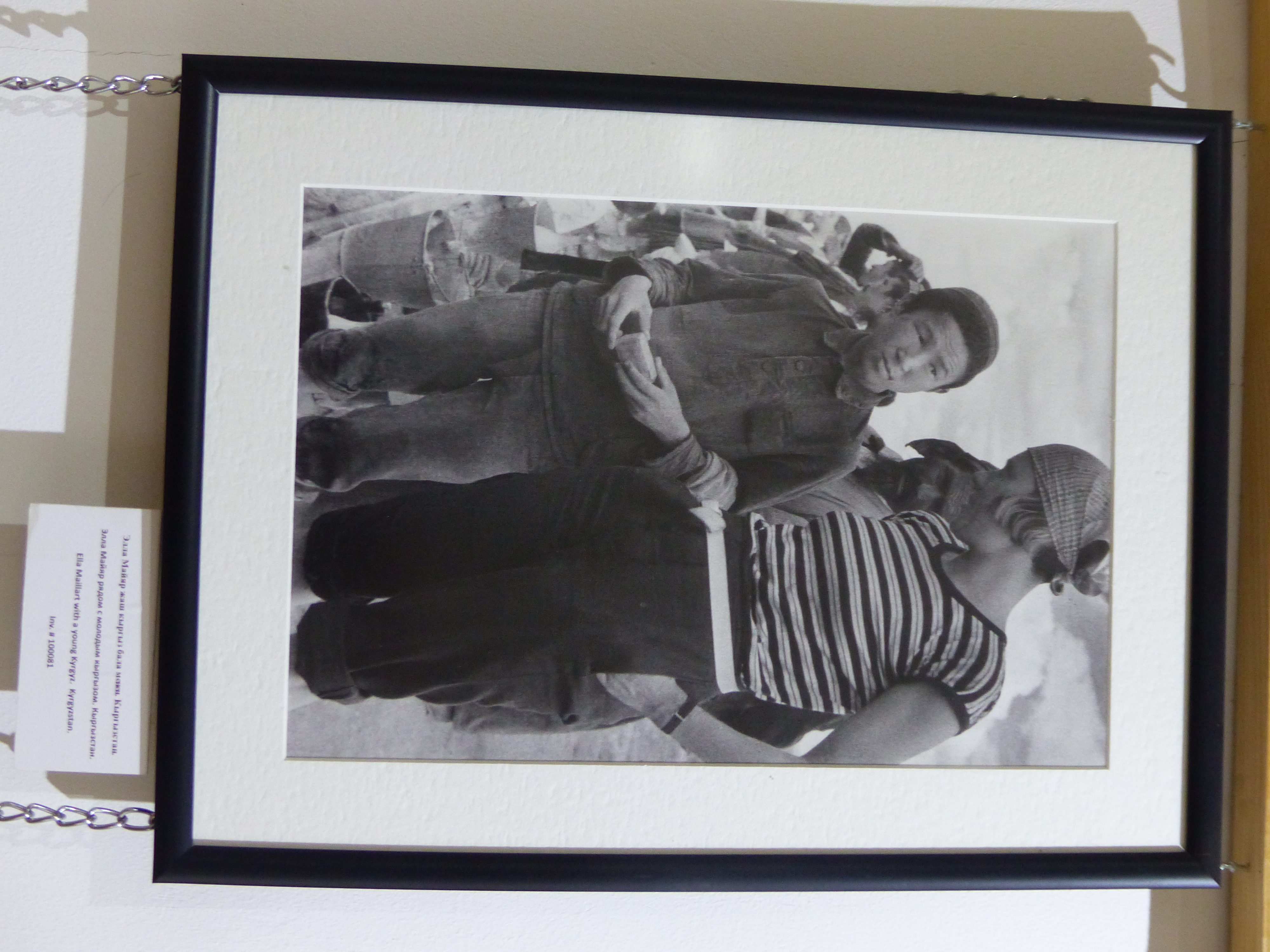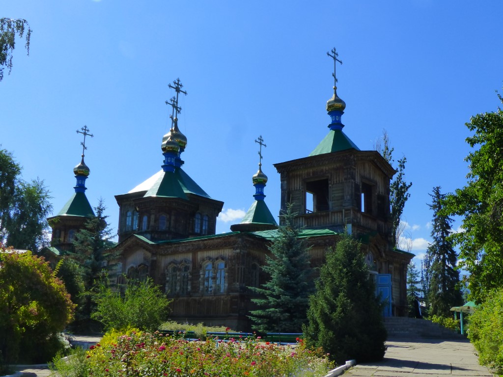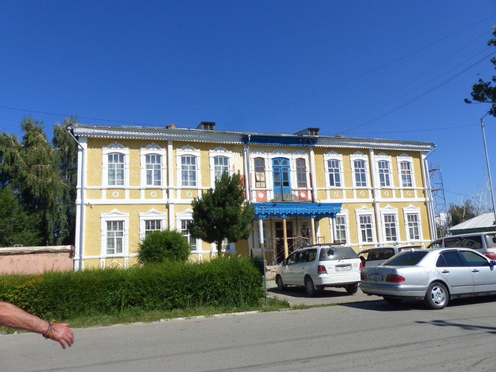 Nous poursuivons notre route pour atteindre en milieu d’après midi la ville de Karakol, environ 40000 habitants, tout à l’Est du pays, et point de départ pour moultes activités sportives dans les montagnes environnantes (il y a notamment une station de ski). Notre premier arrêt sera pour le musée ethnographique local, qui abrite notamment une riche expo de photos d’Ella Maillart, qu’elle a prise au cours de ses excursions dans le coin pendant les années 30 (je ne peux que recommander chaudement la lecture de ses bouquins … une sacrée exploratrice!). Le reste du musée est un peu moins sympa, d’abord parce qu’il est tout en russe ou kirghize, et ensuite parce que, au-dela des objets traditionnels locaux, il comporte principalement des photos des dignitaires locaux depuis une centaine d’année (on a droit à la tête de tous les maires, députés et autres hommes importants – le fait qu’il n’y ait quasiment pas de photos de femmes n’étonnera personne – quelques soient les mérites de ces personnages, voir leur binette sans en apprendre plus que ça ne présente qu’un intérêt limité….). Il y a quand même une salle consacrée à la faune locale, avec plein d’animaux empaillés, dont la fameuse « panthère des neiges », mais aussi le « mouton Marco Polo » (= très grand bouquetin), d’autres bouquetins, un sanglier énorme (presqu’aussi gros que l’ours d’à côté), des marmottes, des rapaces en tout genre (notamment aigles et vautours) …