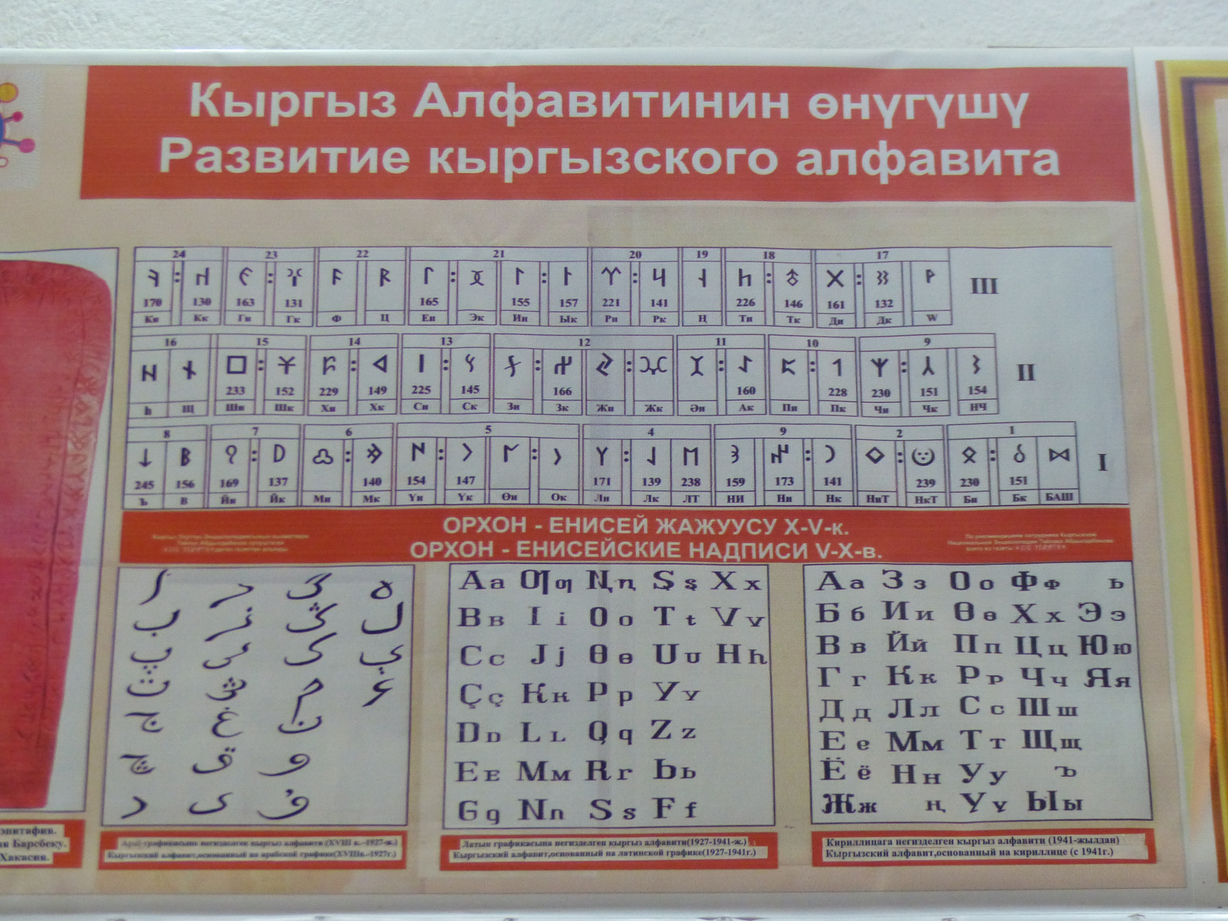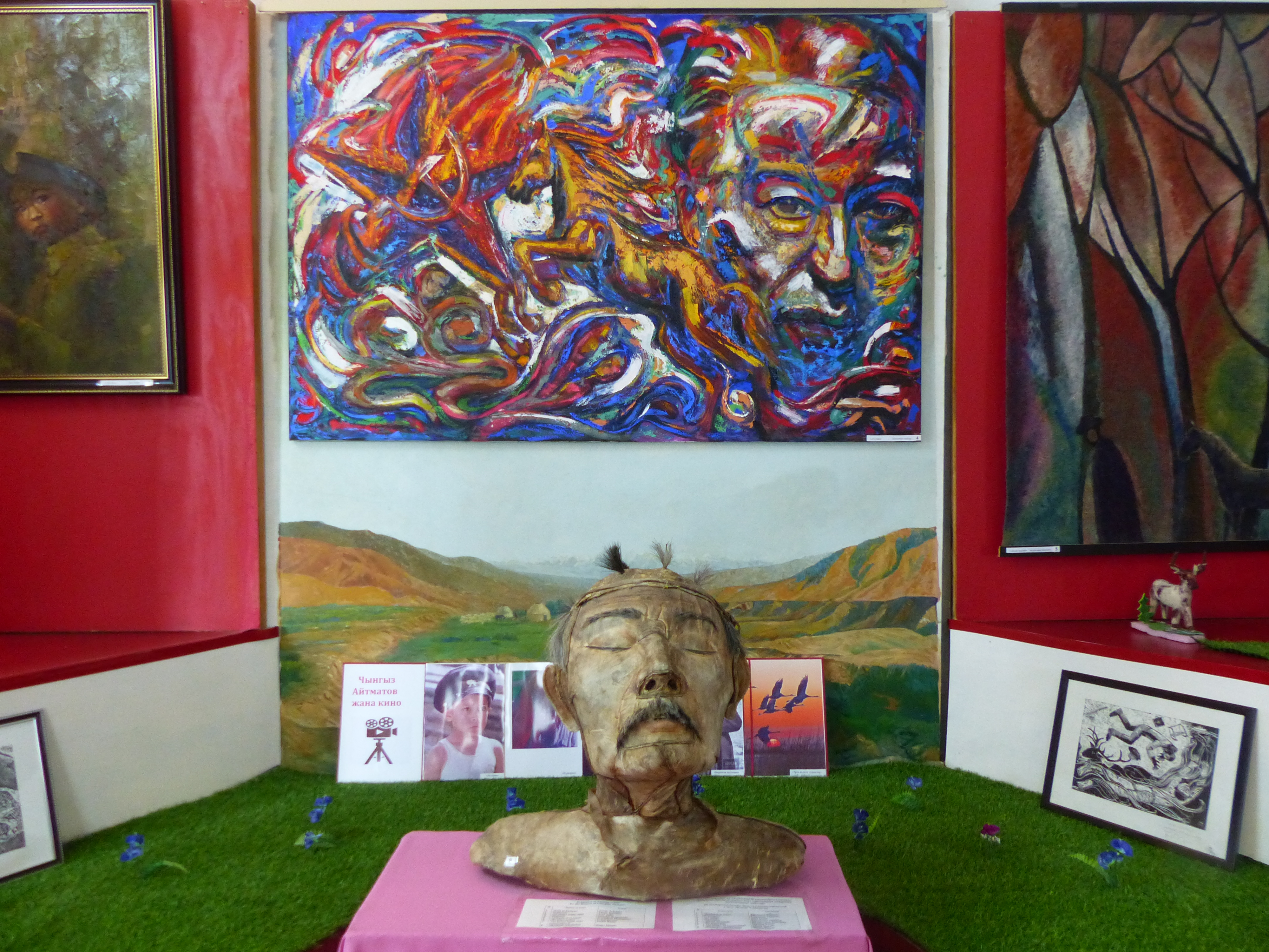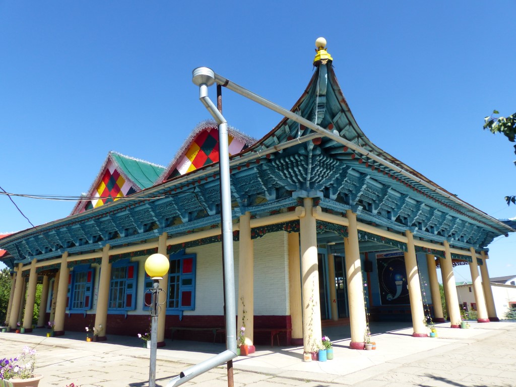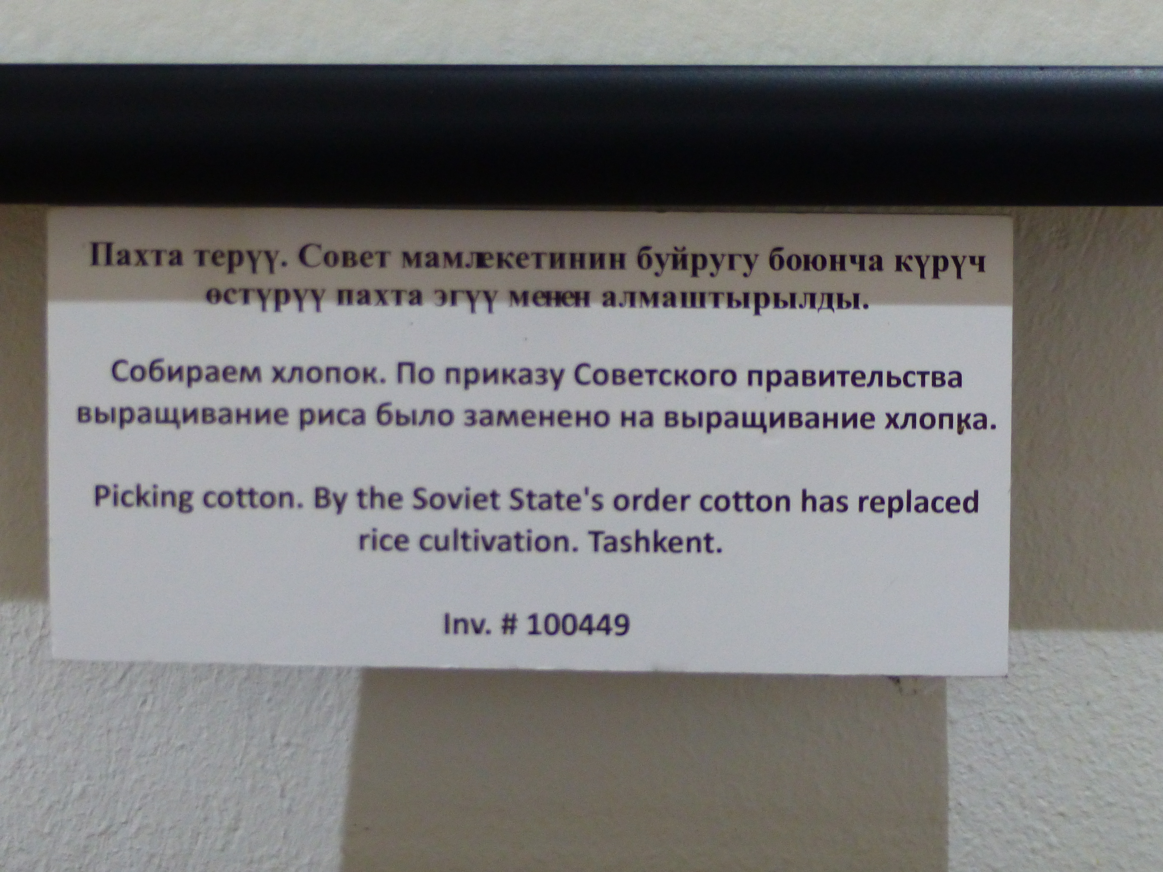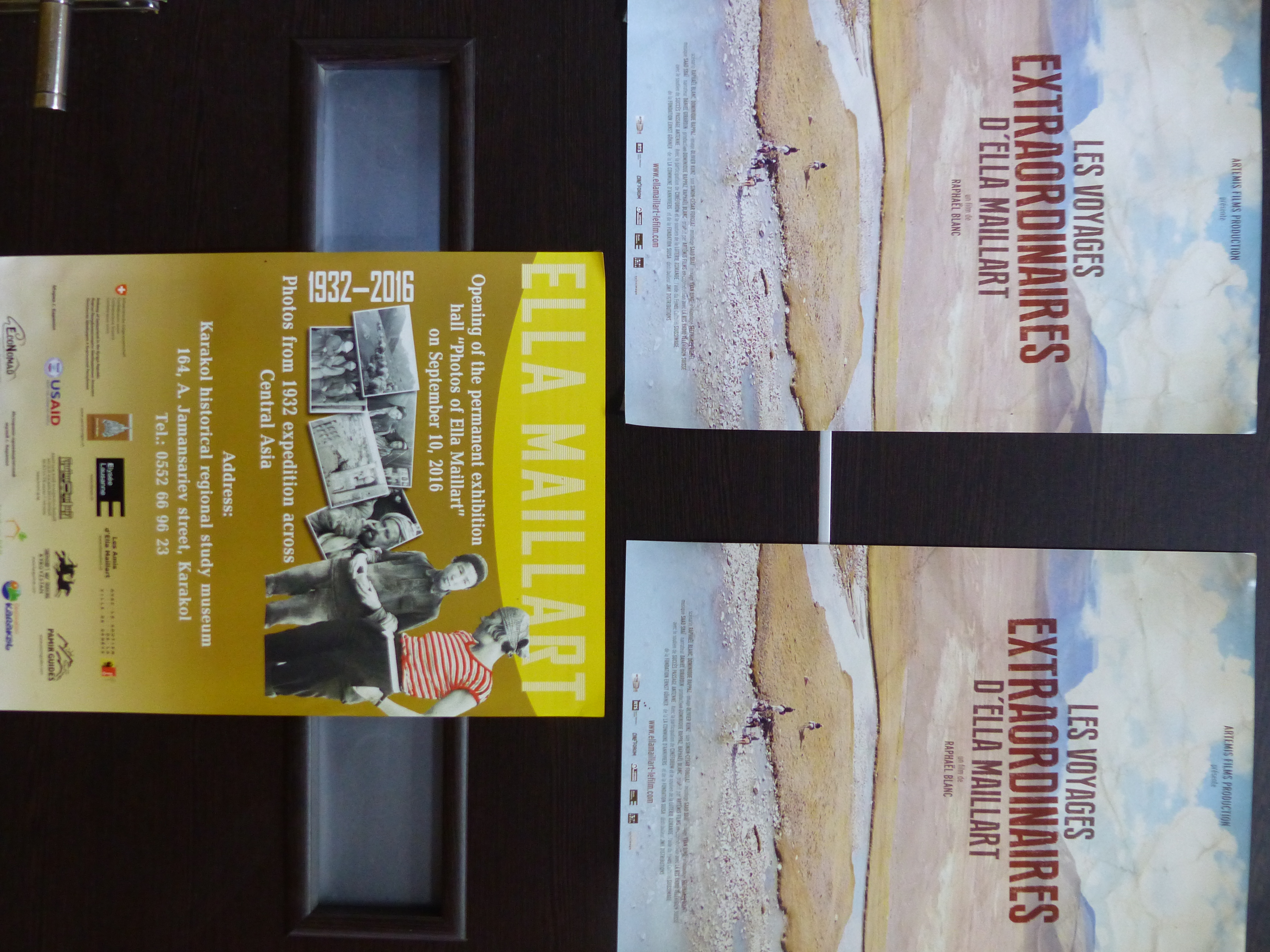 Nous poursuivons notre route pour atteindre en milieu d’après midi la ville de Karakol, environ 40000 habitants, tout à l’Est du pays, et point de départ pour moultes activités sportives dans les montagnes environnantes (il y a notamment une station de ski). Notre premier arrêt sera pour le musée ethnographique local, qui abrite notamment une riche expo de photos d’Ella Maillart, qu’elle a prise au cours de ses excursions dans le coin pendant les années 30 (je ne peux que recommander chaudement la lecture de ses bouquins … une sacrée exploratrice!). Le reste du musée est un peu moins sympa, d’abord parce qu’il est tout en russe ou kirghize, et ensuite parce que, au-dela des objets traditionnels locaux, il comporte principalement des photos des dignitaires locaux depuis une centaine d’année (on a droit à la tête de tous les maires, députés et autres hommes importants – le fait qu’il n’y ait quasiment pas de photos de femmes n’étonnera personne – quelques soient les mérites de ces personnages, voir leur binette sans en apprendre plus que ça ne présente qu’un intérêt limité….). Il y a quand même une salle consacrée à la faune locale, avec plein d’animaux empaillés, dont la fameuse « panthère des neiges », mais aussi le « mouton Marco Polo » (= très grand bouquetin), d’autres bouquetins, un sanglier énorme (presqu’aussi gros que l’ours d’à côté), des marmottes, des rapaces en tout genre (notamment aigles et vautours) …
