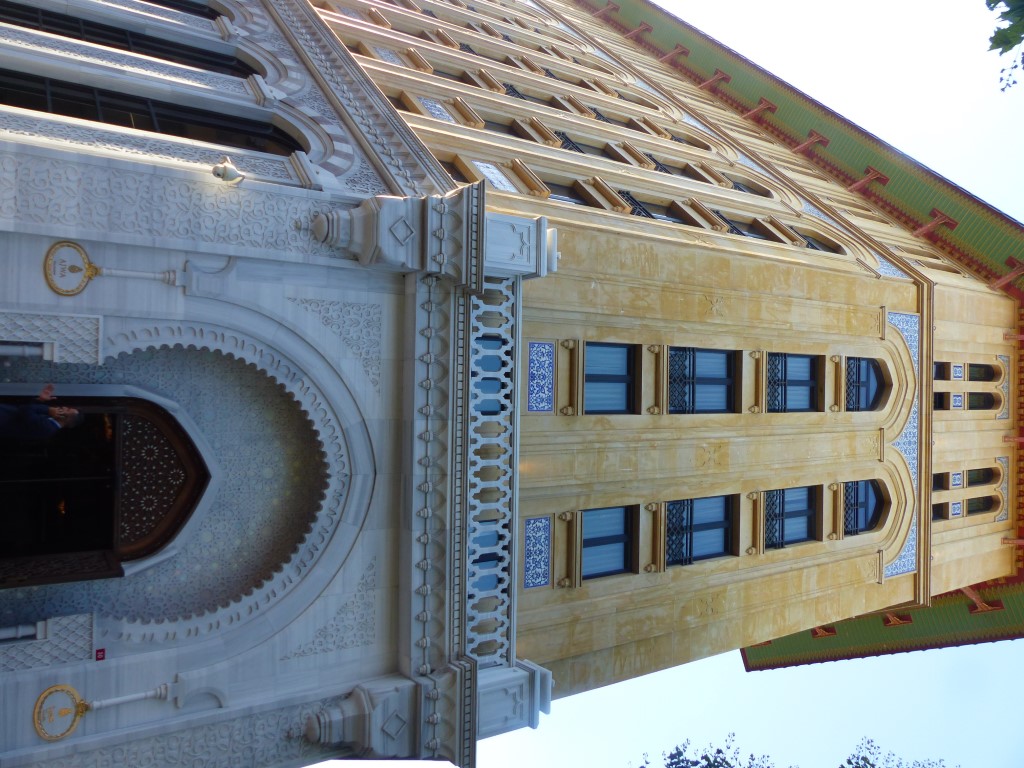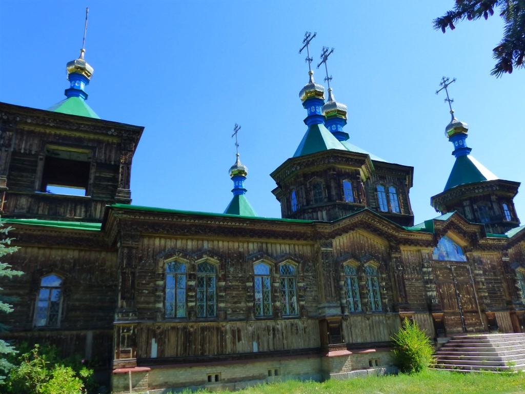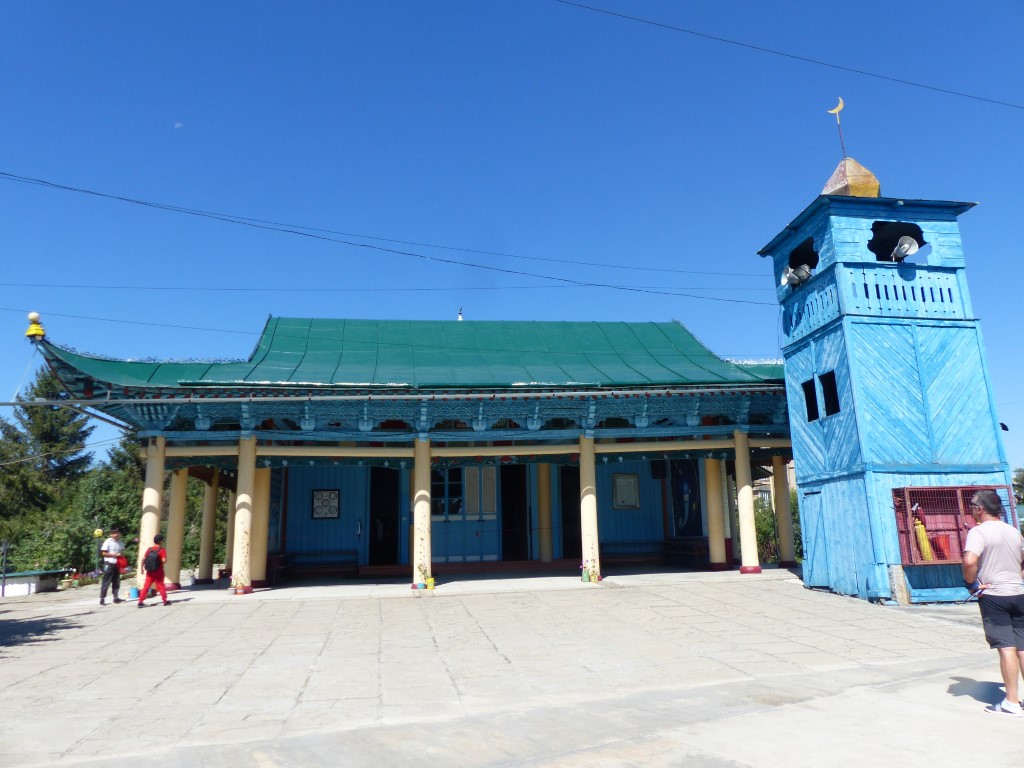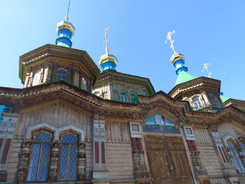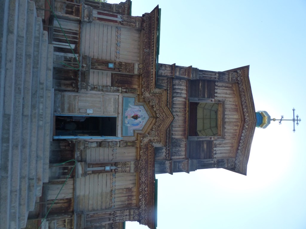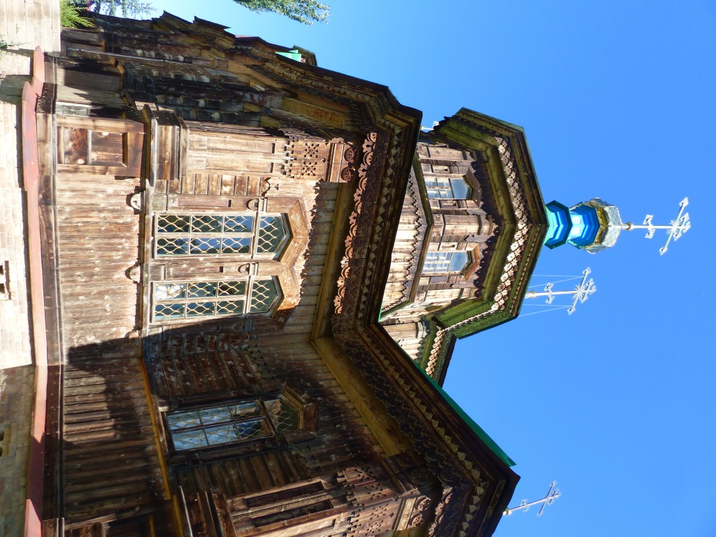 Puis c’est le tour des édifices religieux de la ville : d’abord l’église orthodoxe, datant du 19 ème siècle, toute en bois, avec des toits maintenant verts vifs mais qui étaient à l’origine dorés. On pénètre à l’intérieur (beaucoup de couleurs, des peintures, très claire, aucun siège), puis on se rend compte que va démarrer un enterrement : les gars des pompes funèbres apportent le corps dans un cercueil ouvert, la famille se rassemble, le pope commence la cérémonie en chantant une prière en alternance avec une dame … on s’éclipse sur la pointe des pieds.