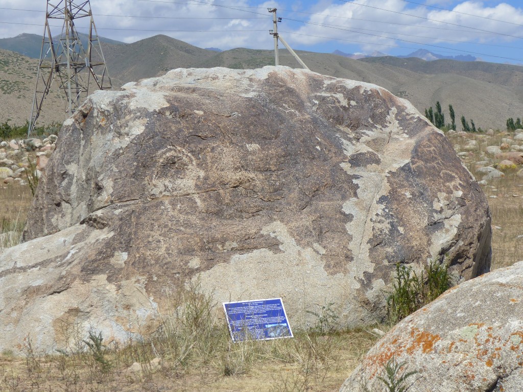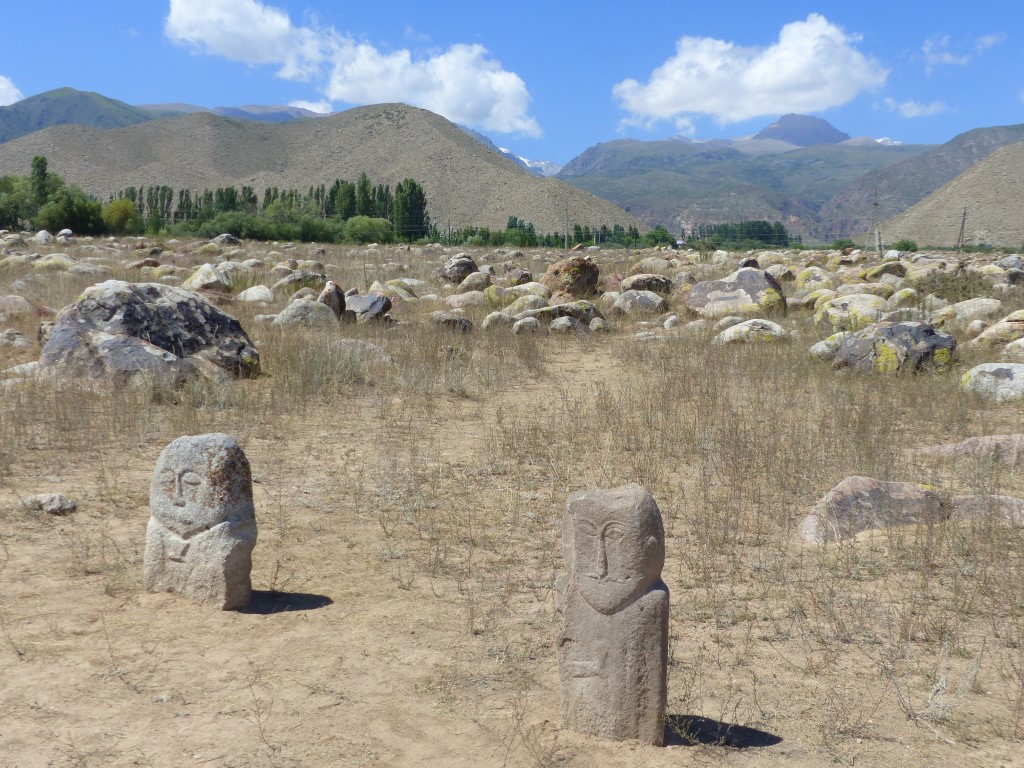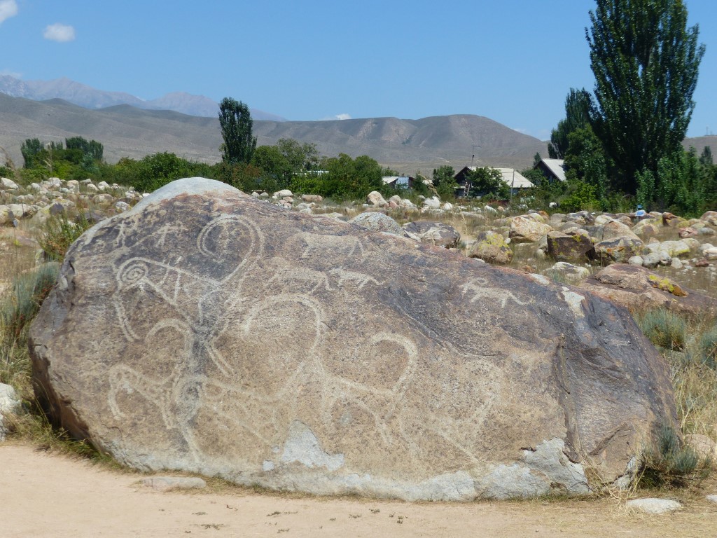 Tout ça ne nous émeut pas, et ne nous empêche pas d’aller visiter le musée à ciel ouvert de pétroglyphes, un peu au dessus de la ville. Outre le fait de découvrir plusieurs scènes de bouquetins, chasseurs, chiens et chameaux, ainsi que des pierres plantées à visage humain (des reproduction miniatures de celles de l’Ile de Pâques, selon Didier), ce musée présente l’avantage d’offrir une magnifique vue sur le lac bordé par les montagnes enneigées de l’autre côté, à une quinzaine de kilomètres au sud.