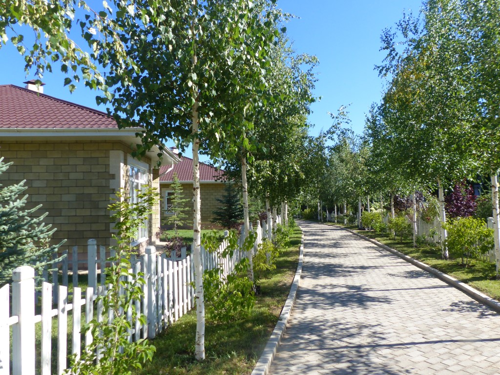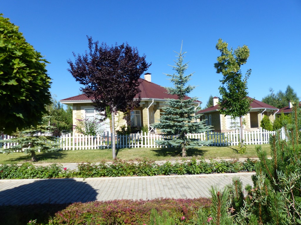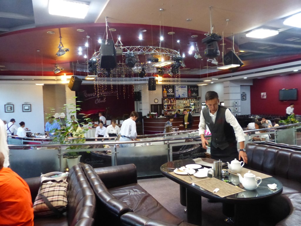 Nous gagnons ensuite notre hébergement du soir, qui se trouve être dans une immense « resort » 5 étoiles en bordure de lac. C’est en fait un domaine privé comprenant plusieurs petits immeubles (donc celui qui abrite nos chambres), mais aussi des centaines de villas avec jardins très très bien entretenus et arborés, des terrains de sport, une piscine intérieure, une piscine extérieure, un centre de cure thermale, des restaurants, et tout un tas d’équipements balnéaires en bordure de lac. On met un peu de temps à trouver notre immeuble, surtout que des voitures avec « plaque diplomatique » stationnent dans chaque allée … certainement encore une conséquence du sommet économique des pays en stan …