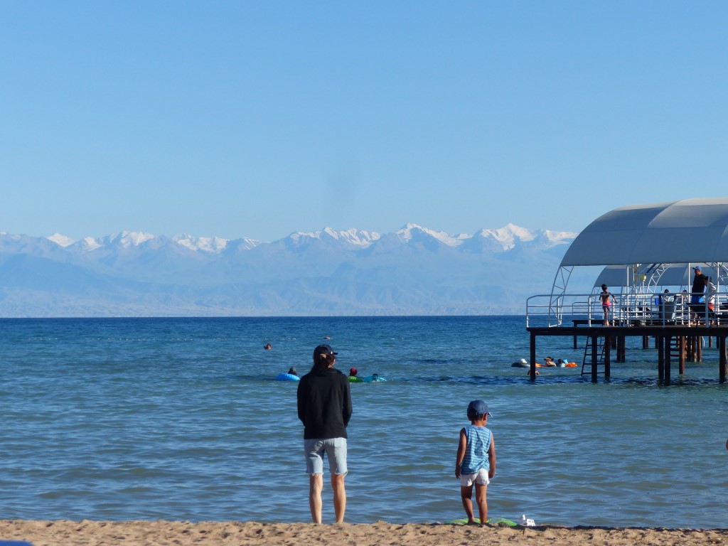 Bref, aujourd’hui, on profite de cet environnement magnifique et, après un petit temps de repos dans nos chambres (qui permet à Oulan et Altimbeck de rejoindre leur guesthouse), on rejoint la plage, non sans avoir « pris une claque » devant la vue sur les montagnes enneigées qui semblent dominer le lac, de l’autre côté. C’est magique !