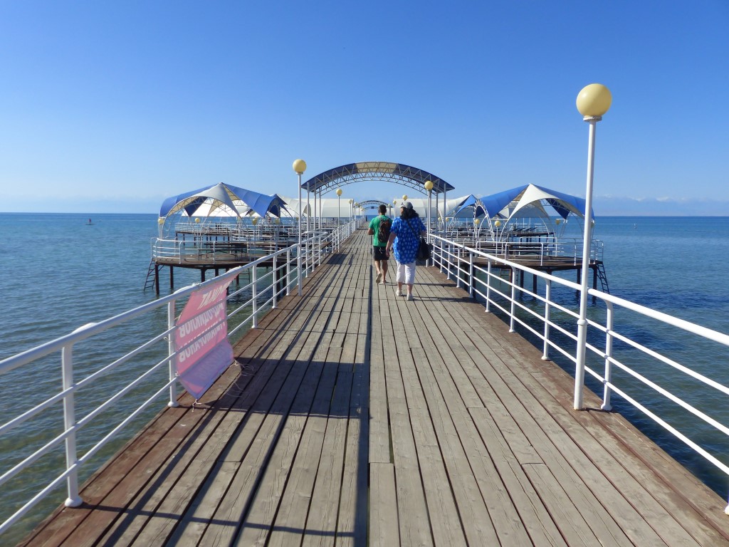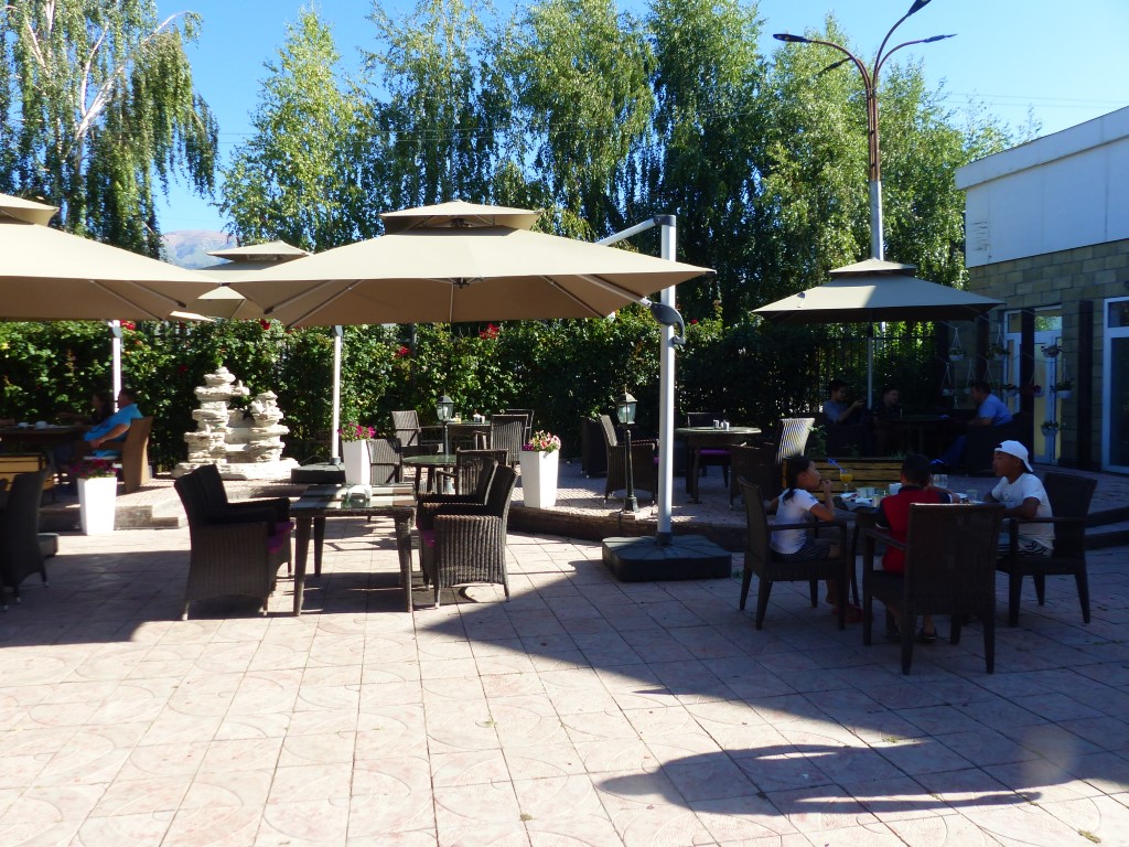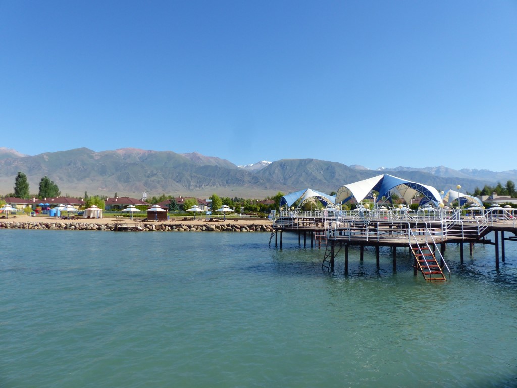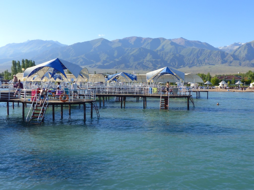 L’eau est chaude, le temps est idéal, il y a plein de transat en bois, il y a même des pontons (eux aussi équipés de transat, tables, parasols) qui permettent de s’avancer dans le lac sans subir les abords pleins de galets. Bref, on passe un très agréable moment, avant de rejoindre notre restau du soir (comme à midi dans le centre de Cholton Ata). Pour ce soir ce sera une chaine « Pizza » (bon, il y a aussi plein d’autres trucs et notamment kirghizes, mais Oulan et Altimbeck se laissent tenter par la pizza ce soir). C’est blindé, plein de touristes, de gamins, de musique, mais surtout de sirènes hurlantes des voitures de police juste de l’autre côté du mur du restau. Le bruit est assourdissant !