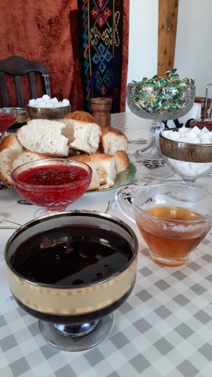 Très bon petit déjeuner sous la yourte dans le jardin de la maison d’hôtes Shepered's way trekking. C’est certainement le meilleur du séjour. Tout est fait maison = les confitures d’abricot et de cassis, le pain, le gâteau à l’abricot …