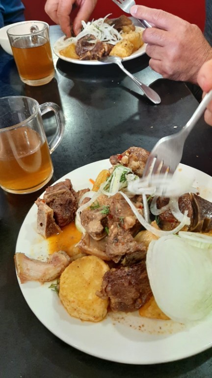 Nous déjeunons dans un restaurant sur le bord de la route. Surprise, il n'y a pas de couteaux parmi les couverts. Et pourtant, il y a de la viande dans tous les plats (Chris a bien du mal à trouver un plat sans). Ici, on mange facilement avec les mains, pas besoin de couteau !