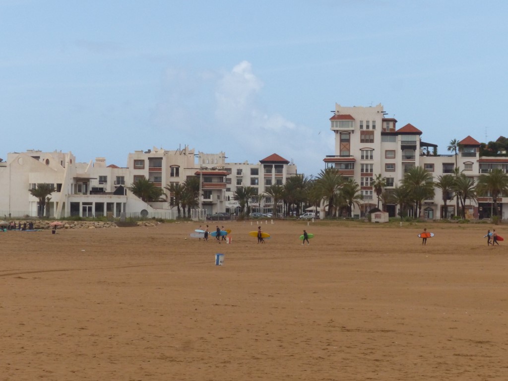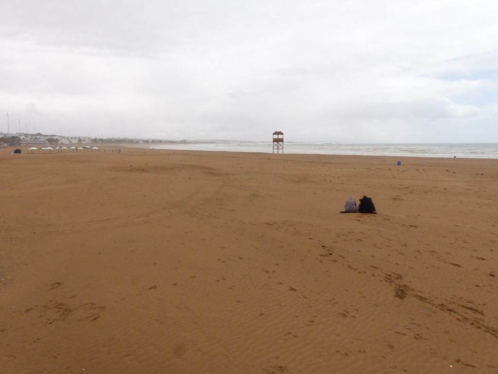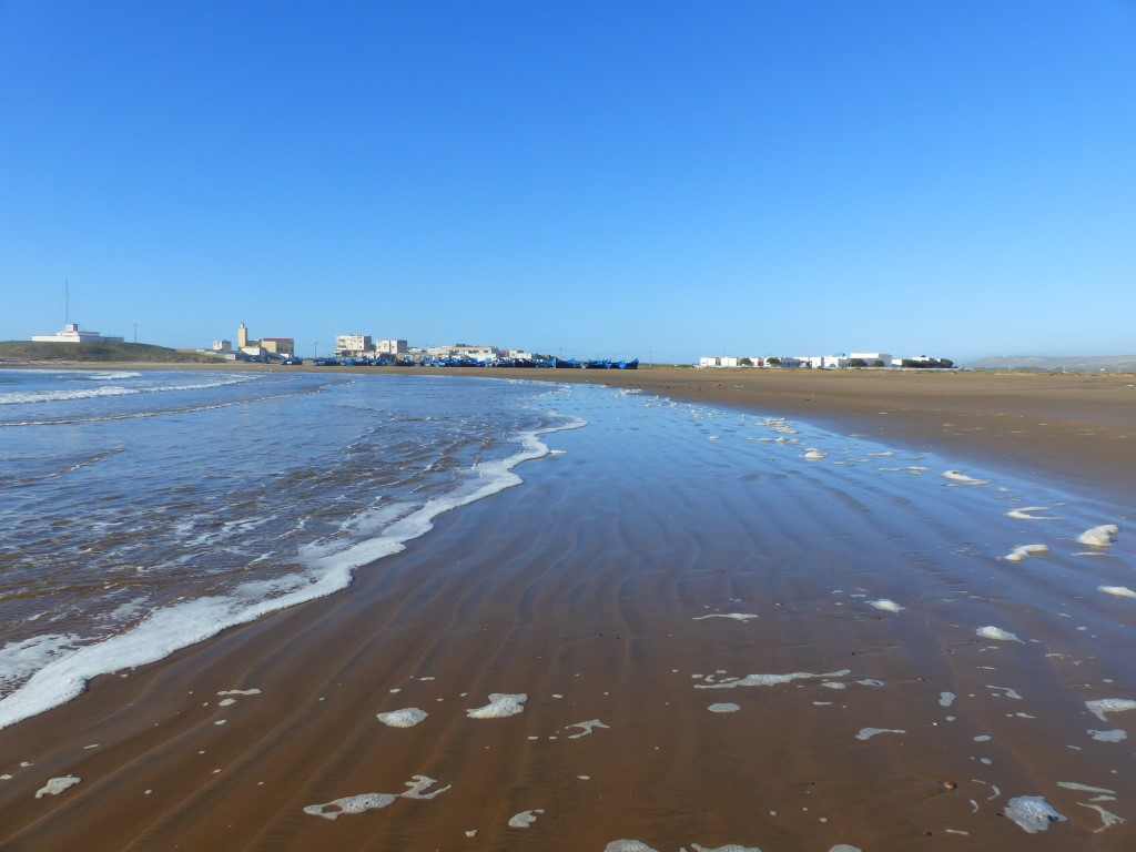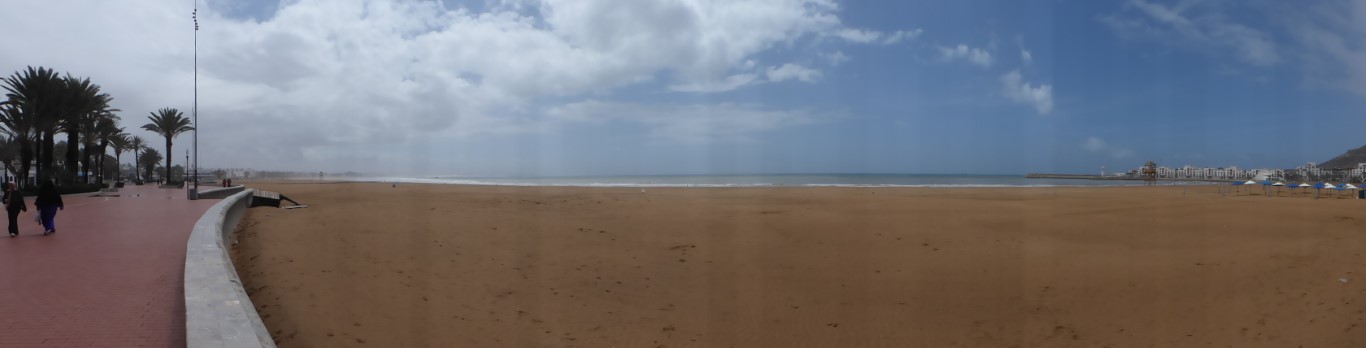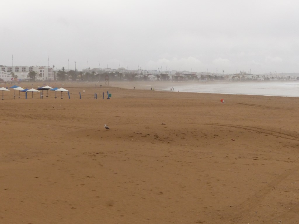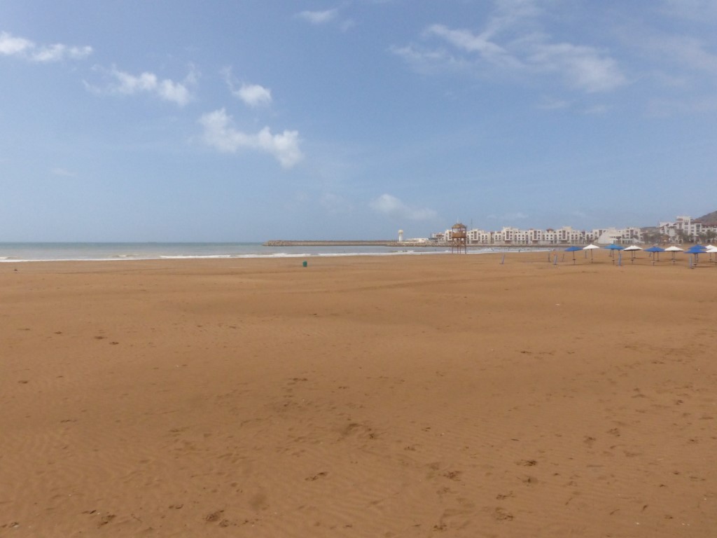 Lorsque nous atteignons Agadir, le beau temps est là. La plage est incroyablement longue et quasi vide. Je crois qu’il n’est pas conseillé de se baigner en raison des courants forts.