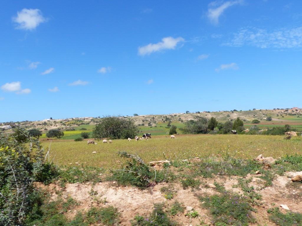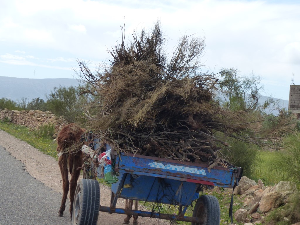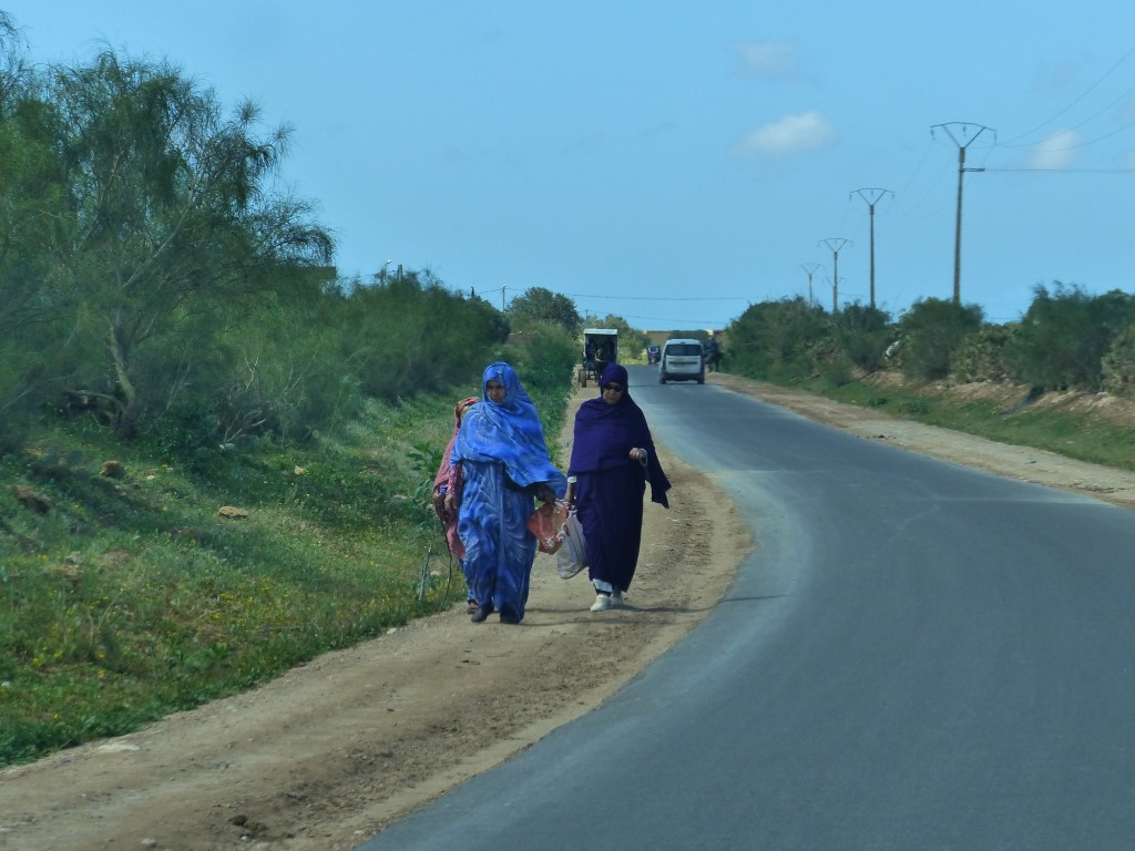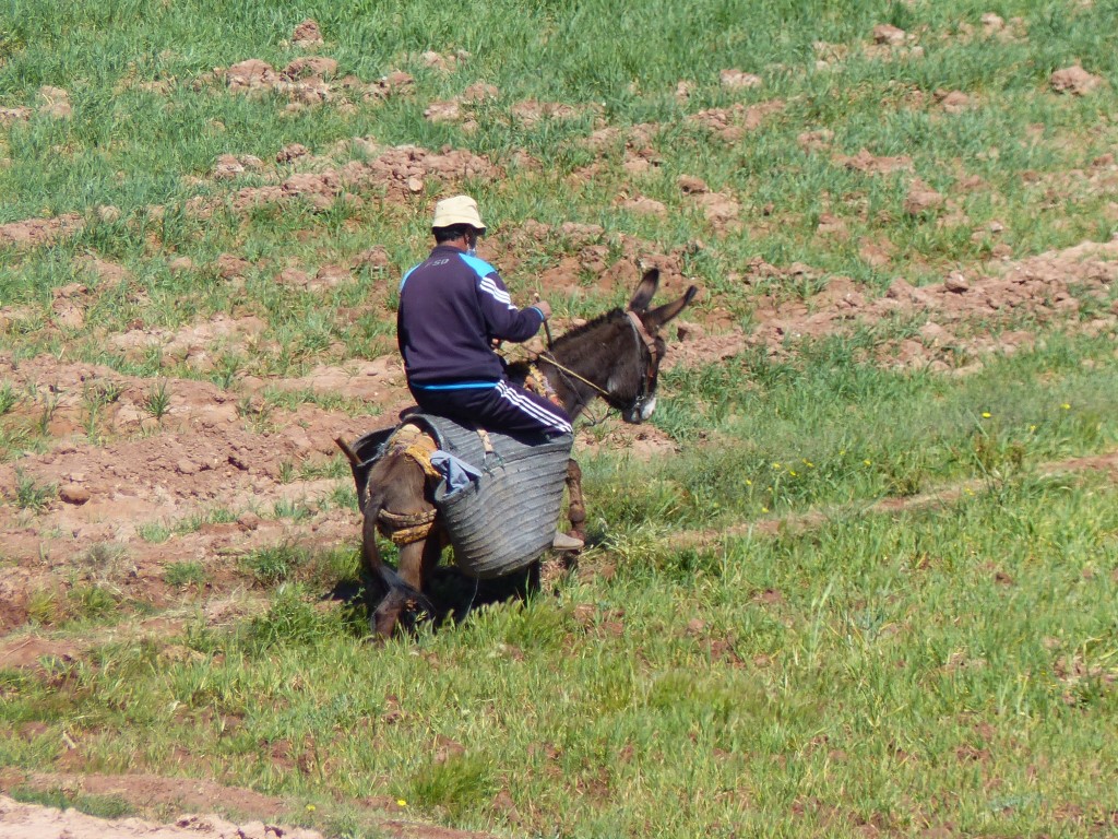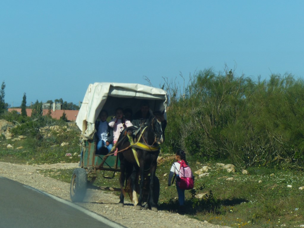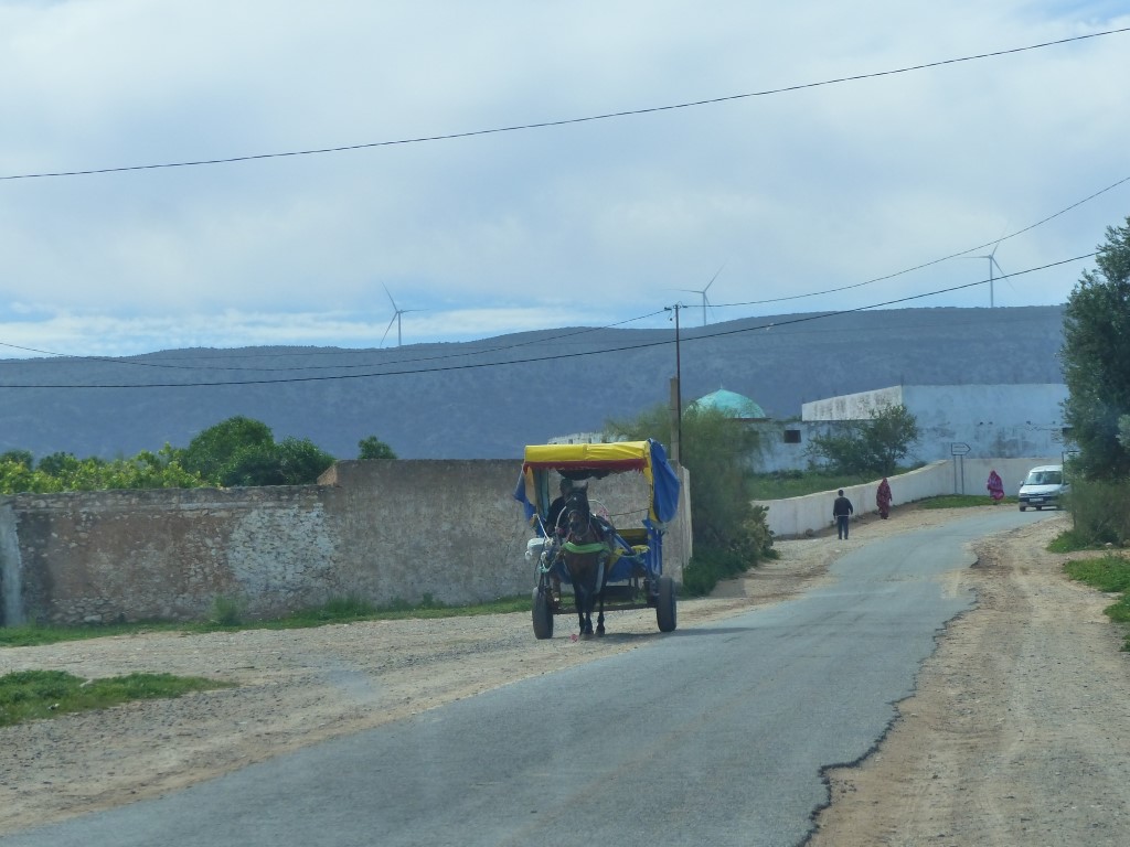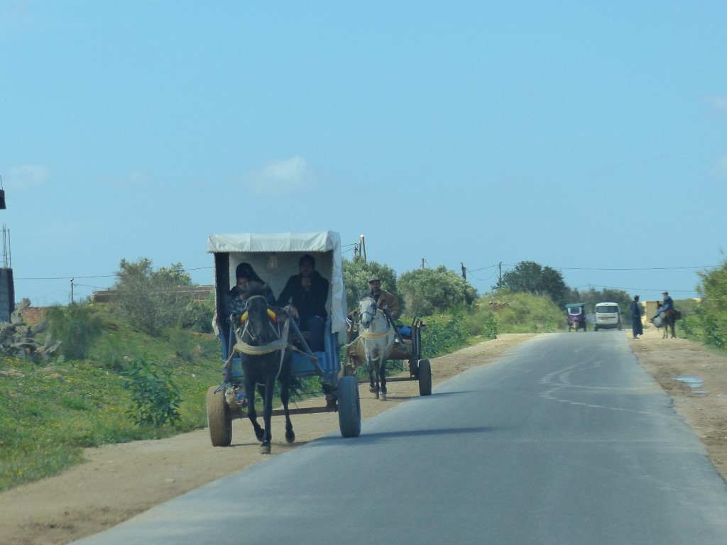 Nous prenons dans les terres et découvrons un Maroc « profond » ; beaucoup de carrioles tirées par des chevaux, une campagne verte de cultures diverses, des routes en terre battue, des gens qui marchent le long des chemins ou qui attendent un transport collectif (dit transport « mixte ») ou un taxi. Nous nous ravitaillons dans un village, ou nous devons être les seuls touristes. Christèle en profite pour faire des photos avec les boulangers, le vendeur de fruits, pas de problème de droit à l’image ici.