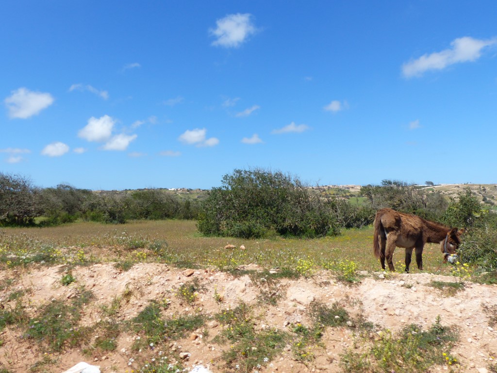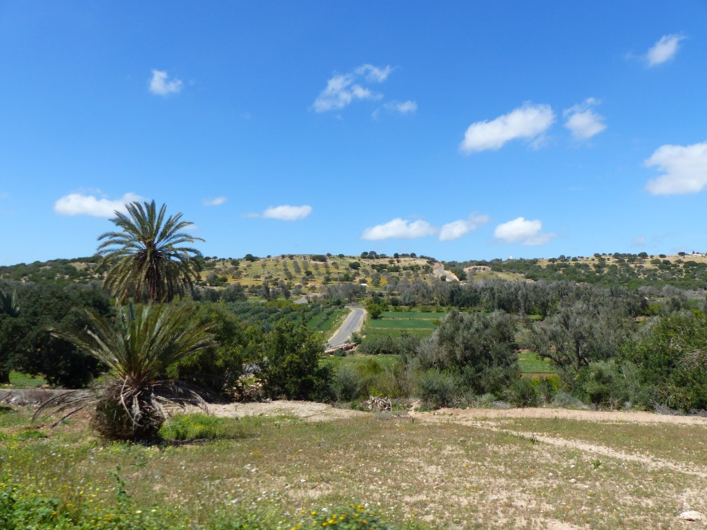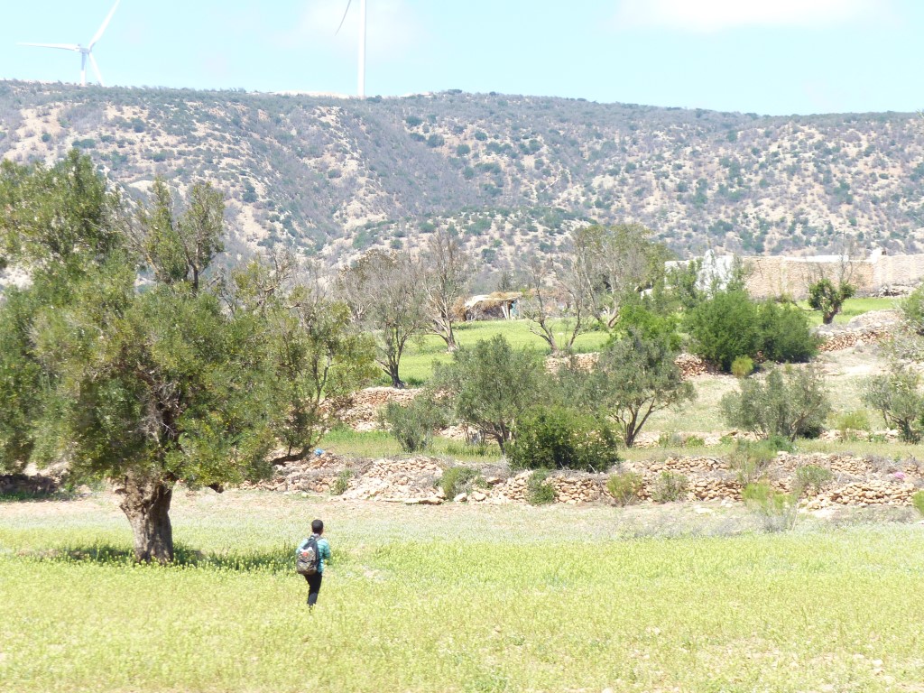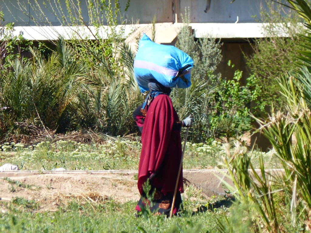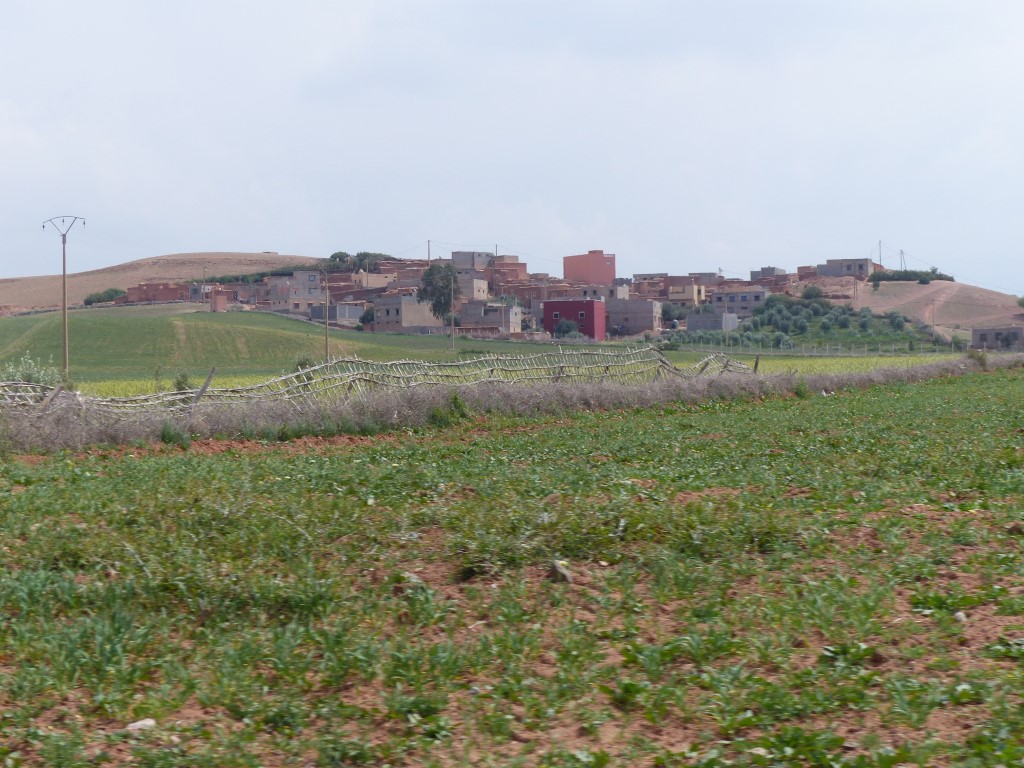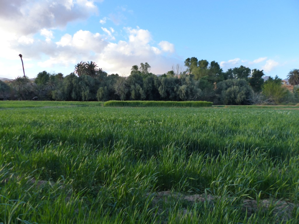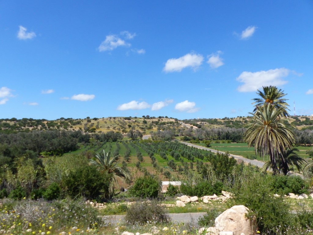Nous prenons dans les terres et découvrons un Maroc « profond » ; beaucoup de carrioles tirées par des chevaux, une campagne verte de cultures diverses, des routes en terre battue, des gens qui marchent le long des chemins ou qui attendent un transport collectif (dit transport « mixte ») ou un taxi. Nous nous ravitaillons dans un village, ou nous devons être les seuls touristes. Christèle en profite pour faire des photos avec les boulangers, le vendeur de fruits, pas de problème de droit à l’image ici.