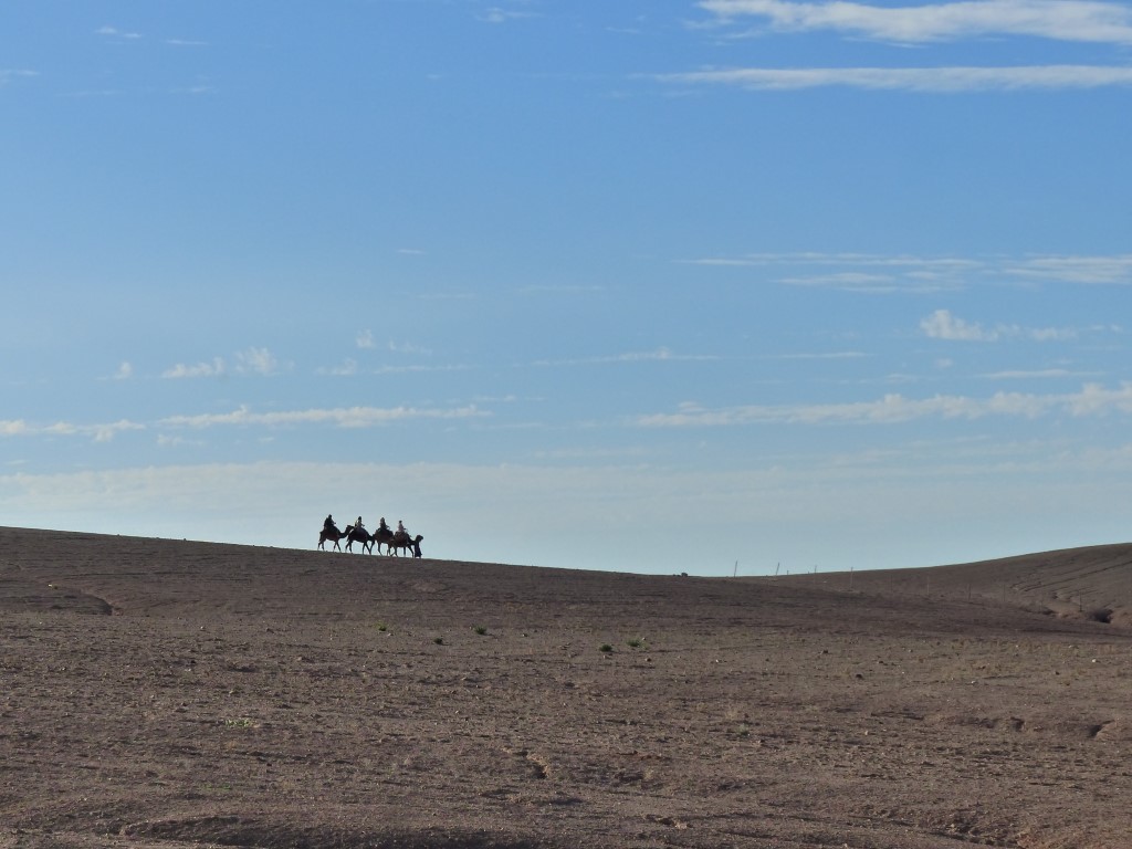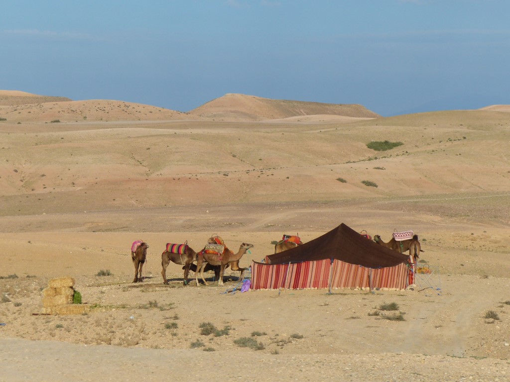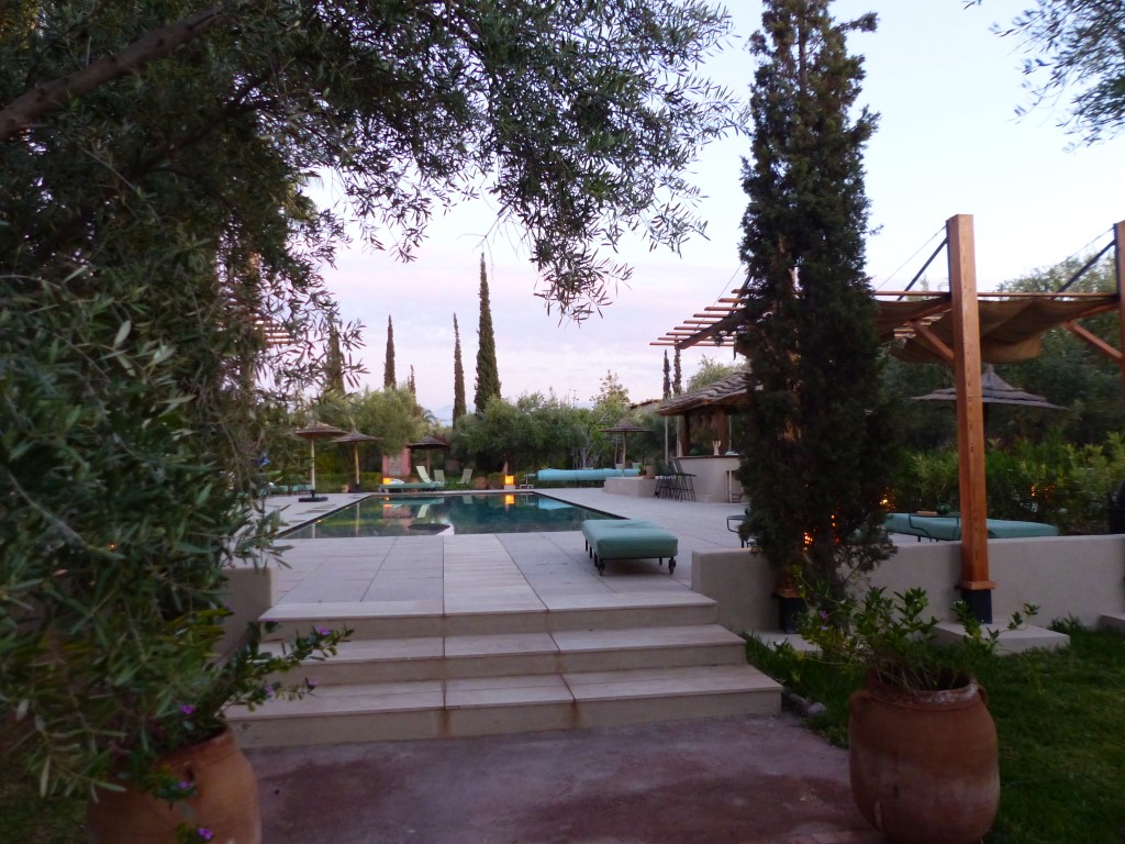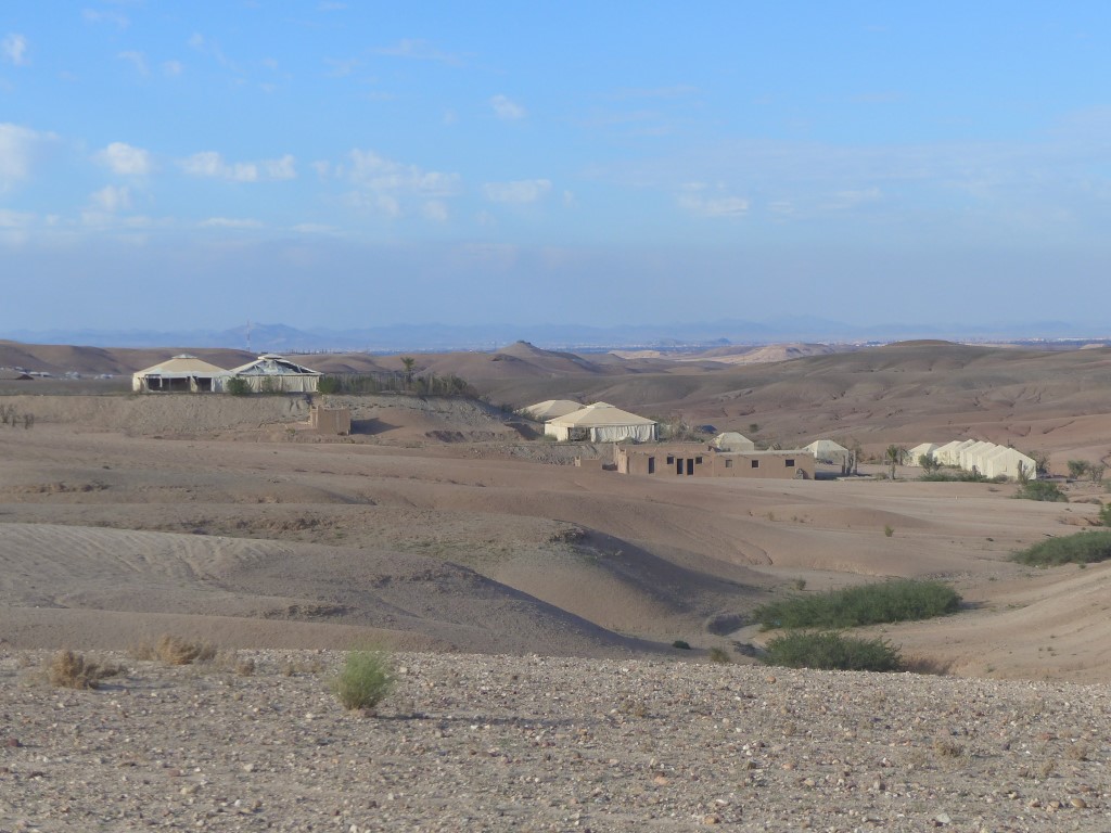 Arrivé à Agafay, c’est l’effervescence. La route en mauvais état est saturée de voitures. Chacun cherche à rejoindre son campement, duquel il pourra s’adonner à une sortie quad ou dromadaire. C’est impressionnant comme ce petit coin de désert est exploité par le tourisme. N’ayant pas réservé, nous ne trouvons pas de tente pour nous accueillir. Nous faisons donc demi-tour et reprenons la route vers Marrakech. Sur la route, les hébergements Google Maps sont pour l’essentiel introuvables ou alors n’ont pas d’enseigne. Nous atteignons le « domaine de Tam » à Tamslohte. Je crois que nous baignons une nouvelle fois dans le luxe pour touristes.