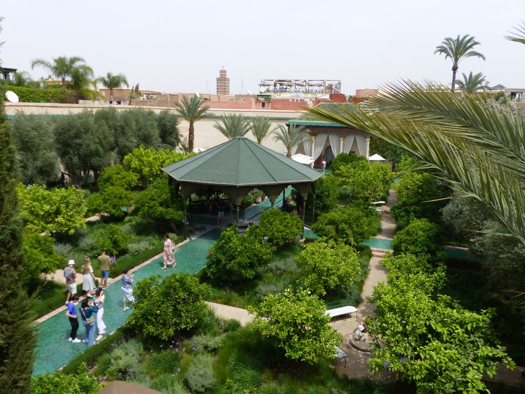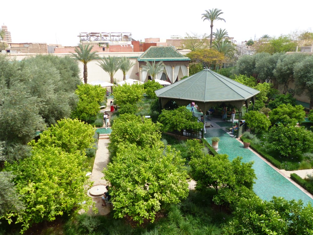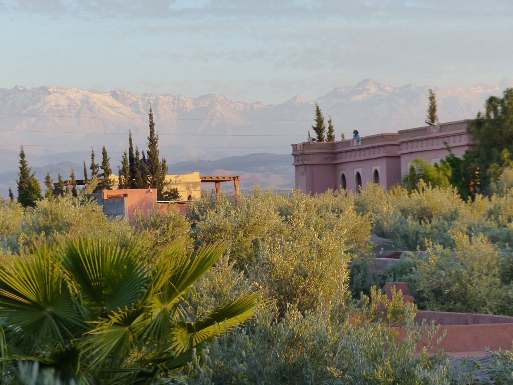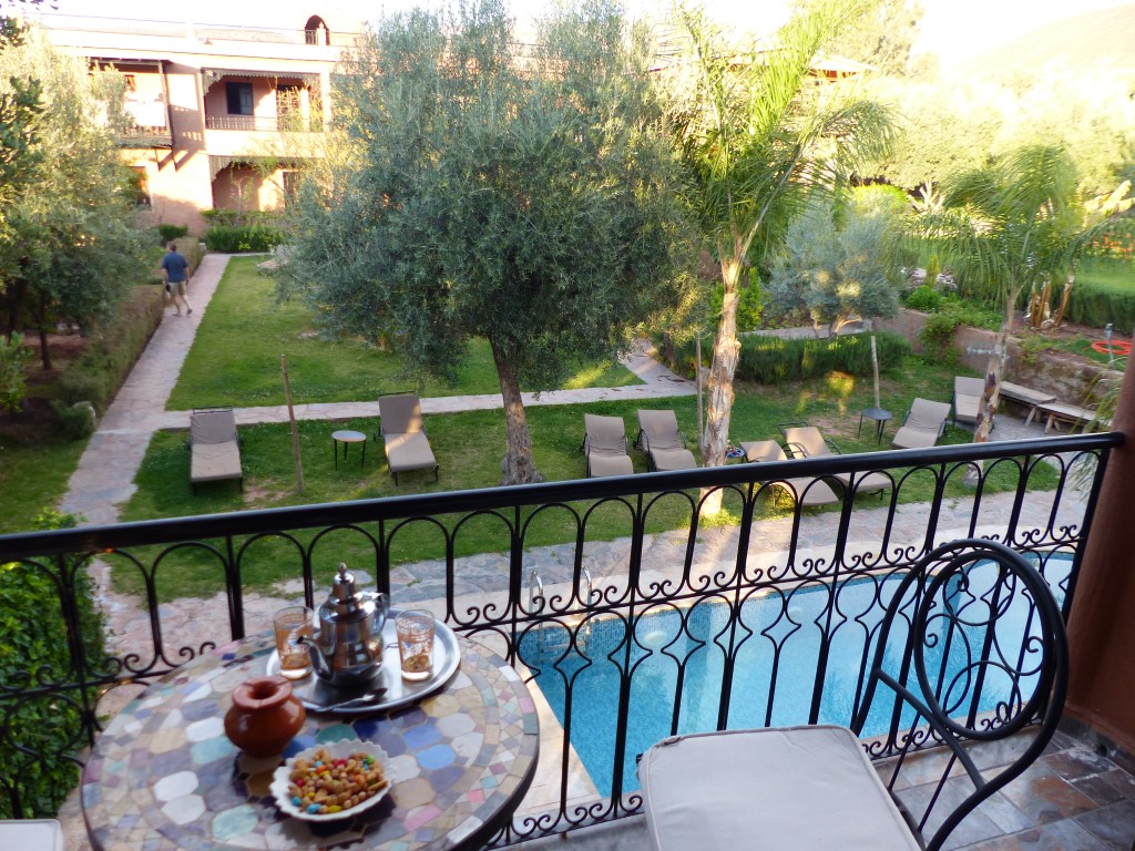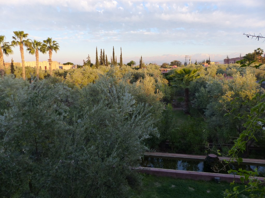 Nous avons dîner en intérieur hier soir, mais ce matin, le petit déjeuner est servi dans le jardin. Les températures ont bien augmentées, il fait déjà chaud au soleil, et il est annoncé une journée à 33°C à Marrakech. Nous ne sommes dons pas pressés de rejoindre la grande ville. Cette dernière est à 45 – 50 Km de distance.