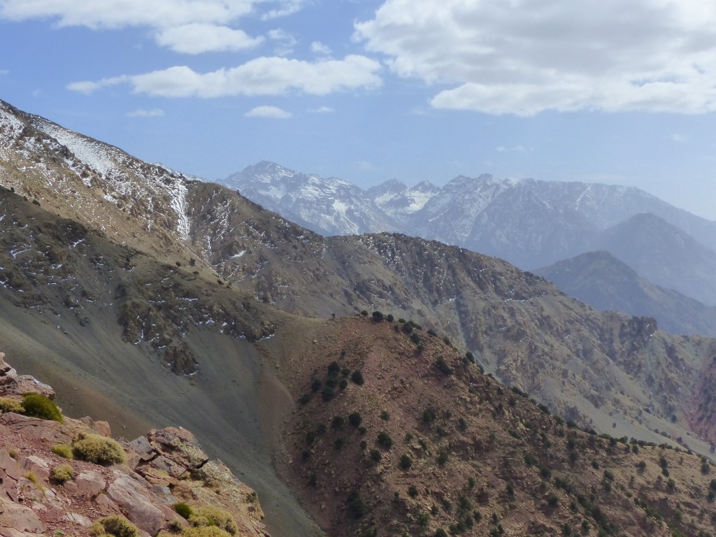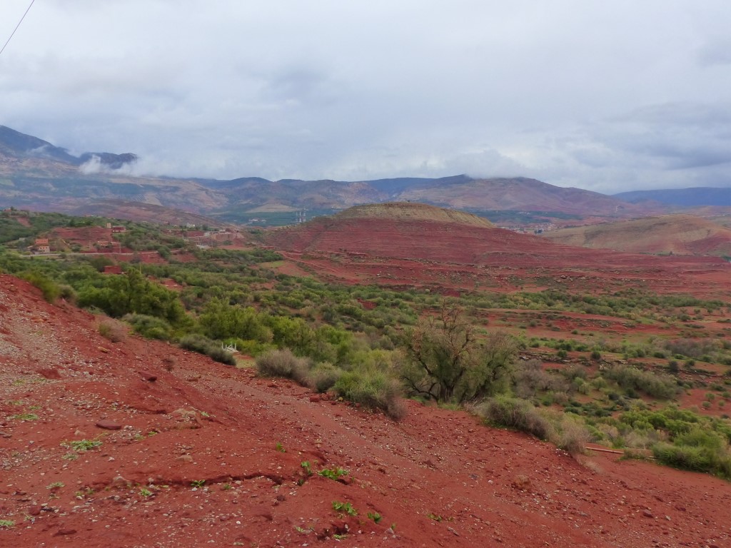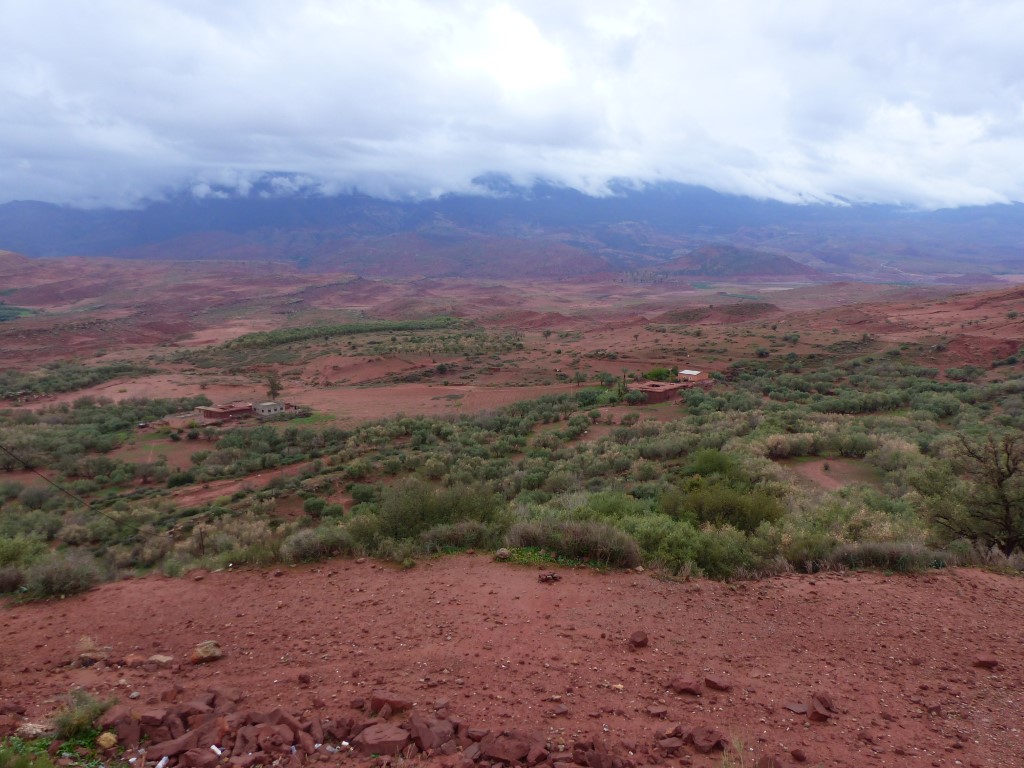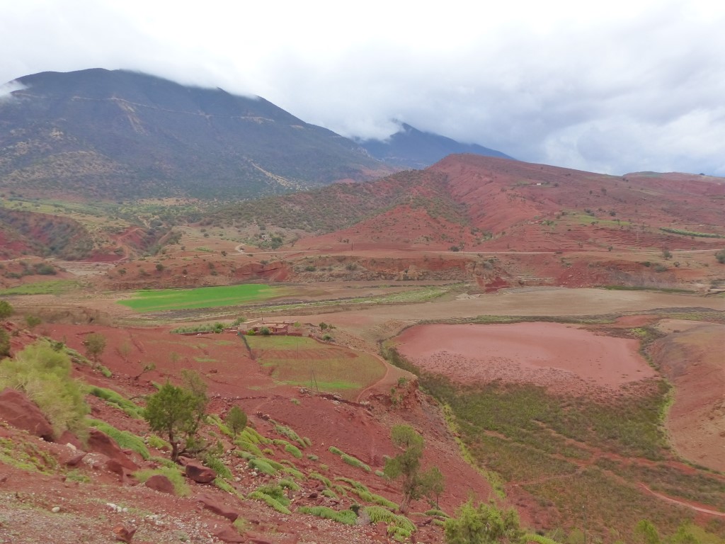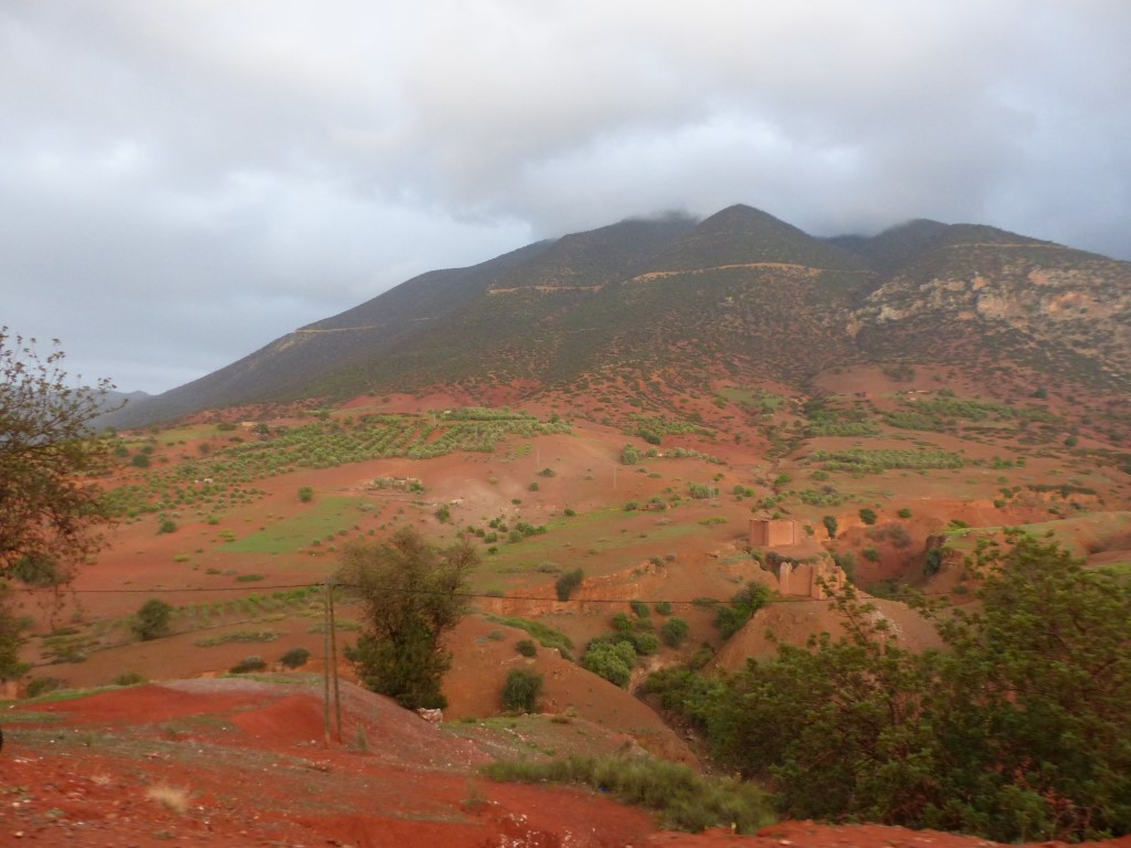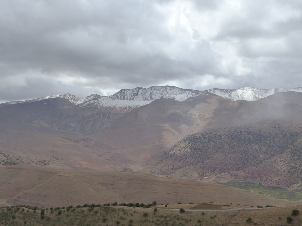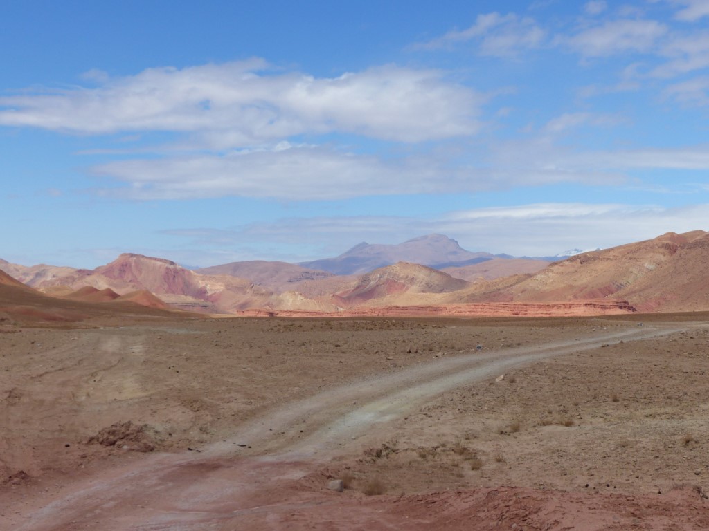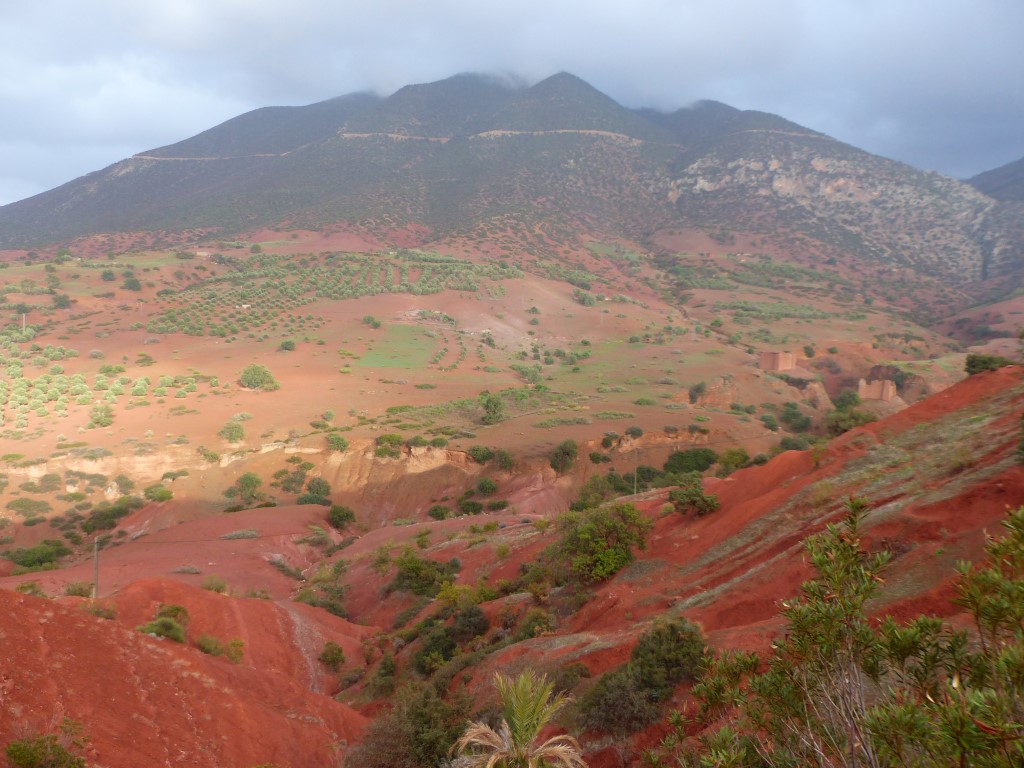 Chemin faisant nous retrouvons la terre rouge de l'Atlas. Le Toubkal, plus haut sommet du Maroc à 4167m, nous domine et porte des traces de l'enneigement récent.