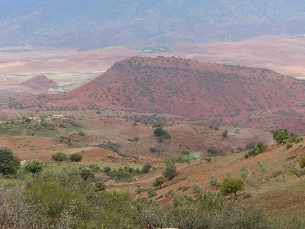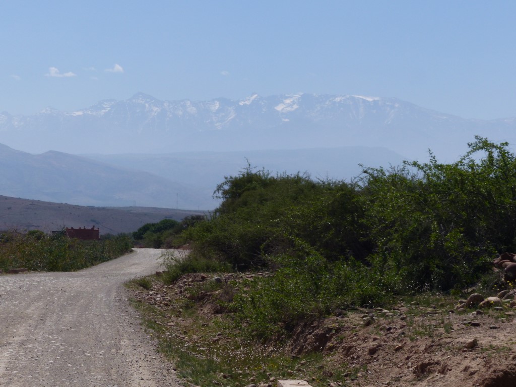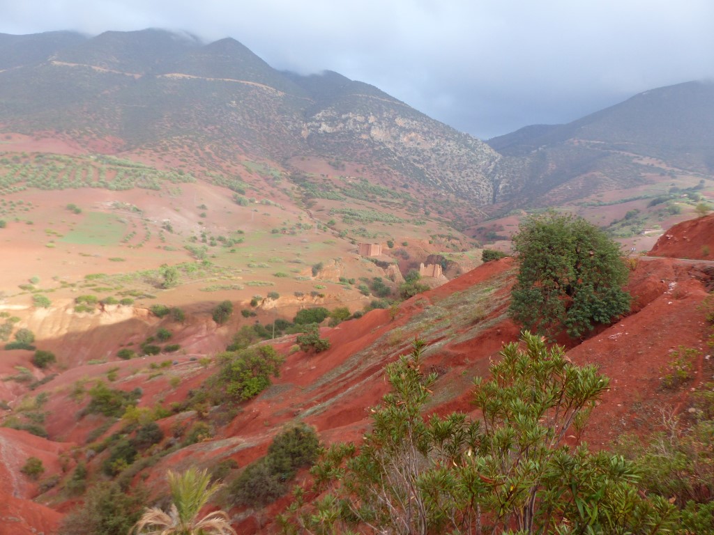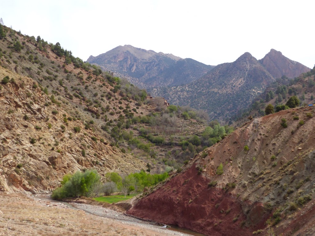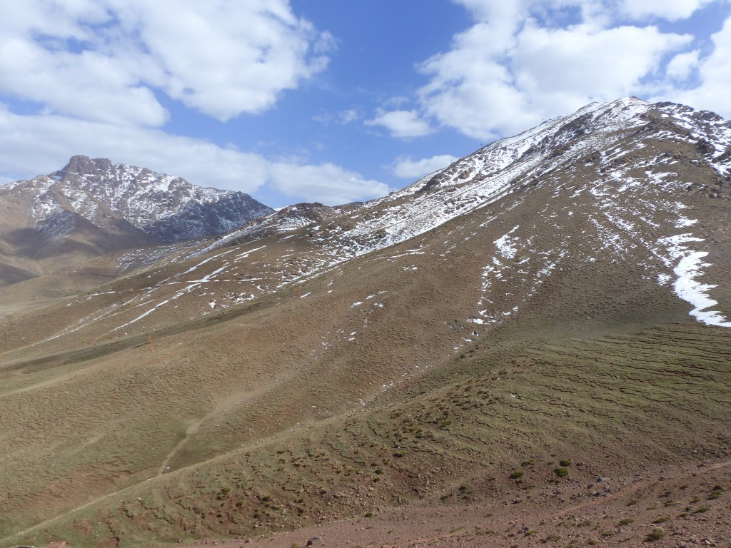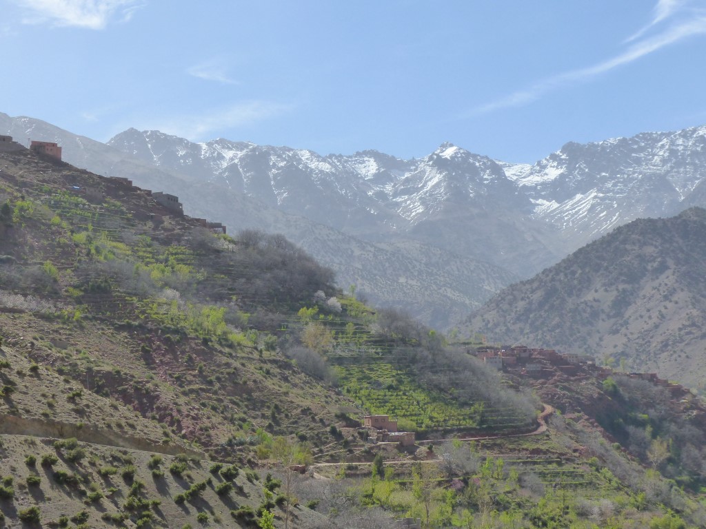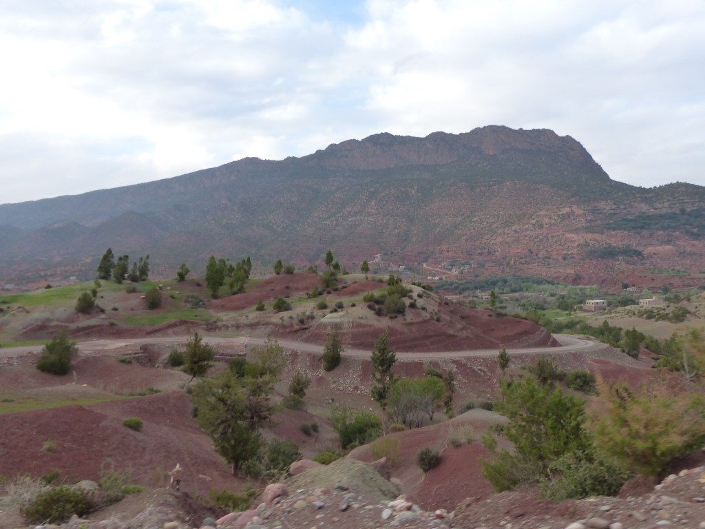 Chemin faisant nous retrouvons la terre rouge de l'Atlas. Le Toubkal, plus haut sommet du Maroc à 4167m, nous domine et porte des traces de l'enneigement récent.