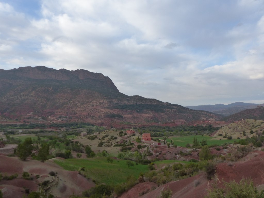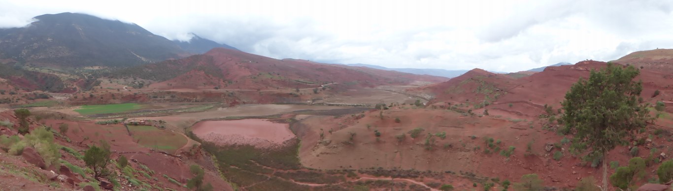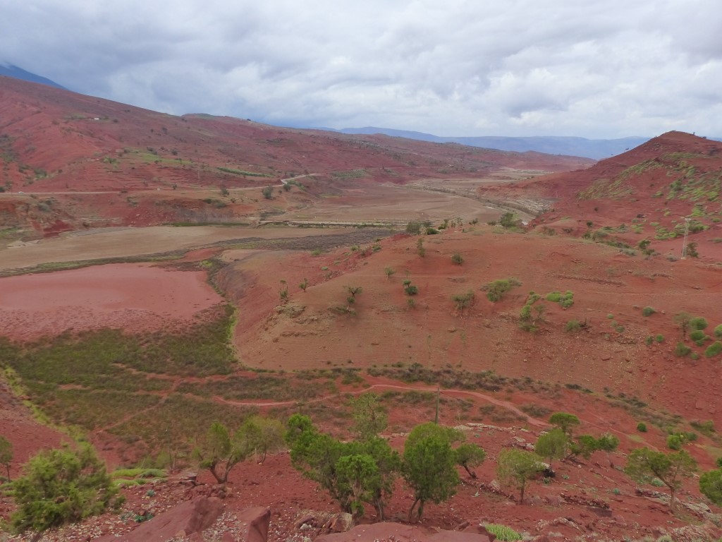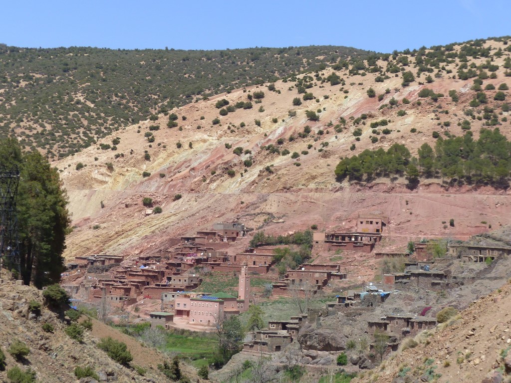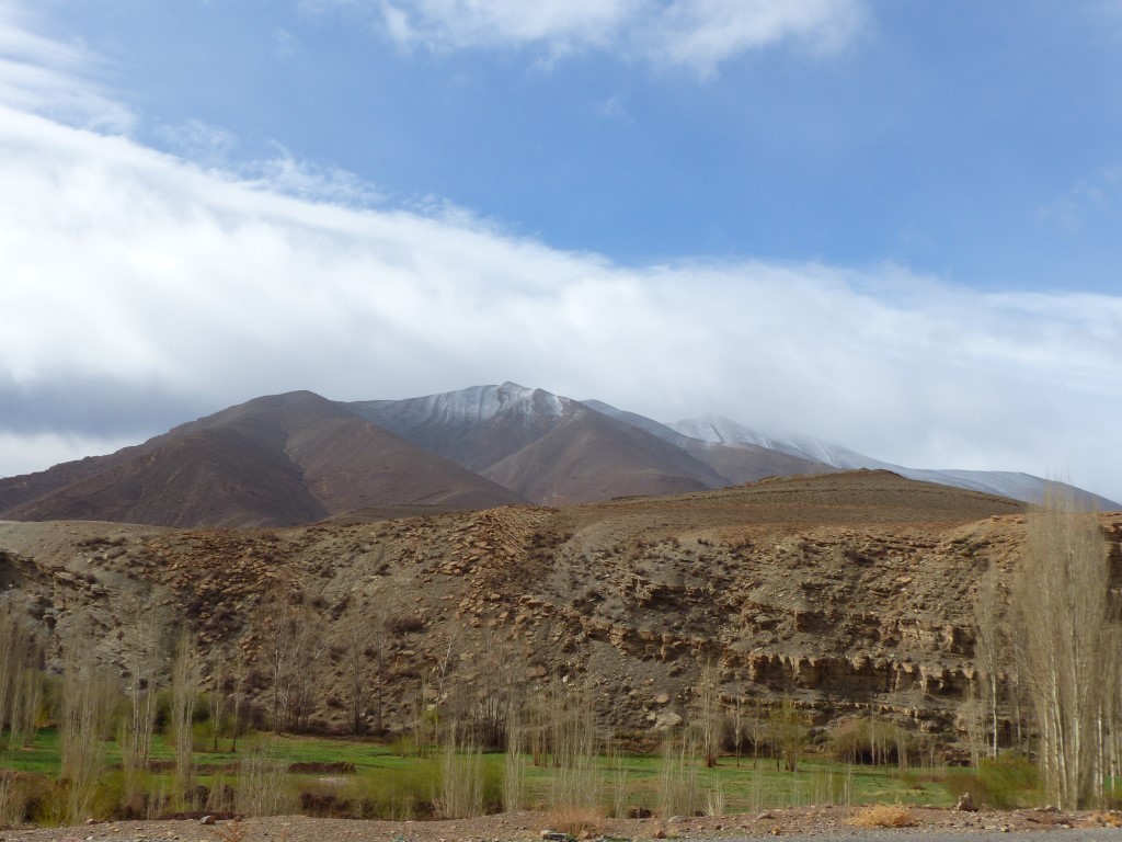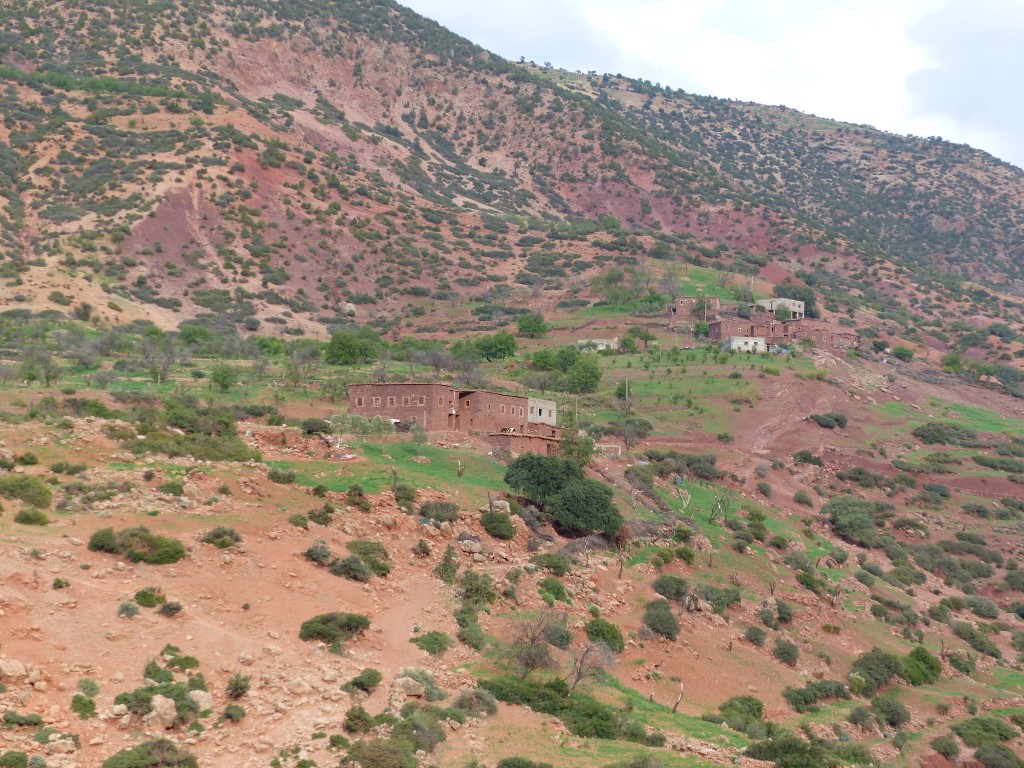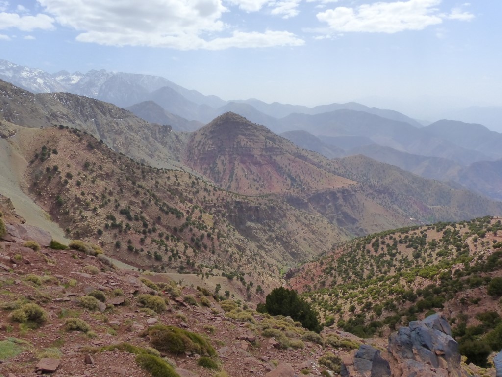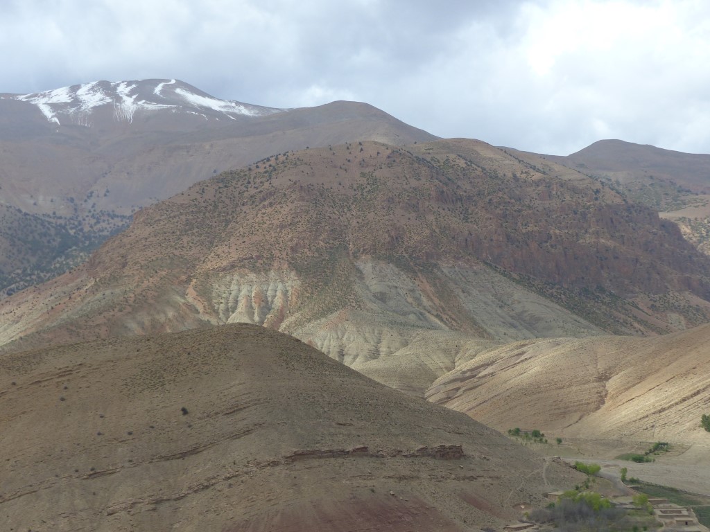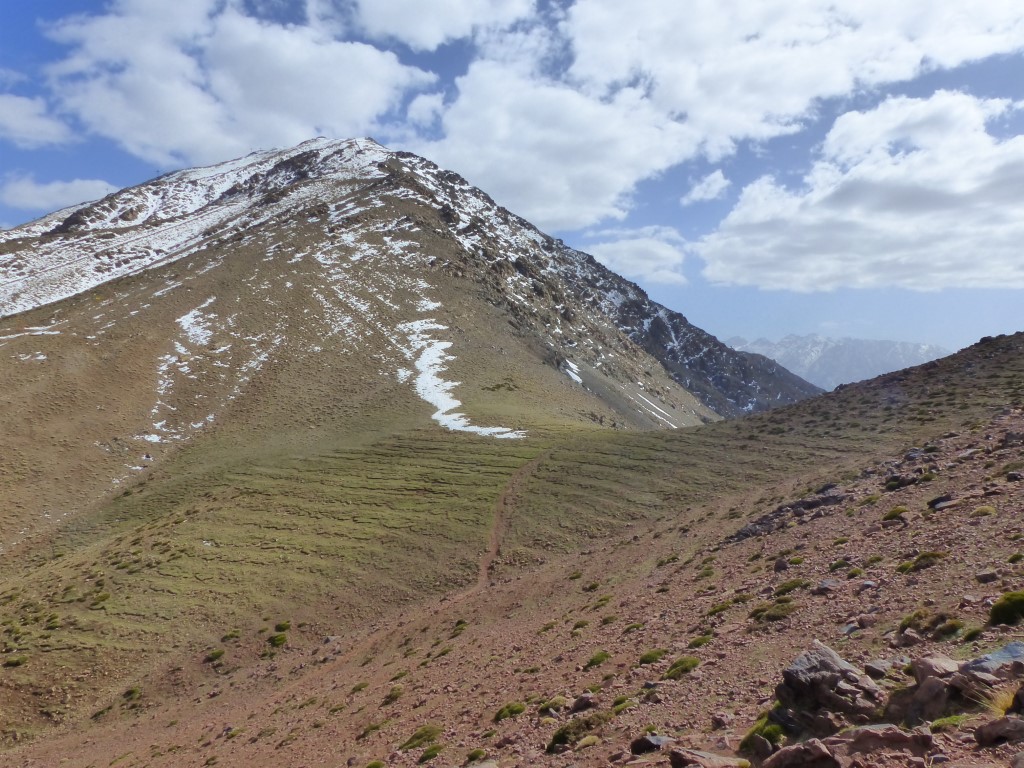 Chemin faisant nous retrouvons la terre rouge de l'Atlas. Le Toubkal, plus haut sommet du Maroc à 4167m, nous domine et porte des traces de l'enneigement récent.
