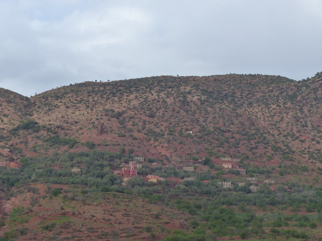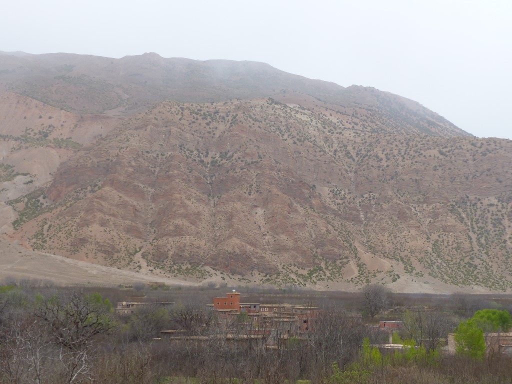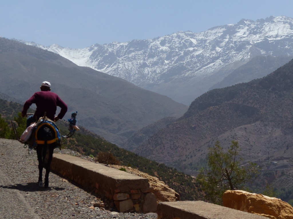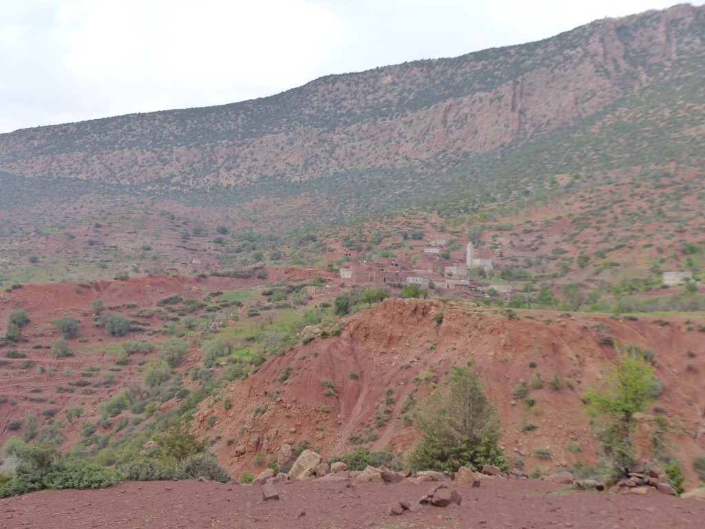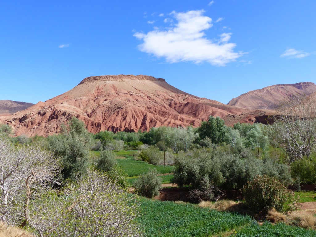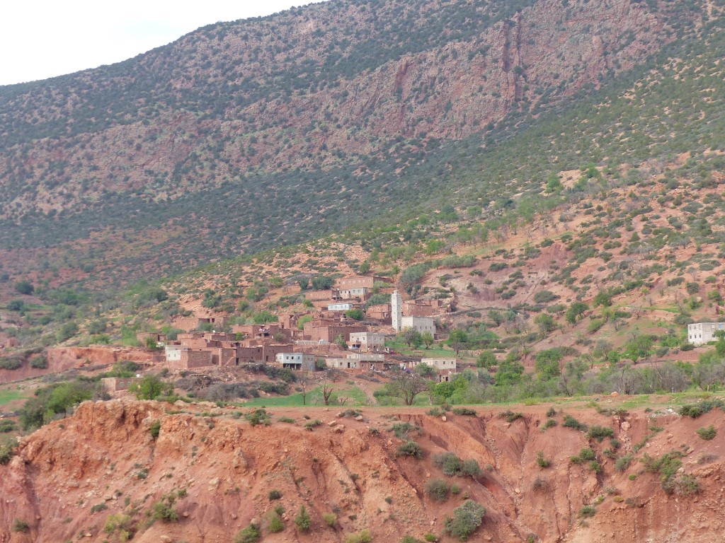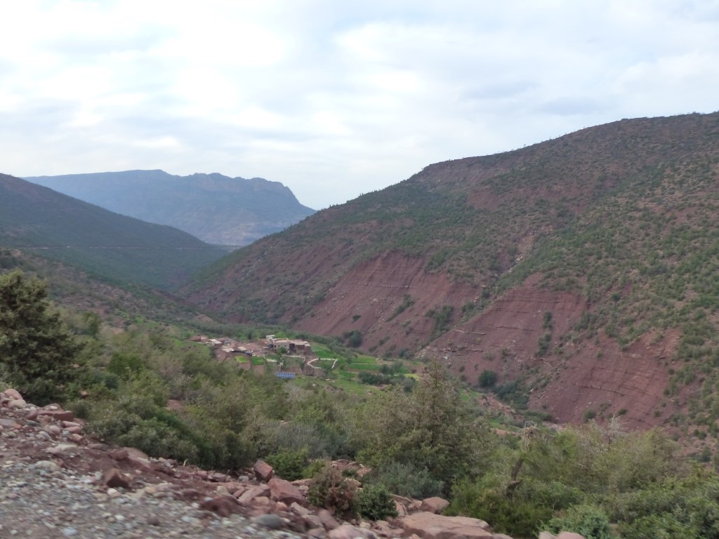 Chemin faisant nous retrouvons la terre rouge de l'Atlas. Le Toubkal, plus haut sommet du Maroc à 4167m, nous domine et porte des traces de l'enneigement récent.
