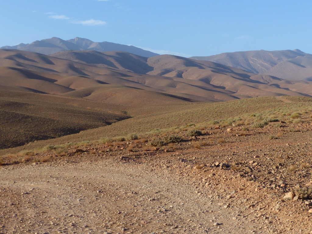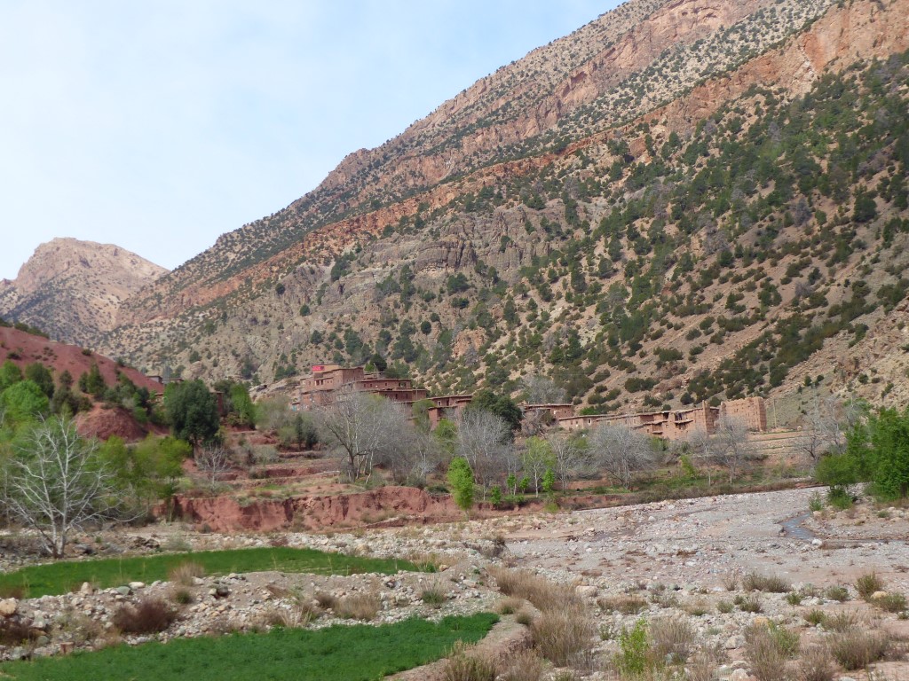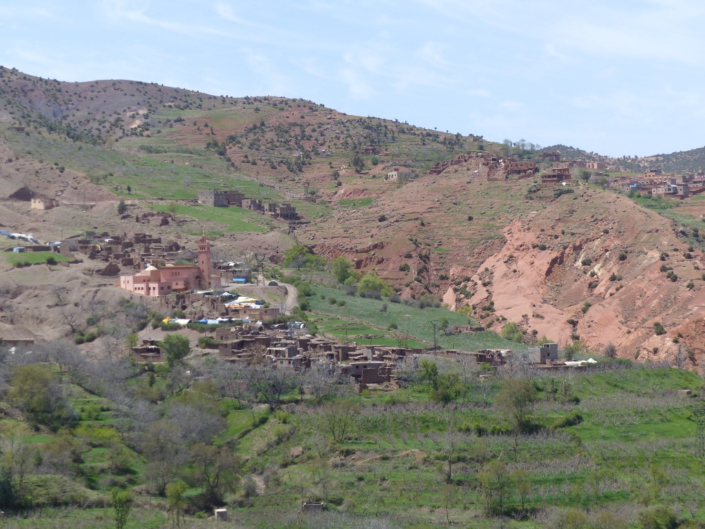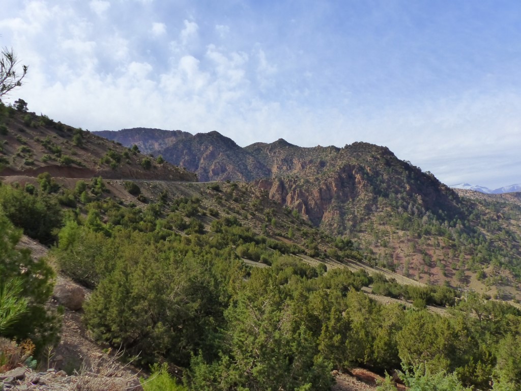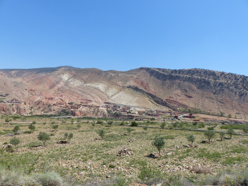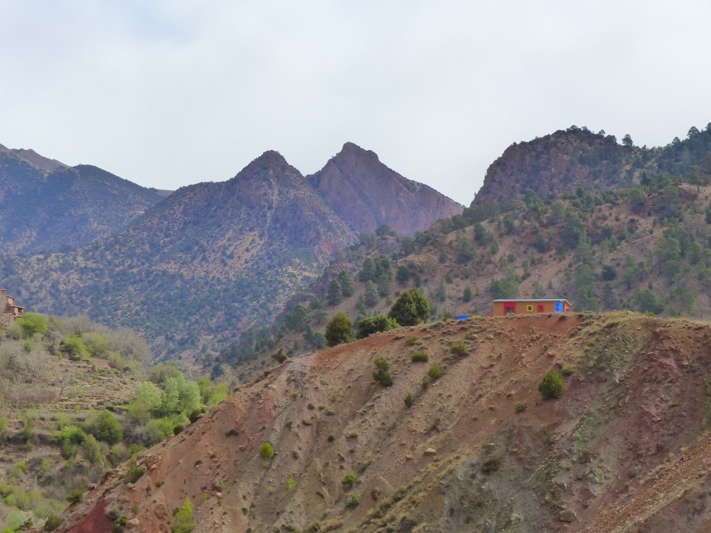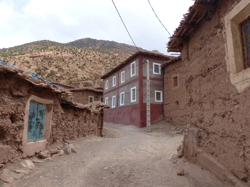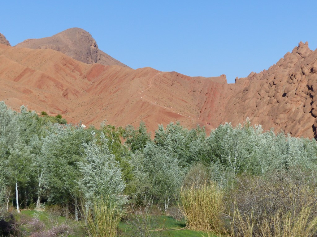 Chemin faisant nous retrouvons la terre rouge de l'Atlas. Le Toubkal, plus haut sommet du Maroc à 4167m, nous domine et porte des traces de l'enneigement récent.