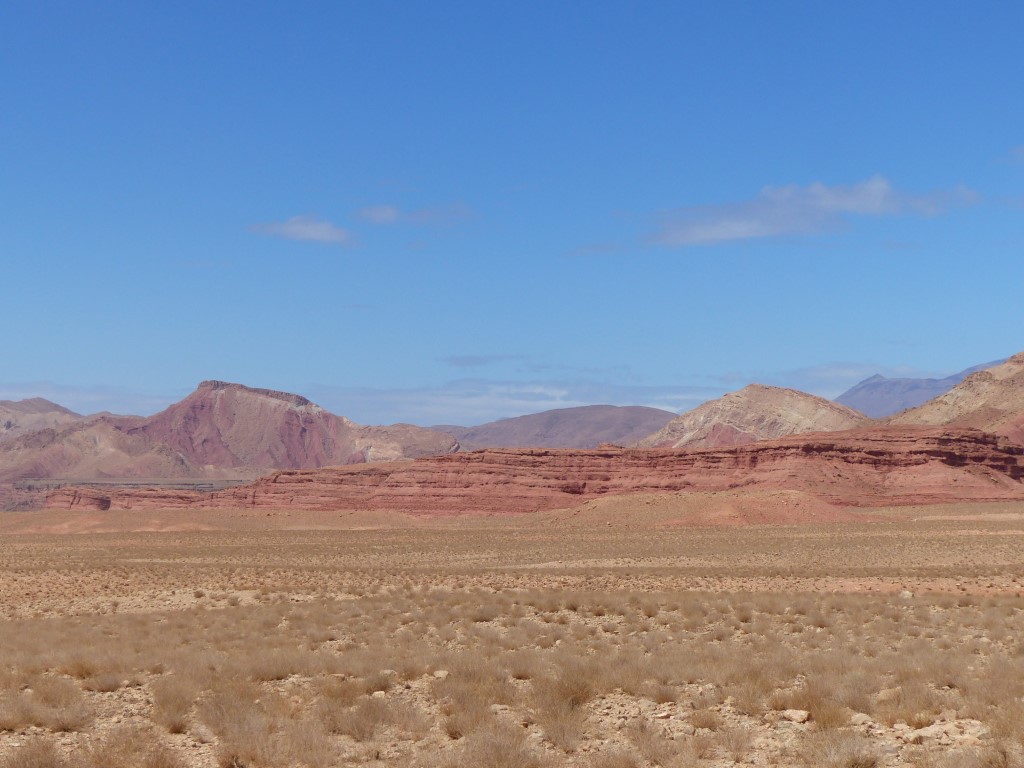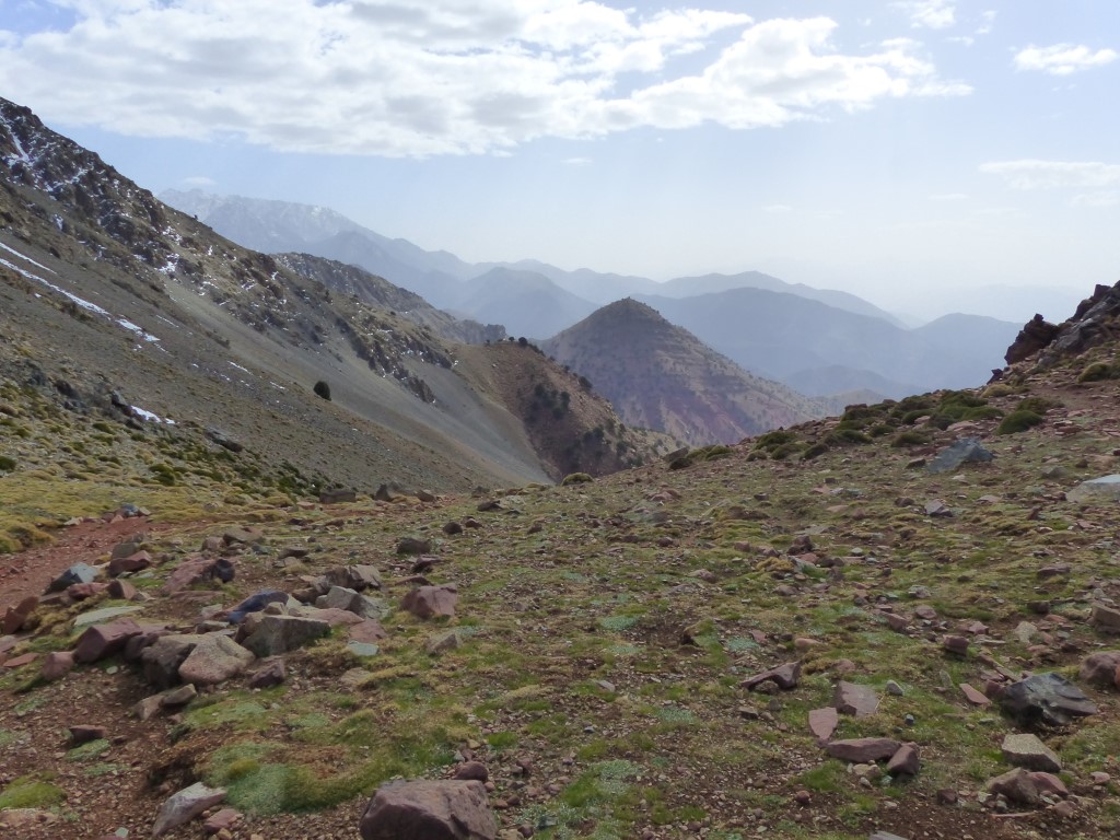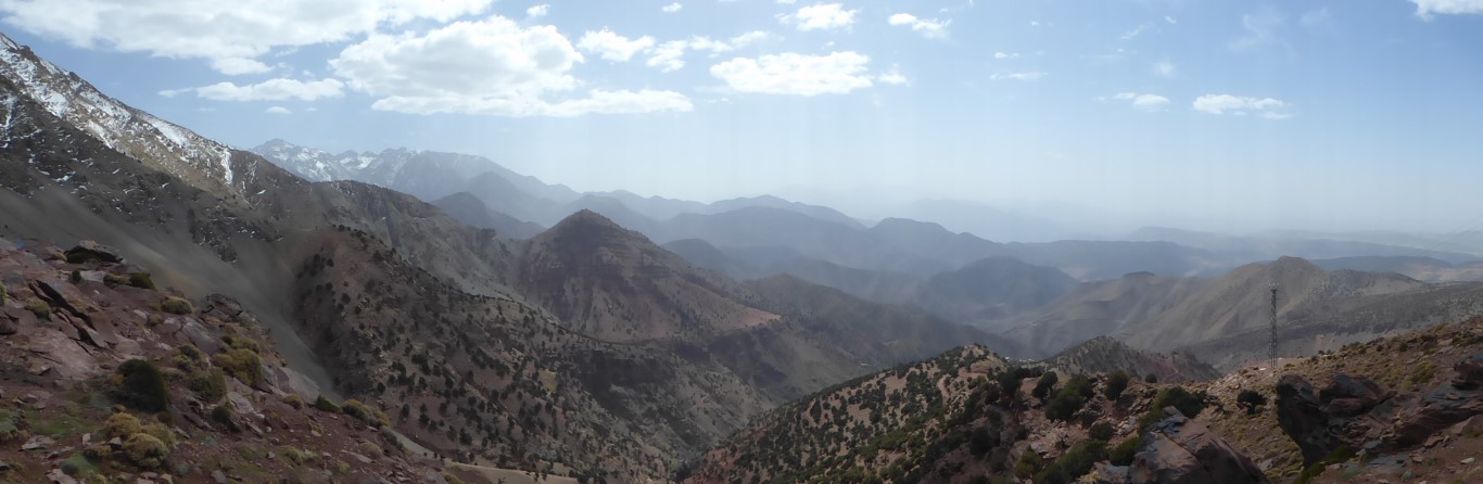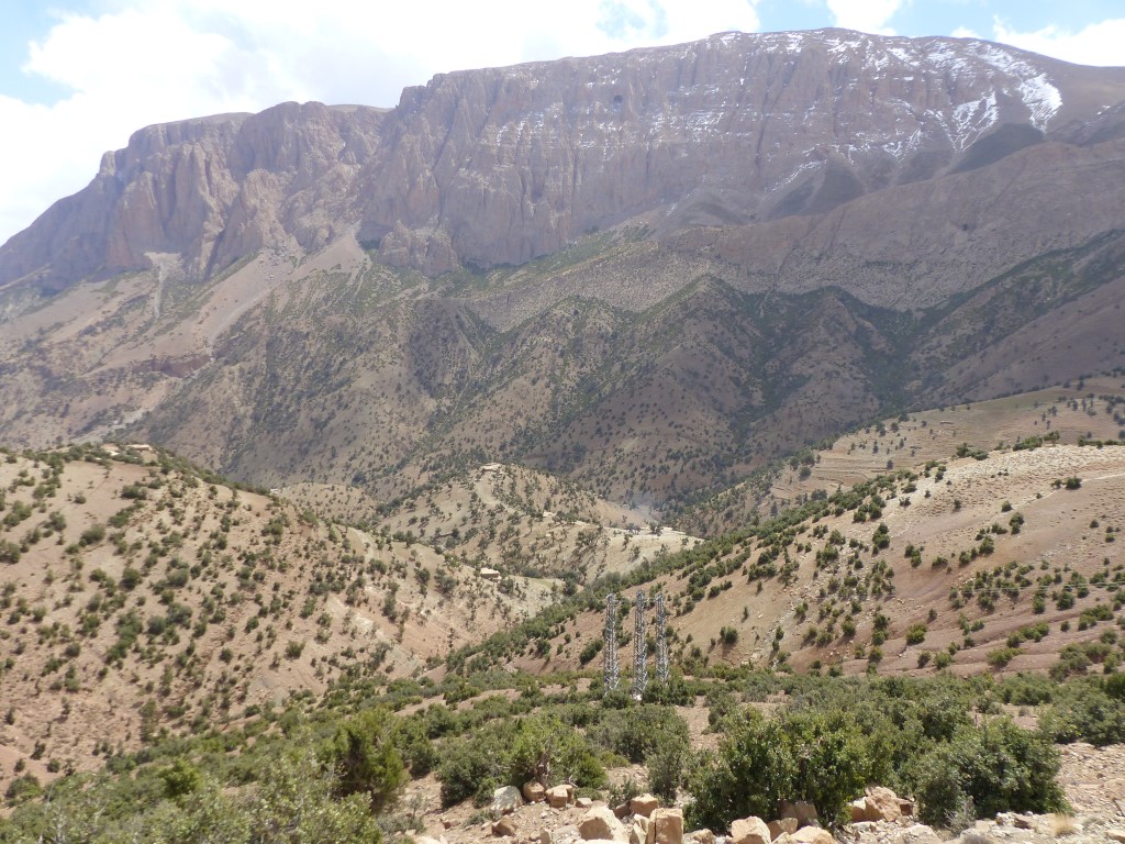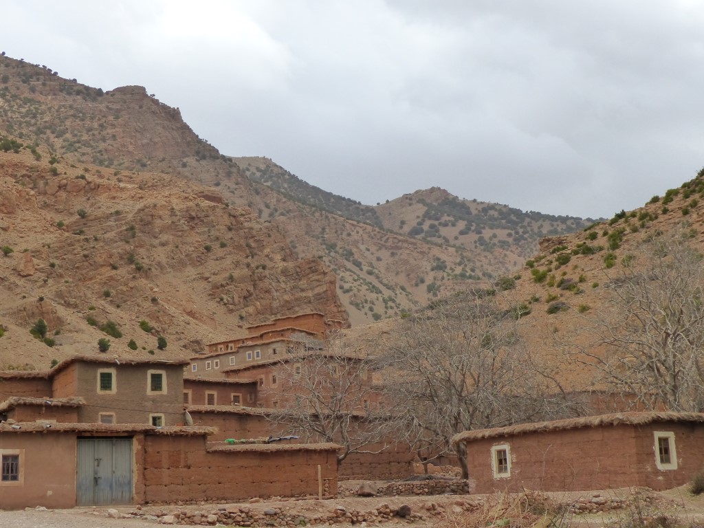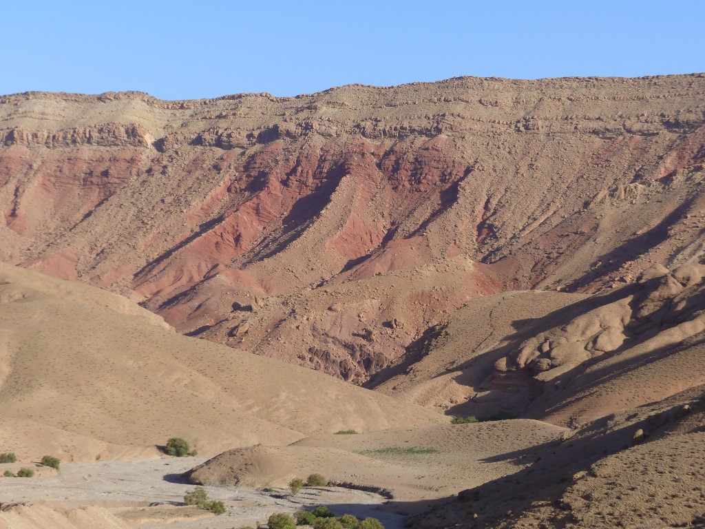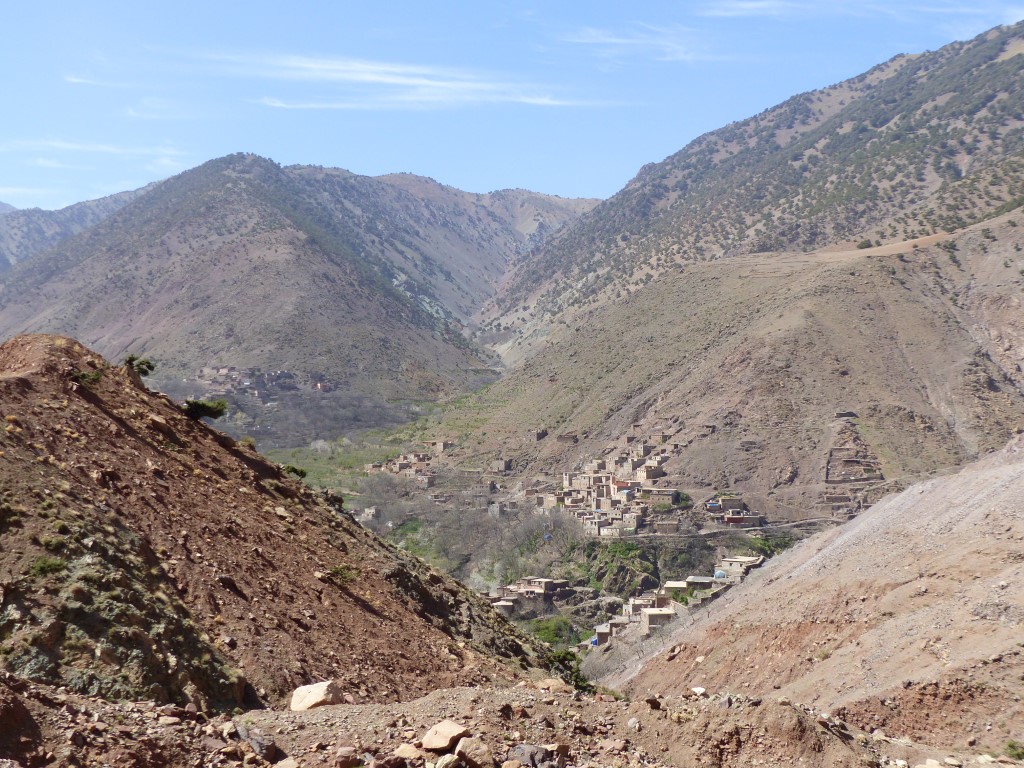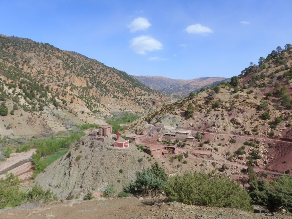 Chemin faisant nous retrouvons la terre rouge de l'Atlas. Le Toubkal, plus haut sommet du Maroc à 4167m, nous domine et porte des traces de l'enneigement récent.