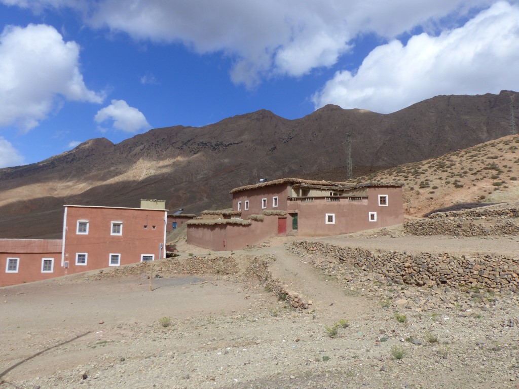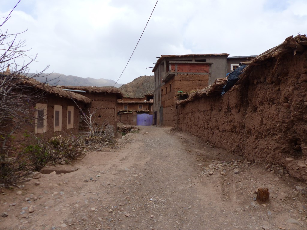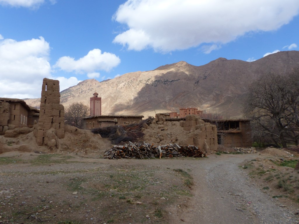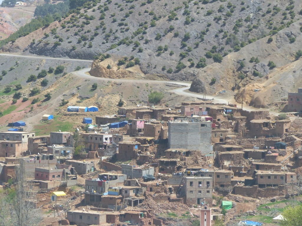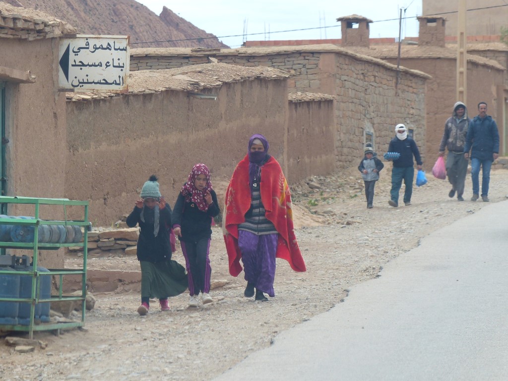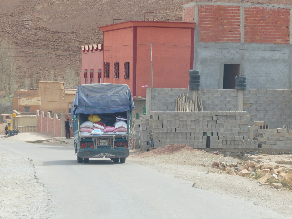 A la sortie du gîte, nous prenons la voie bitumée sur la gauche, vers les montagnes. Nous suivons une route escarpée qui nous rapproche des monts enneigés, au loin. C’est la direction du Toubkal, plus haut sommet du Maroc (4167m). Les apics sont bien prononcés sur cette route où l’on ne croise pas grand monde. Toujours quelques personnes, ici et là, qui semblent attendre que le temps passe. Quelques moutons sur le bas côté de la route, et, au détour d’un village. Plus surprenant, des camions qui vont et viennent, des tas de graviers ou de sable sur les côtés, des ouvriers qui construisent ou retapent des maisons. En y regardant de plus près, il y a aussi des tentes, type marabout, au coeur des villages ou sur les côtés de la route. Nous croyons comprendre que nous sommes dans une zone ayant subi le tremblement de terre récent.