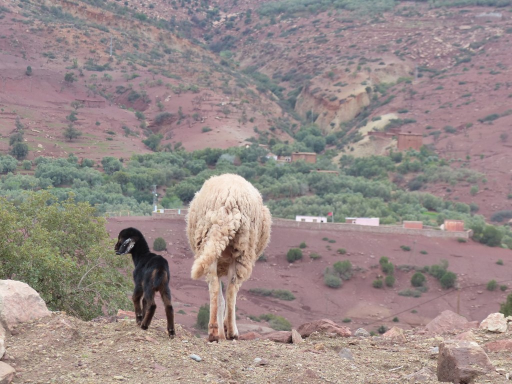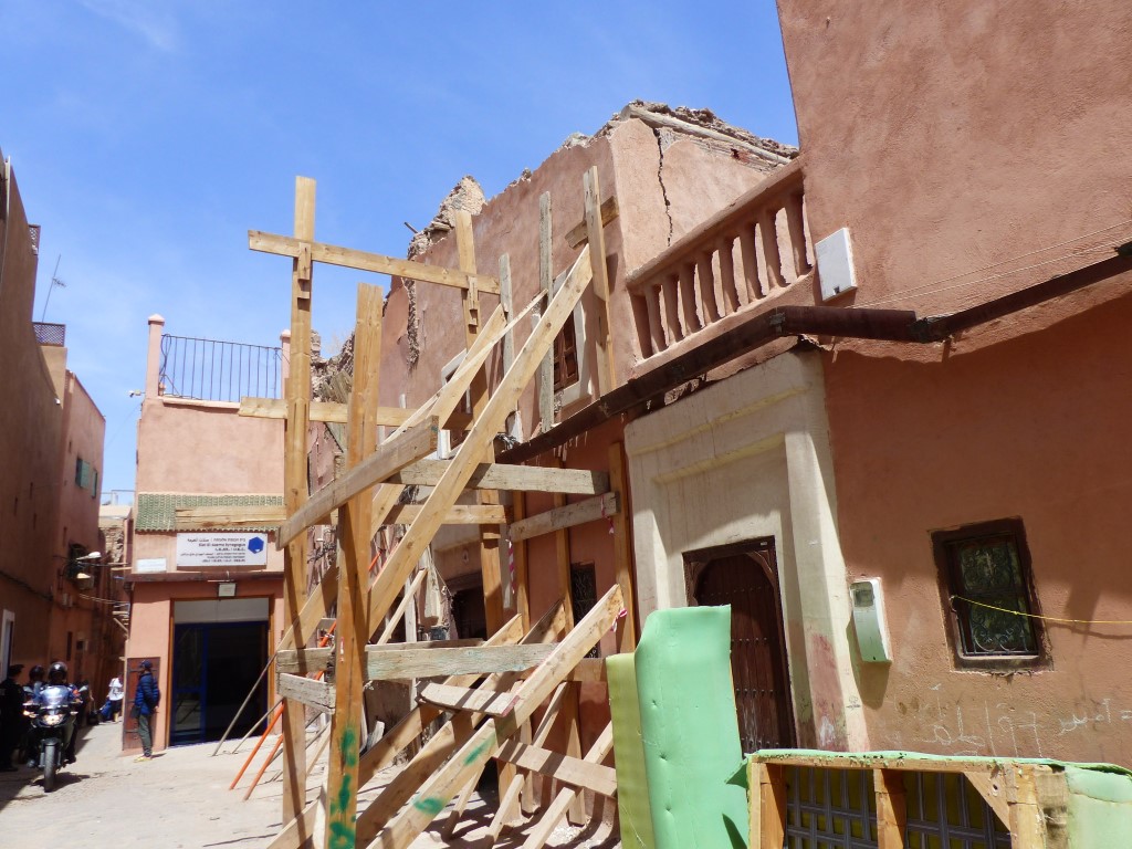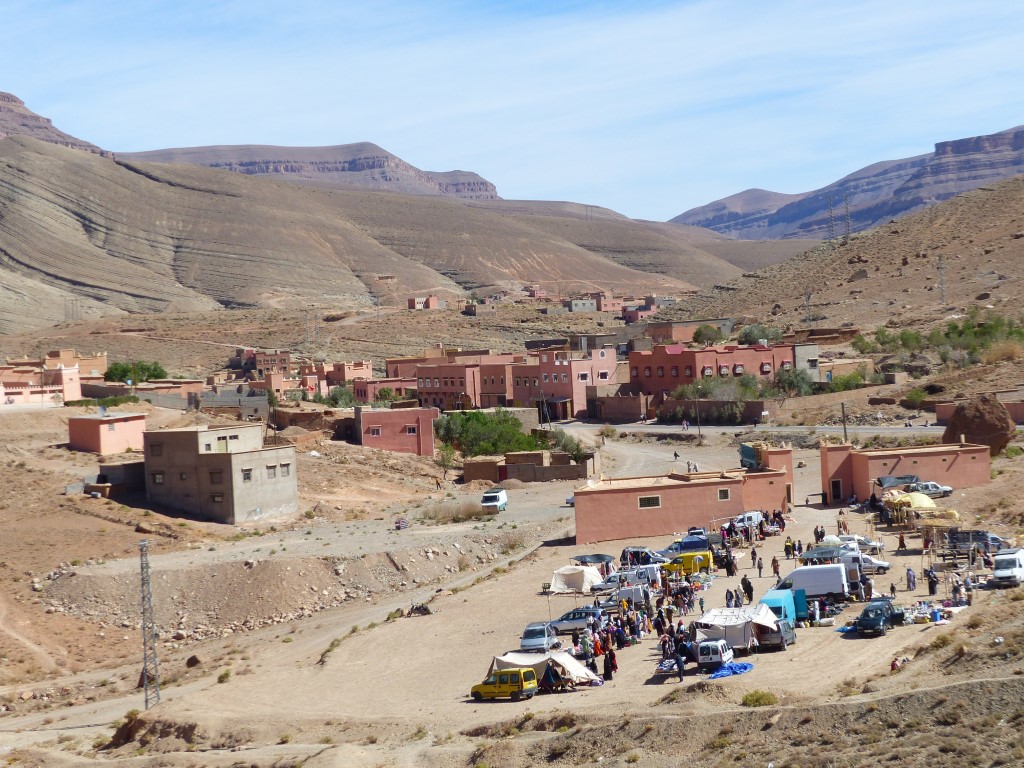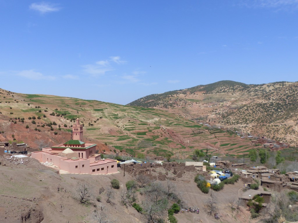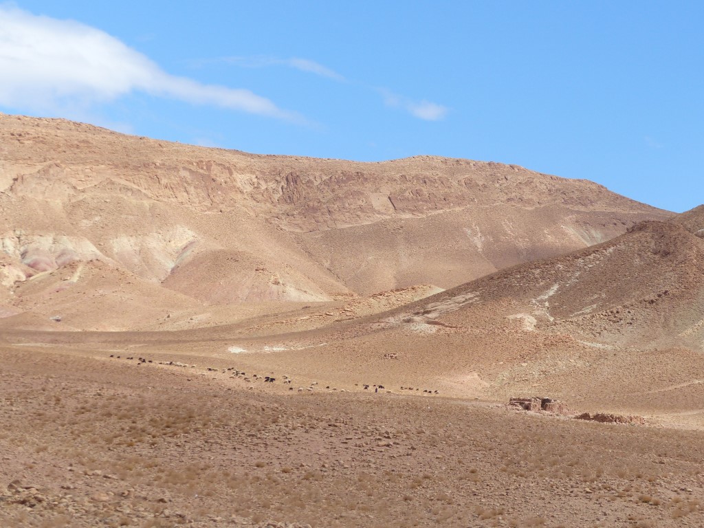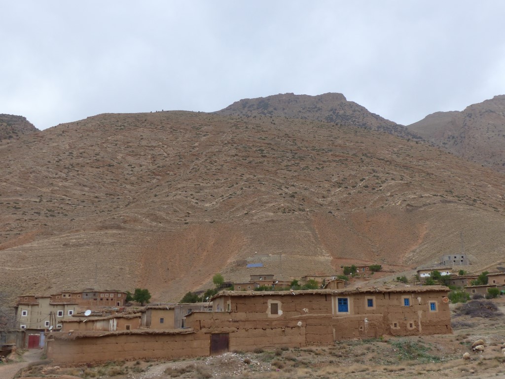 A la sortie du gîte, nous prenons la voie bitumée sur la gauche, vers les montagnes. Nous suivons une route escarpée qui nous rapproche des monts enneigés, au loin. C’est la direction du Toubkal, plus haut sommet du Maroc (4167m). Les apics sont bien prononcés sur cette route où l’on ne croise pas grand monde. Toujours quelques personnes, ici et là, qui semblent attendre que le temps passe. Quelques moutons sur le bas côté de la route, et, au détour d’un village. Plus surprenant, des camions qui vont et viennent, des tas de graviers ou de sable sur les côtés, des ouvriers qui construisent ou retapent des maisons. En y regardant de plus près, il y a aussi des tentes, type marabout, au coeur des villages ou sur les côtés de la route. Nous croyons comprendre que nous sommes dans une zone ayant subi le tremblement de terre récent.