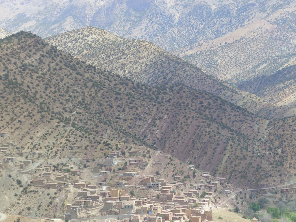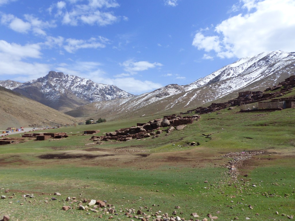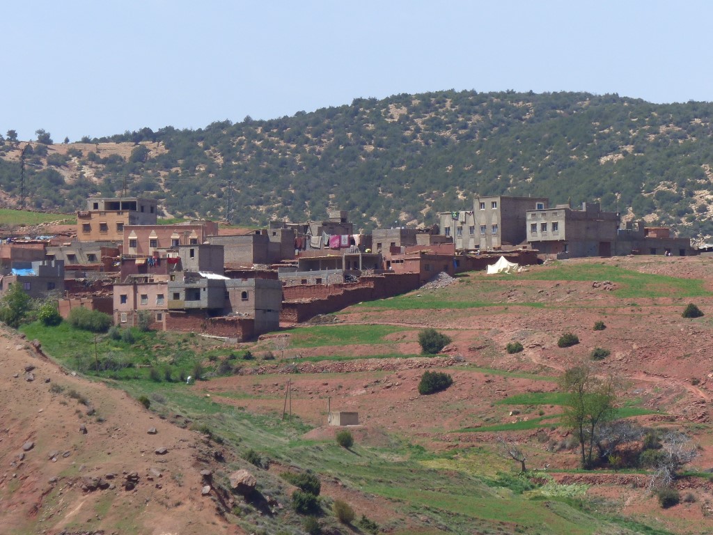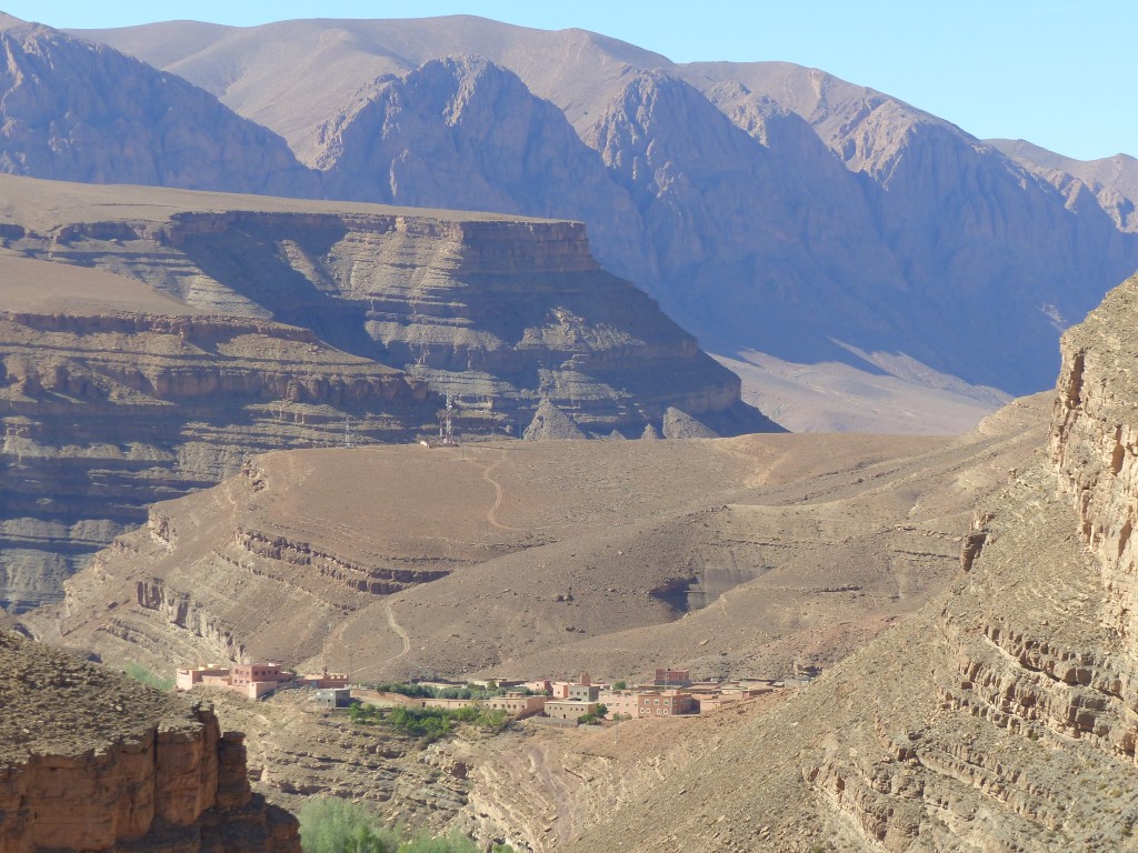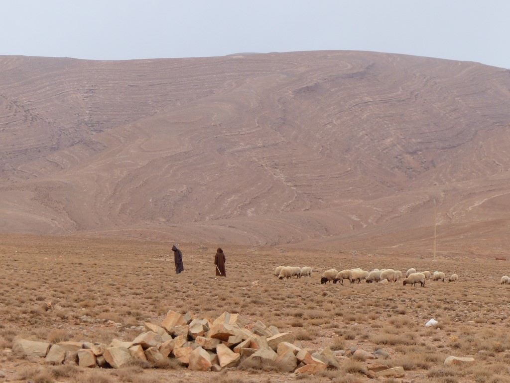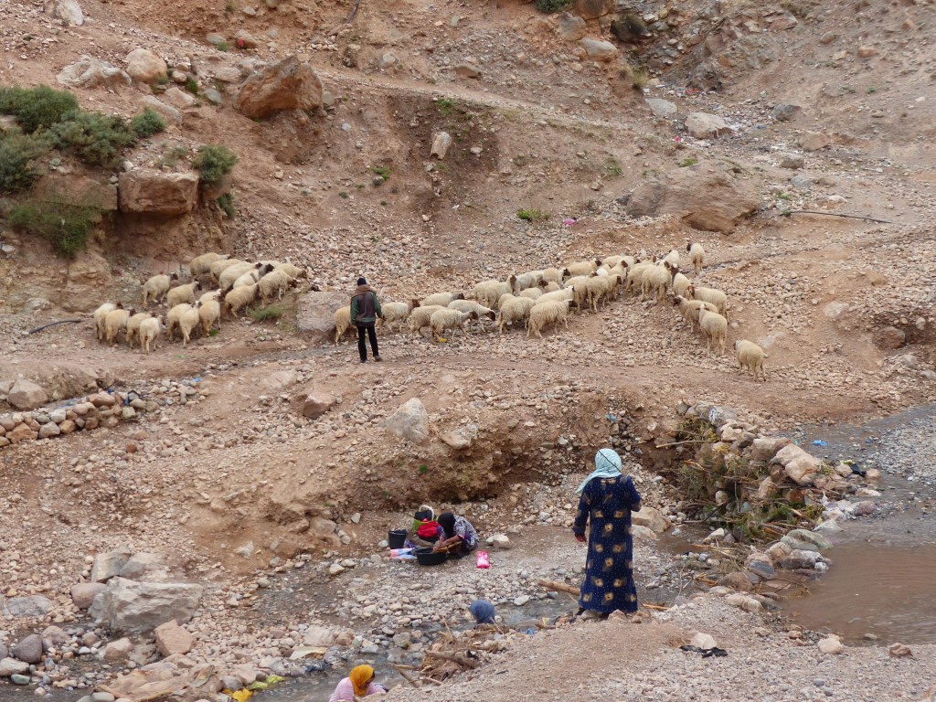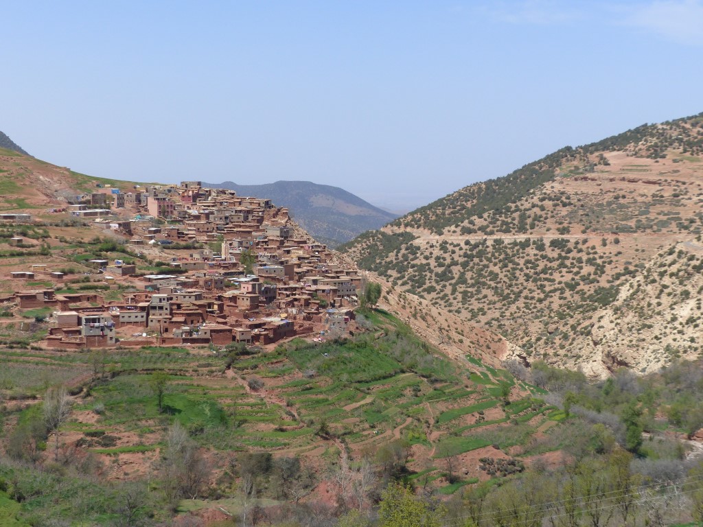 A la sortie du gîte, nous prenons la voie bitumée sur la gauche, vers les montagnes. Nous suivons une route escarpée qui nous rapproche des monts enneigés, au loin. C’est la direction du Toubkal, plus haut sommet du Maroc (4167m). Les apics sont bien prononcés sur cette route où l’on ne croise pas grand monde. Toujours quelques personnes, ici et là, qui semblent attendre que le temps passe. Quelques moutons sur le bas côté de la route, et, au détour d’un village. Plus surprenant, des camions qui vont et viennent, des tas de graviers ou de sable sur les côtés, des ouvriers qui construisent ou retapent des maisons. En y regardant de plus près, il y a aussi des tentes, type marabout, au coeur des villages ou sur les côtés de la route. Nous croyons comprendre que nous sommes dans une zone ayant subi le tremblement de terre récent.