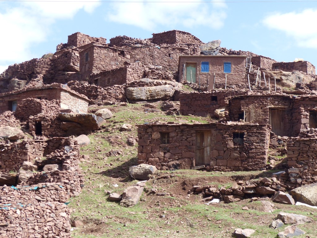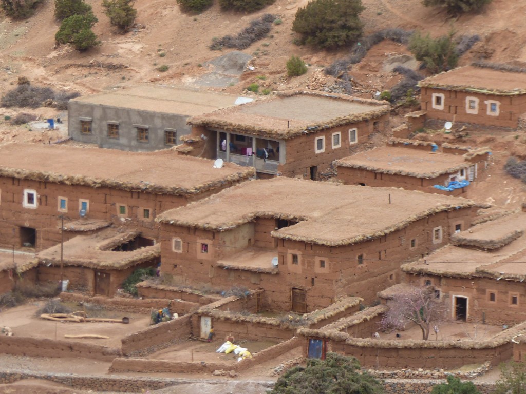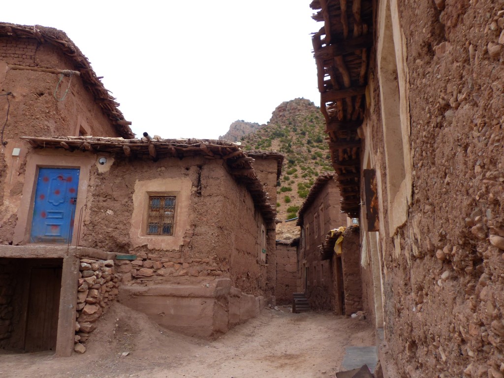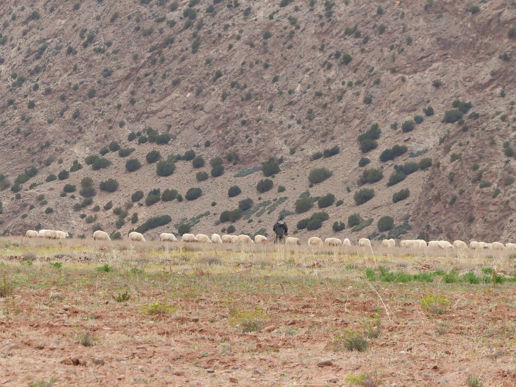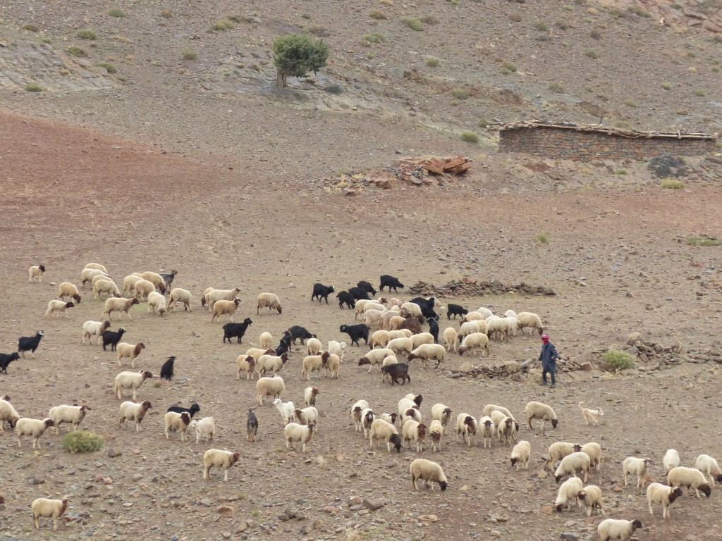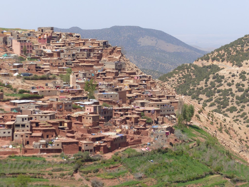 A la sortie du gîte, nous prenons la voie bitumée sur la gauche, vers les montagnes. Nous suivons une route escarpée qui nous rapproche des monts enneigés, au loin. C’est la direction du Toubkal, plus haut sommet du Maroc (4167m). Les apics sont bien prononcés sur cette route où l’on ne croise pas grand monde. Toujours quelques personnes, ici et là, qui semblent attendre que le temps passe. Quelques moutons sur le bas côté de la route, et, au détour d’un village. Plus surprenant, des camions qui vont et viennent, des tas de graviers ou de sable sur les côtés, des ouvriers qui construisent ou retapent des maisons. En y regardant de plus près, il y a aussi des tentes, type marabout, au coeur des villages ou sur les côtés de la route. Nous croyons comprendre que nous sommes dans une zone ayant subi le tremblement de terre récent.
