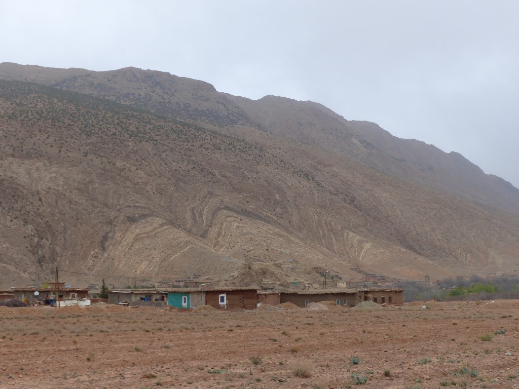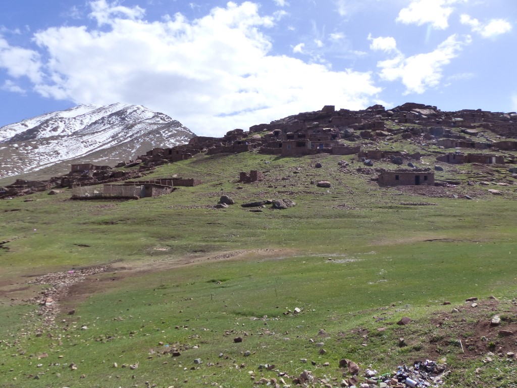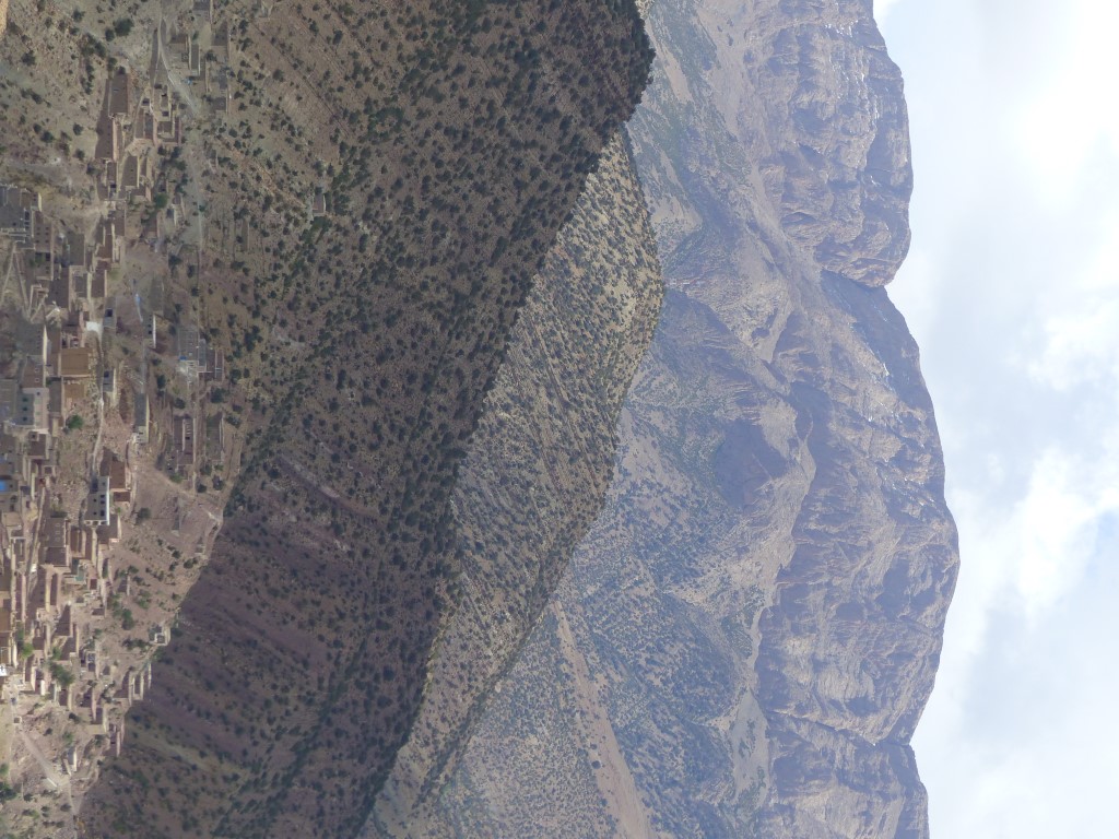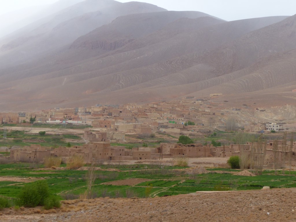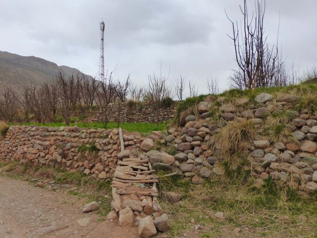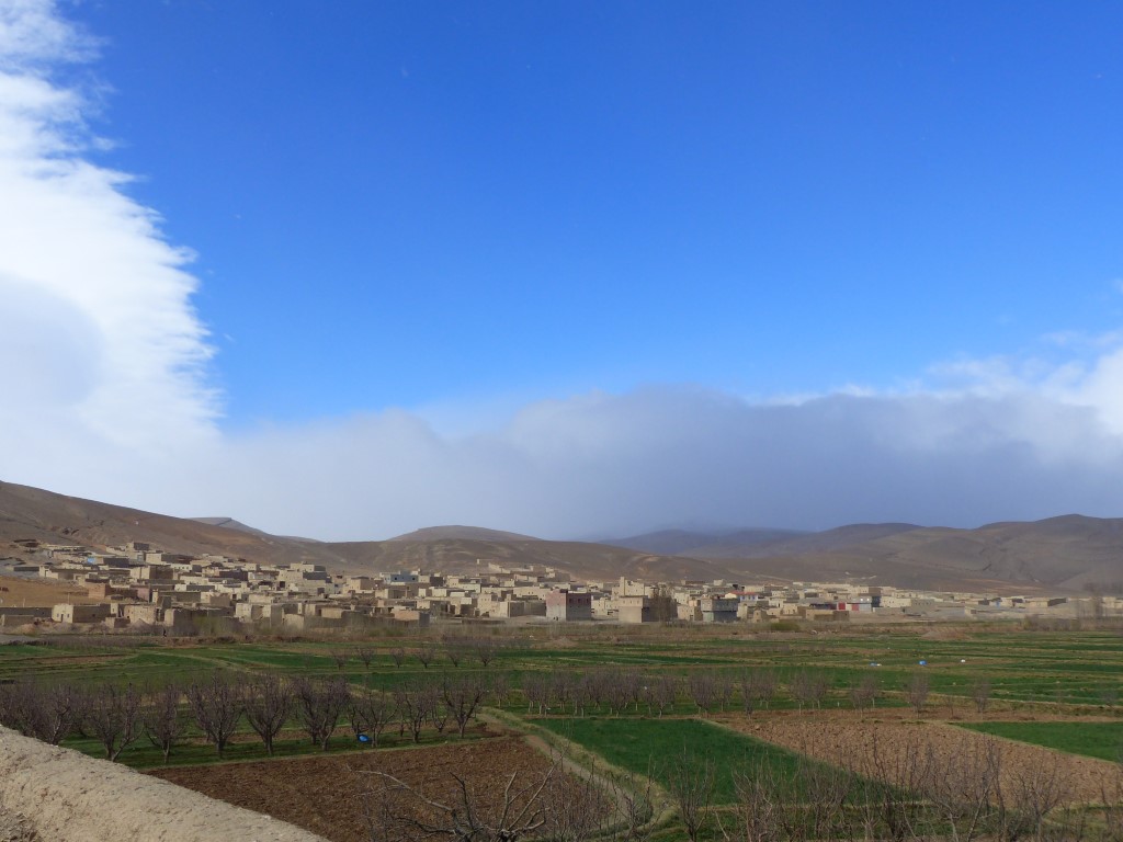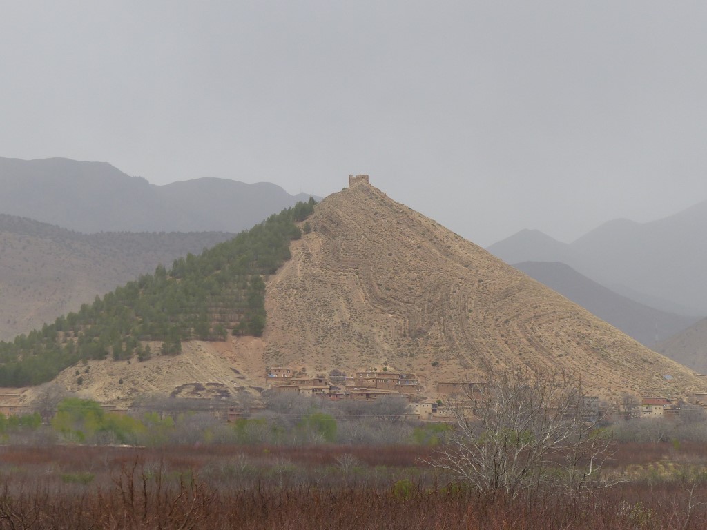 Il pleuviote quelques gouttes, mais pas de quoi nous mouiller. En passant dans les vergers, nous obliquons vers le village en direction de Tabant. Nous sommes guidés par un grenier à céréales installé tout en haut d'une montagne. Au pied se trouve un village de maisons en pisé. Il y a beaucoup de monde dehors; des bergers, des enfants qui jouent et des femmes qui lavent le linge à la rivière.