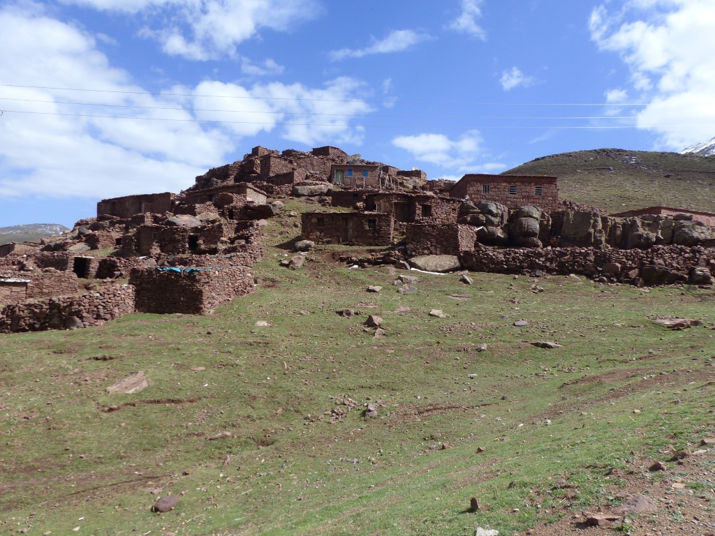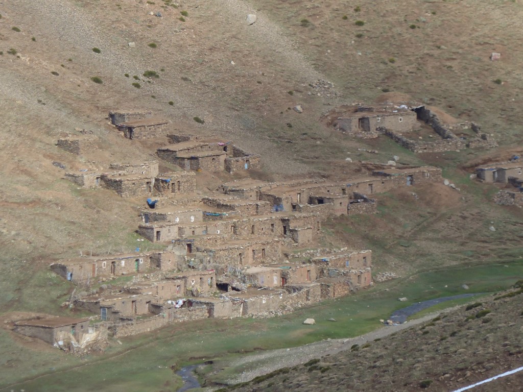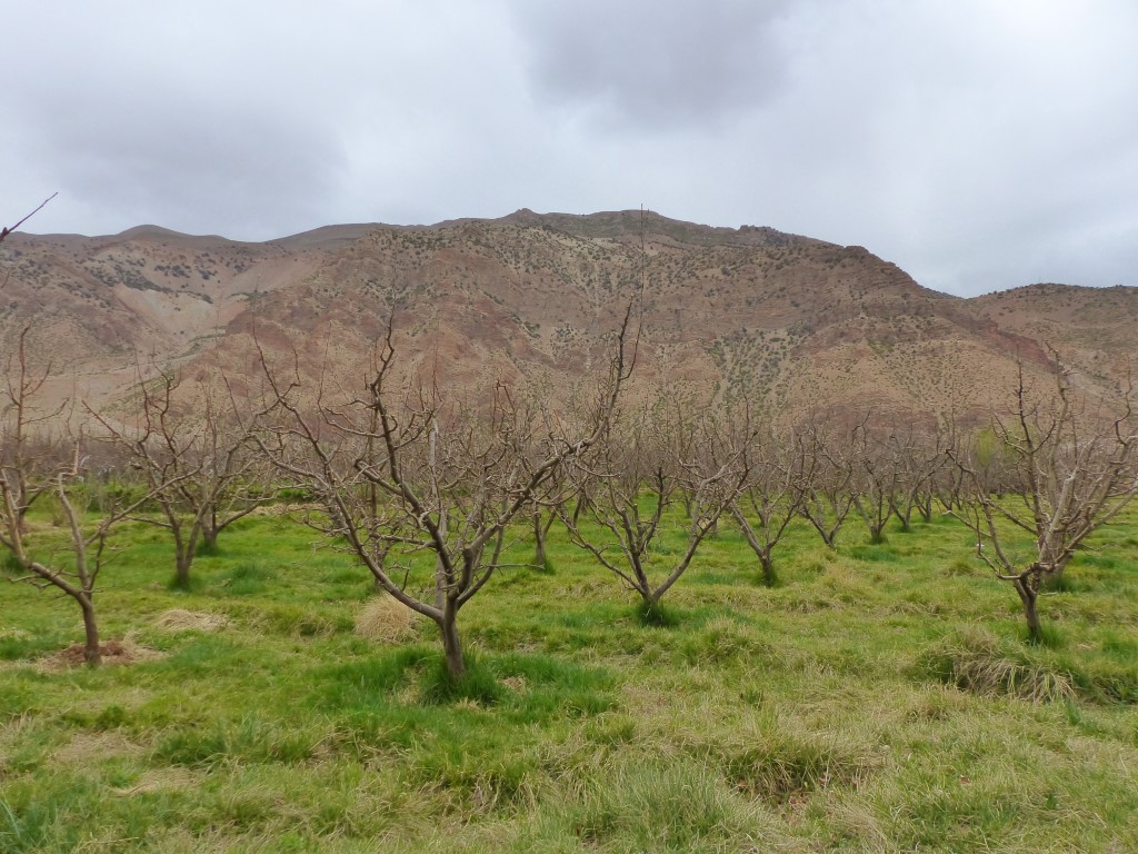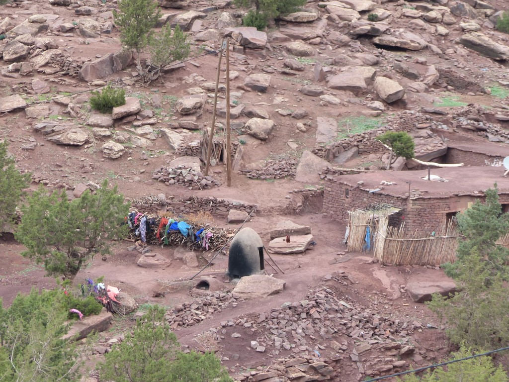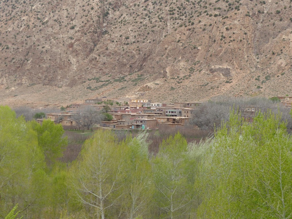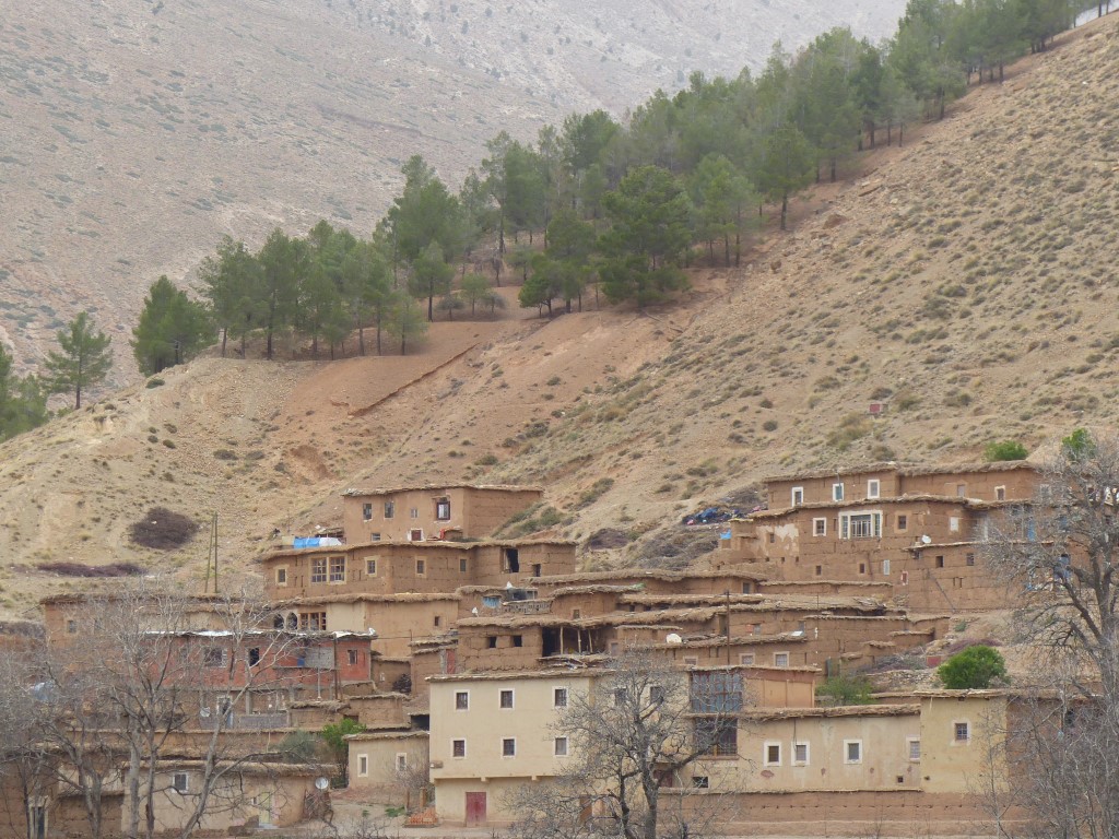 Il pleuviote quelques gouttes, mais pas de quoi nous mouiller. En passant dans les vergers, nous obliquons vers le village en direction de Tabant. Nous sommes guidés par un grenier à céréales installé tout en haut d'une montagne. Au pied se trouve un village de maisons en pisé. Il y a beaucoup de monde dehors; des bergers, des enfants qui jouent et des femmes qui lavent le linge à la rivière.