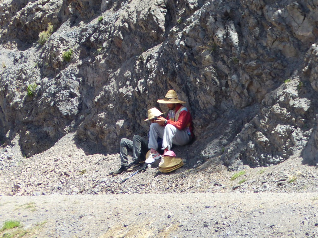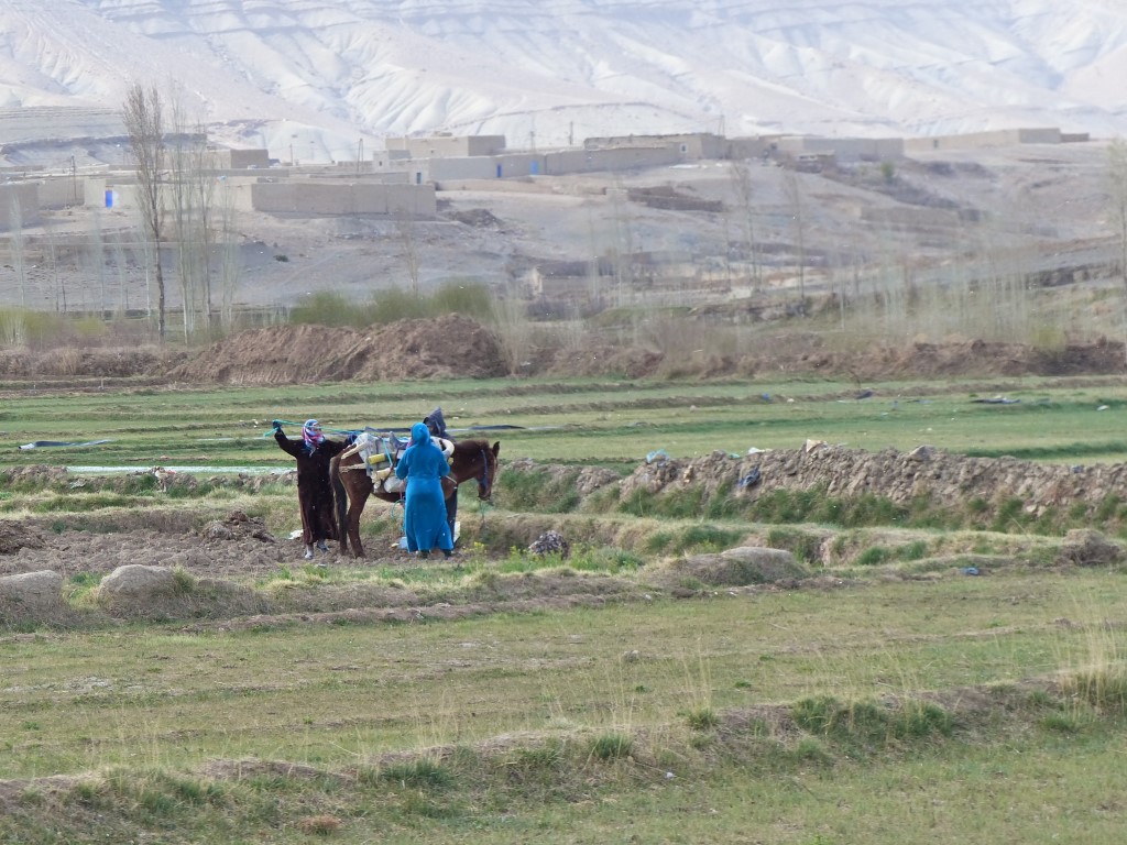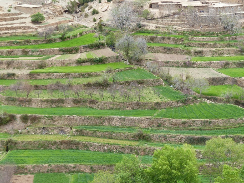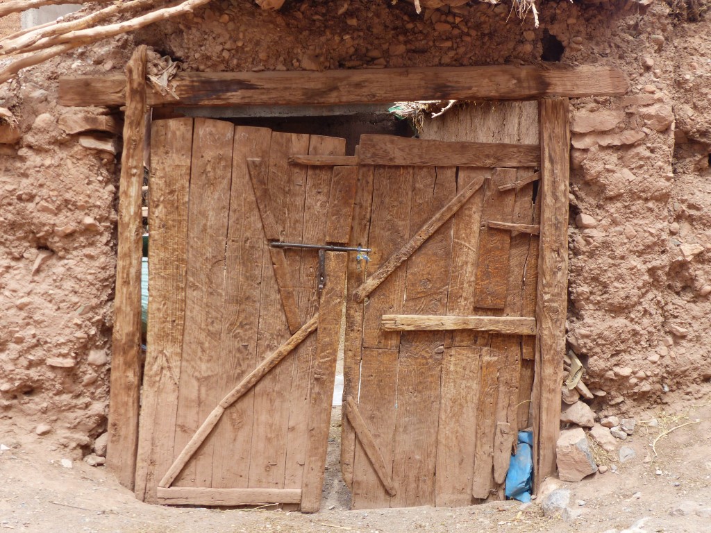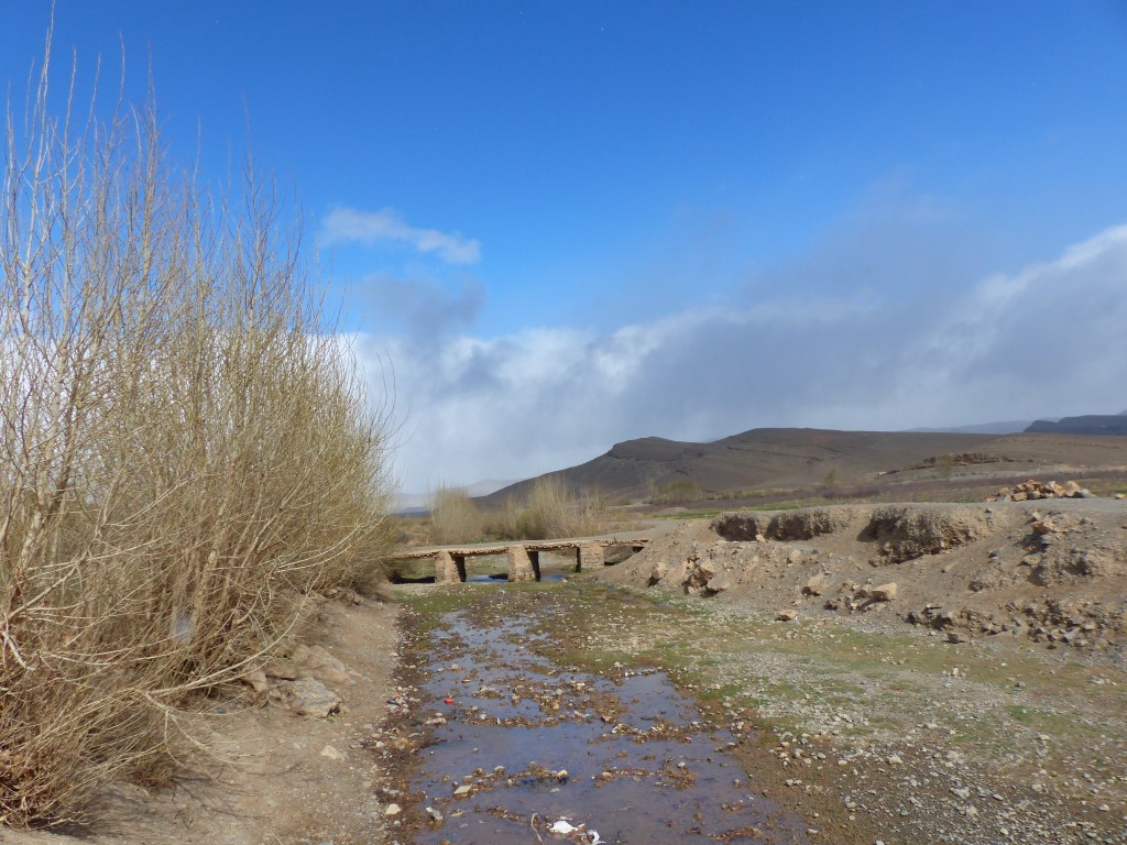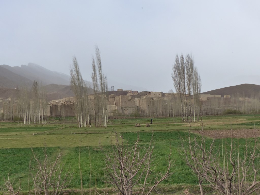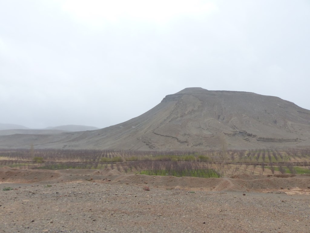 Il pleuviote quelques gouttes, mais pas de quoi nous mouiller. En passant dans les vergers, nous obliquons vers le village en direction de Tabant. Nous sommes guidés par un grenier à céréales installé tout en haut d'une montagne. Au pied se trouve un village de maisons en pisé. Il y a beaucoup de monde dehors; des bergers, des enfants qui jouent et des femmes qui lavent le linge à la rivière.