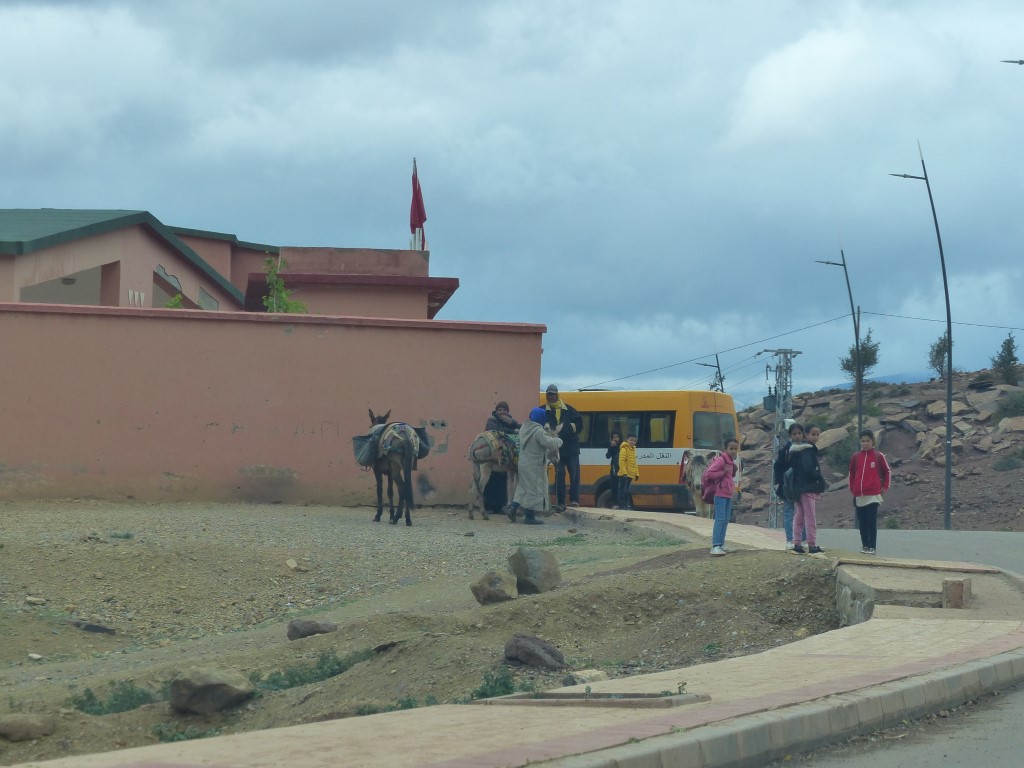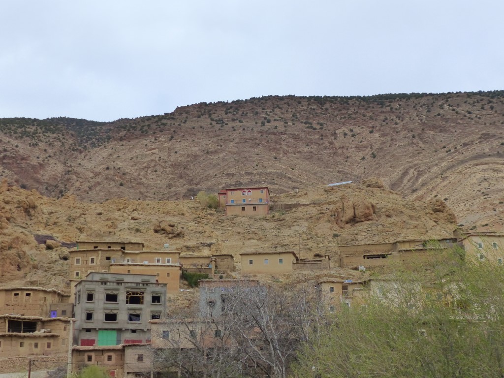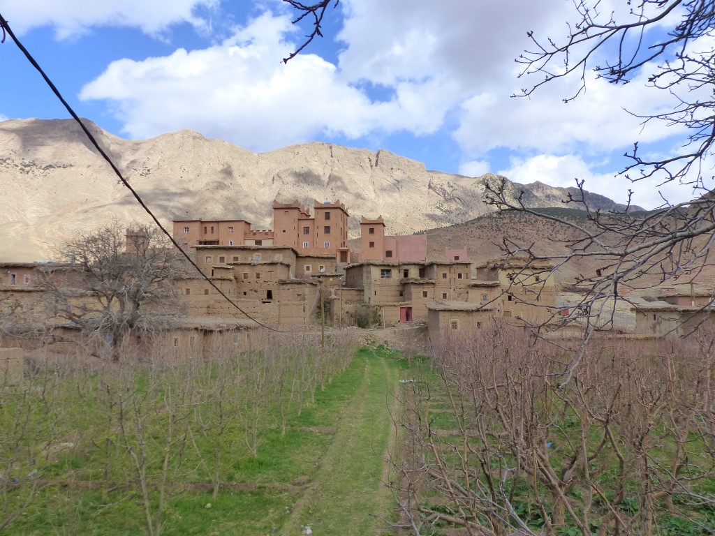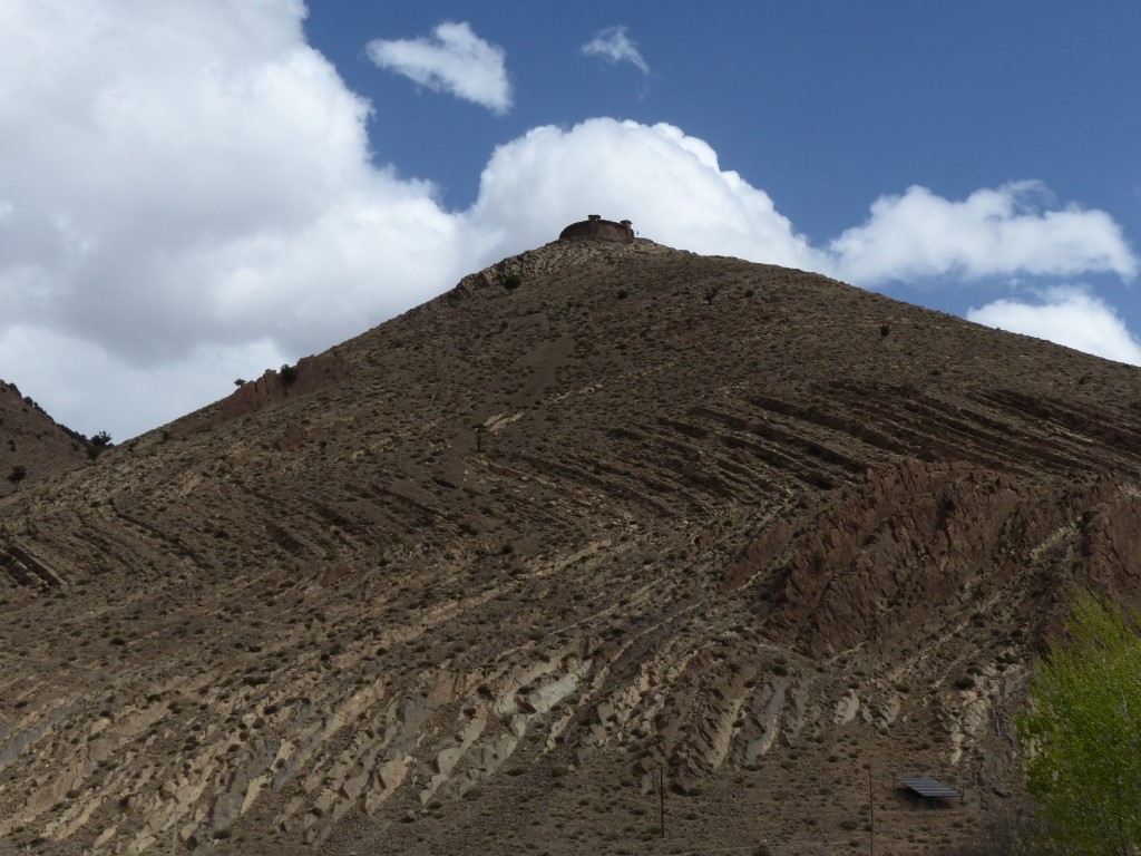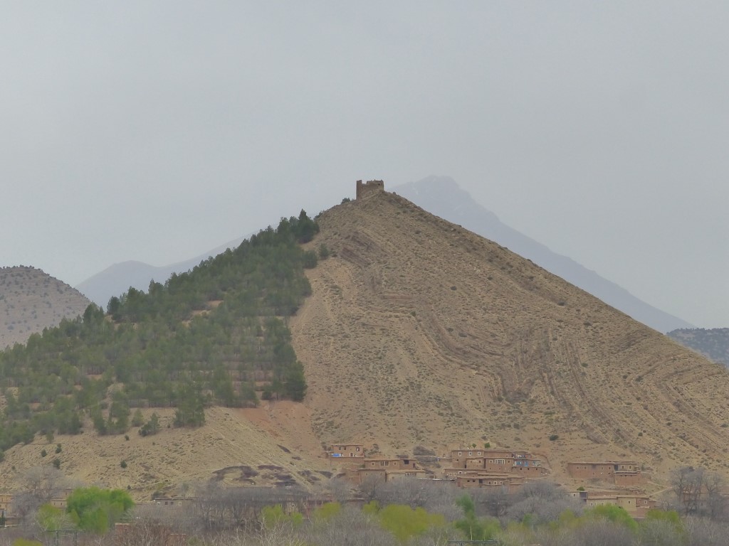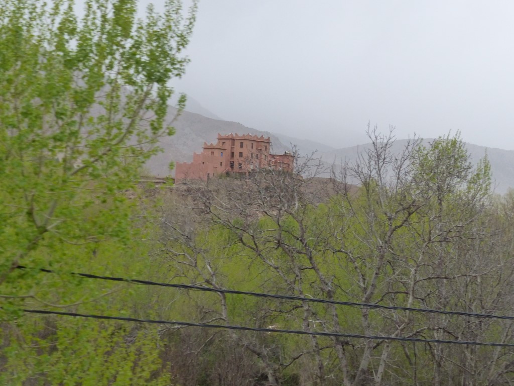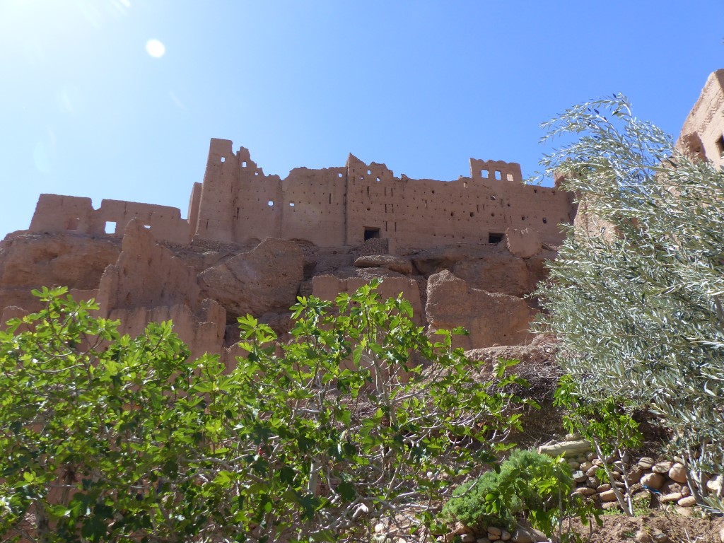 Aujourd’hui étant vendredi, les commerces pourraient être fermés. Ben, non, il y en a d’ouverts et les bus de ramassage scolaires sillonnent les routes. Pas sûrs d’avoir compris le fonctionnement du pays. Armés de courage (celui du touriste en vacances), nous laissons tomber les commerces et nous arrêtons dans un restaurant indiqué comme point de départ d’une balade vers la kasbah Itran (photo – grand bâtiment ruiné sur une butte). Nous mangeons ce qui nous est servi, pas forcément ce que nous avions choisi ! Pas grave tout est bon !