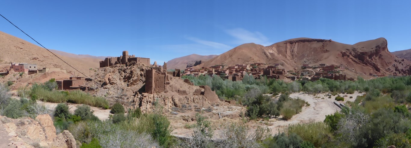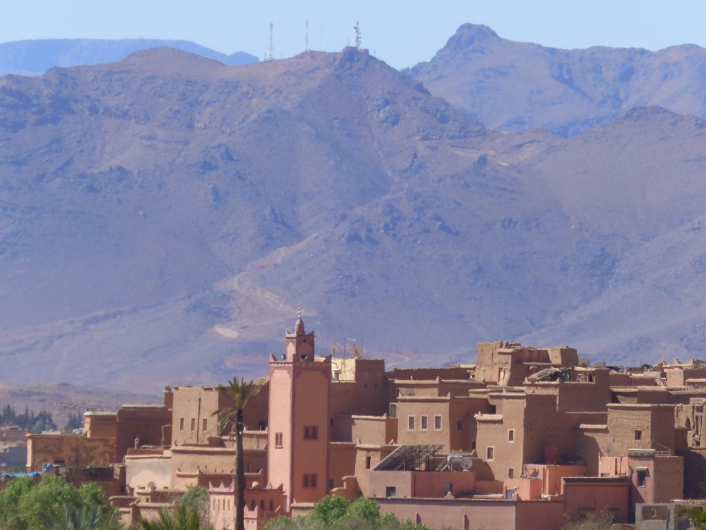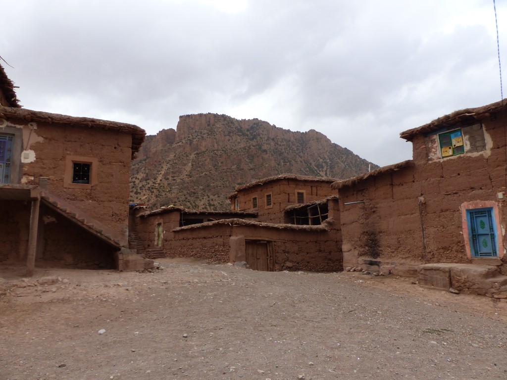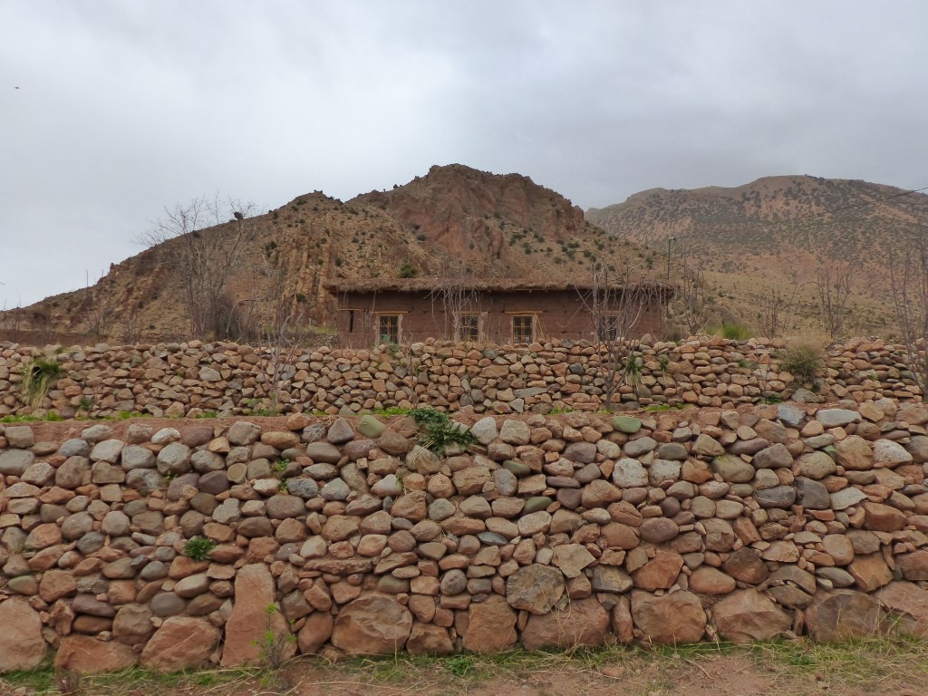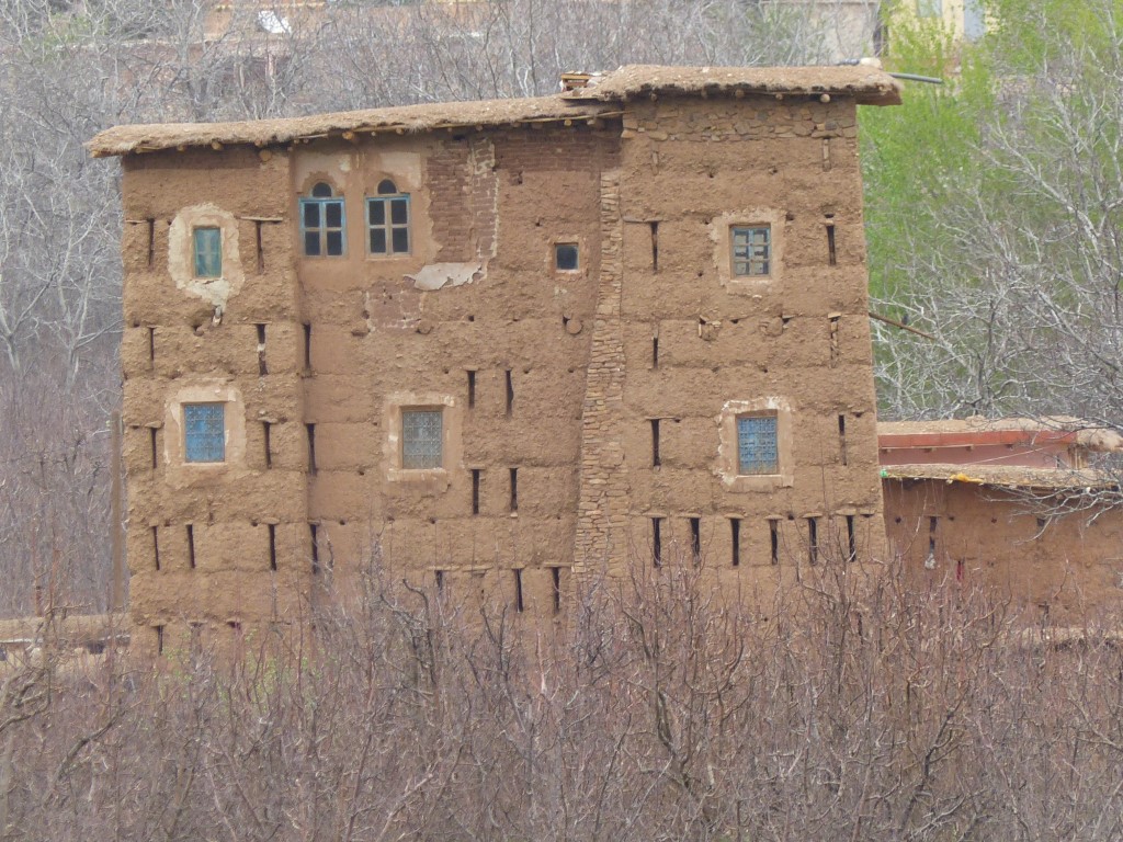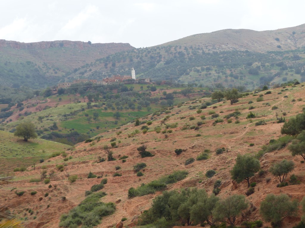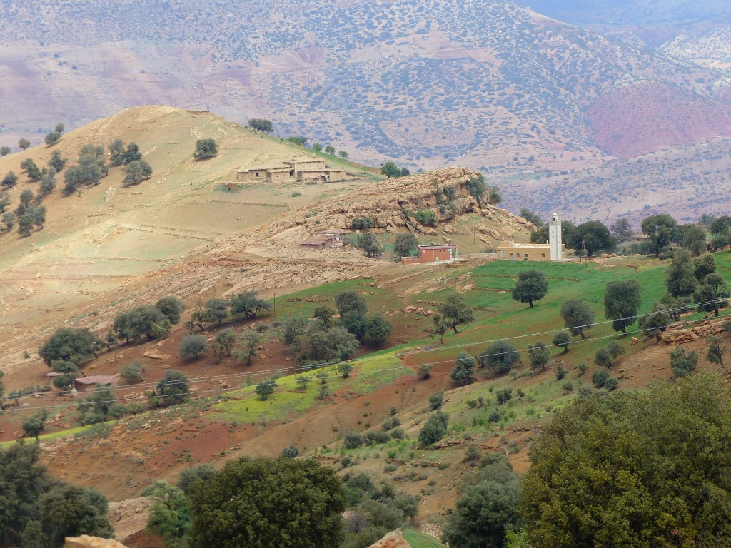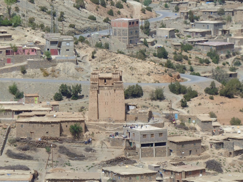 Aujourd’hui étant vendredi, les commerces pourraient être fermés. Ben, non, il y en a d’ouverts et les bus de ramassage scolaires sillonnent les routes. Pas sûrs d’avoir compris le fonctionnement du pays. Armés de courage (celui du touriste en vacances), nous laissons tomber les commerces et nous arrêtons dans un restaurant indiqué comme point de départ d’une balade vers la kasbah Itran (photo – grand bâtiment ruiné sur une butte). Nous mangeons ce qui nous est servi, pas forcément ce que nous avions choisi ! Pas grave tout est bon !