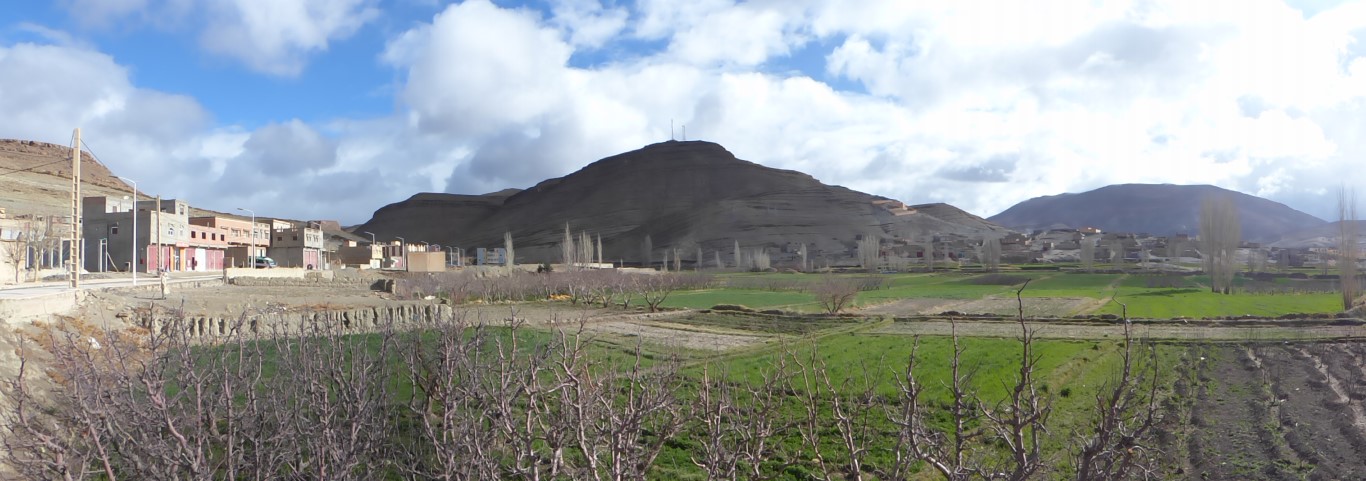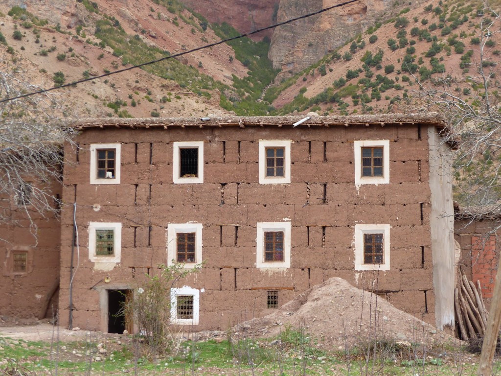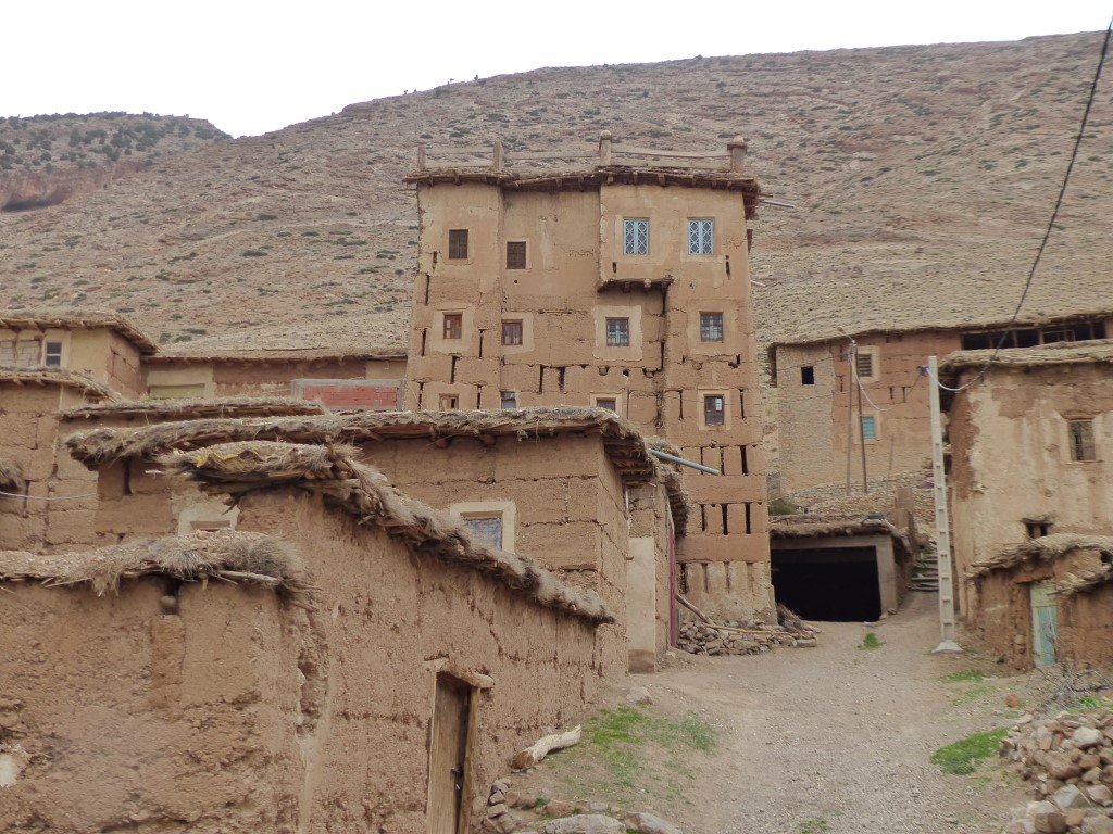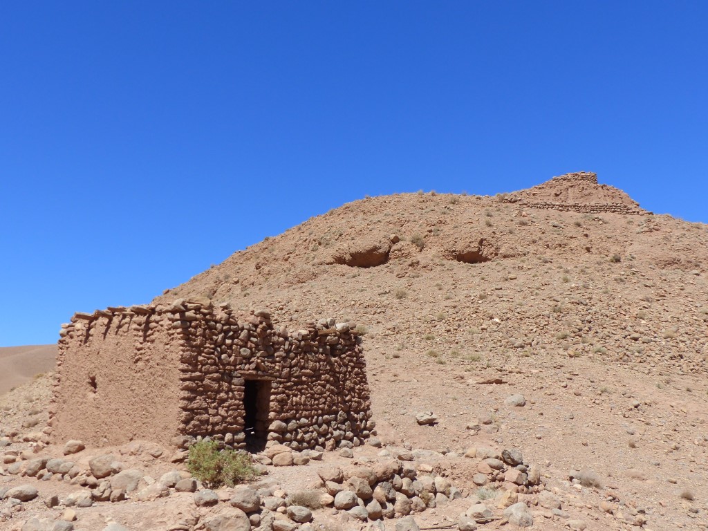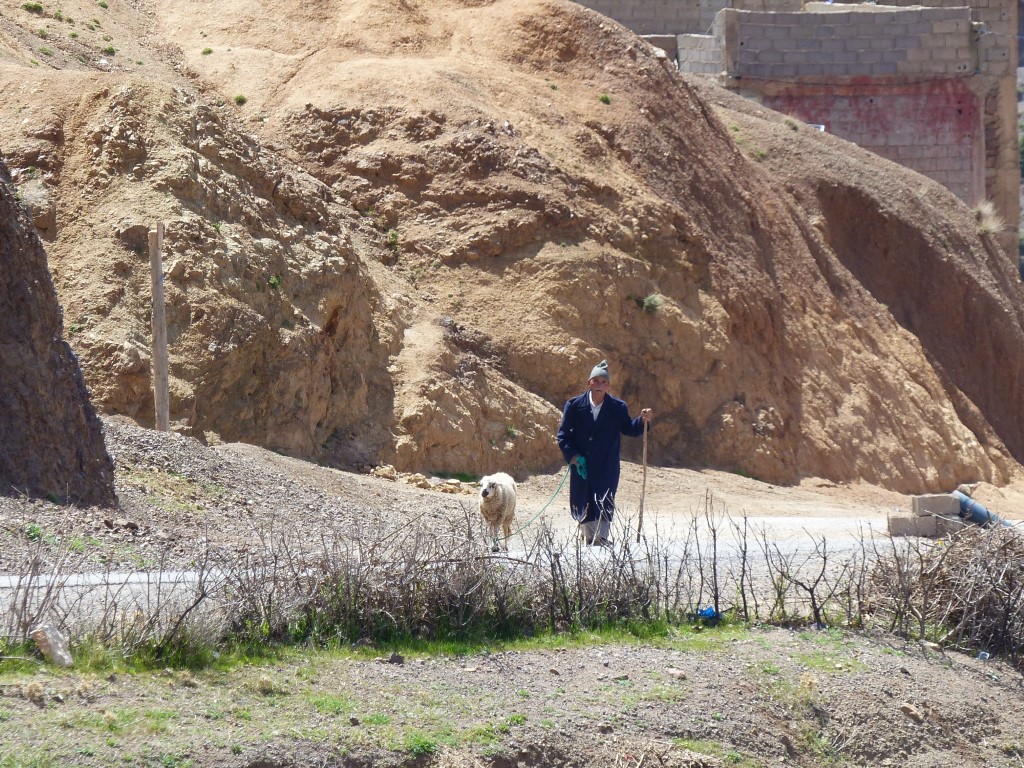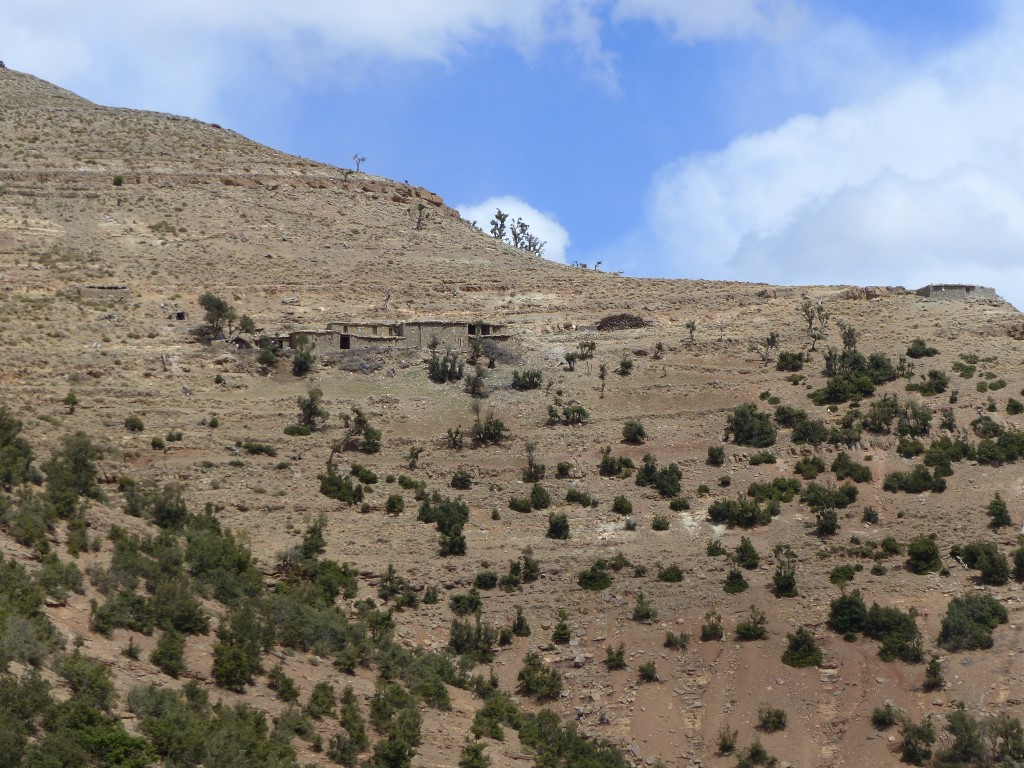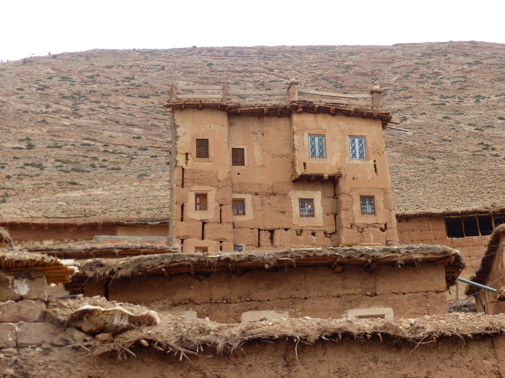 Aujourd’hui étant vendredi, les commerces pourraient être fermés. Ben, non, il y en a d’ouverts et les bus de ramassage scolaires sillonnent les routes. Pas sûrs d’avoir compris le fonctionnement du pays. Armés de courage (celui du touriste en vacances), nous laissons tomber les commerces et nous arrêtons dans un restaurant indiqué comme point de départ d’une balade vers la kasbah Itran (photo – grand bâtiment ruiné sur une butte). Nous mangeons ce qui nous est servi, pas forcément ce que nous avions choisi ! Pas grave tout est bon !