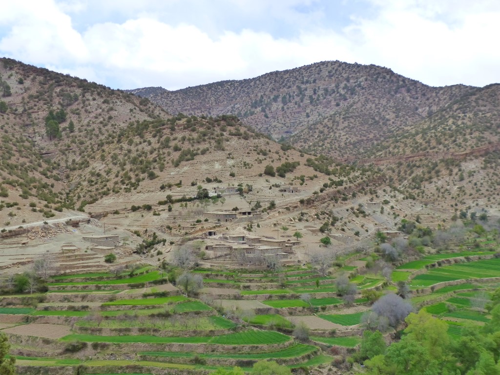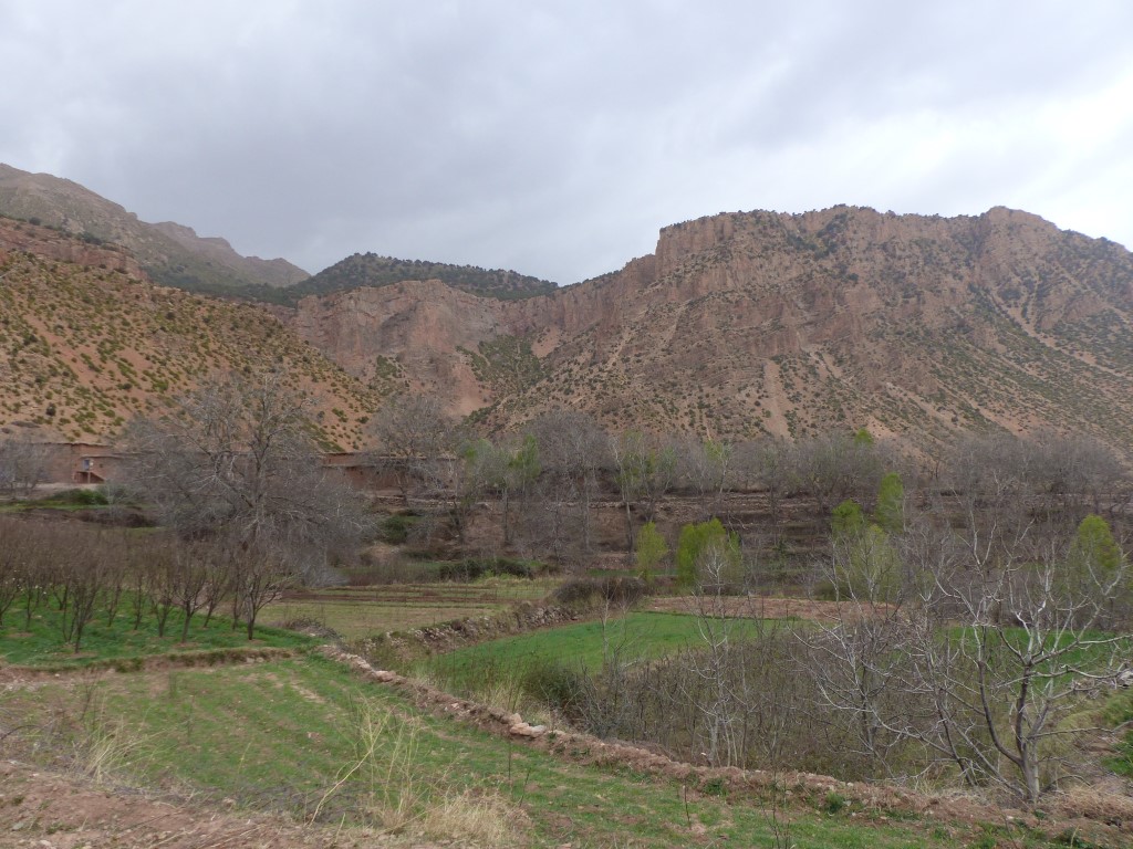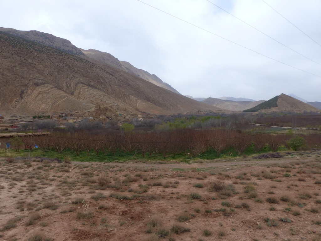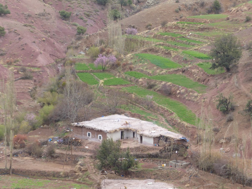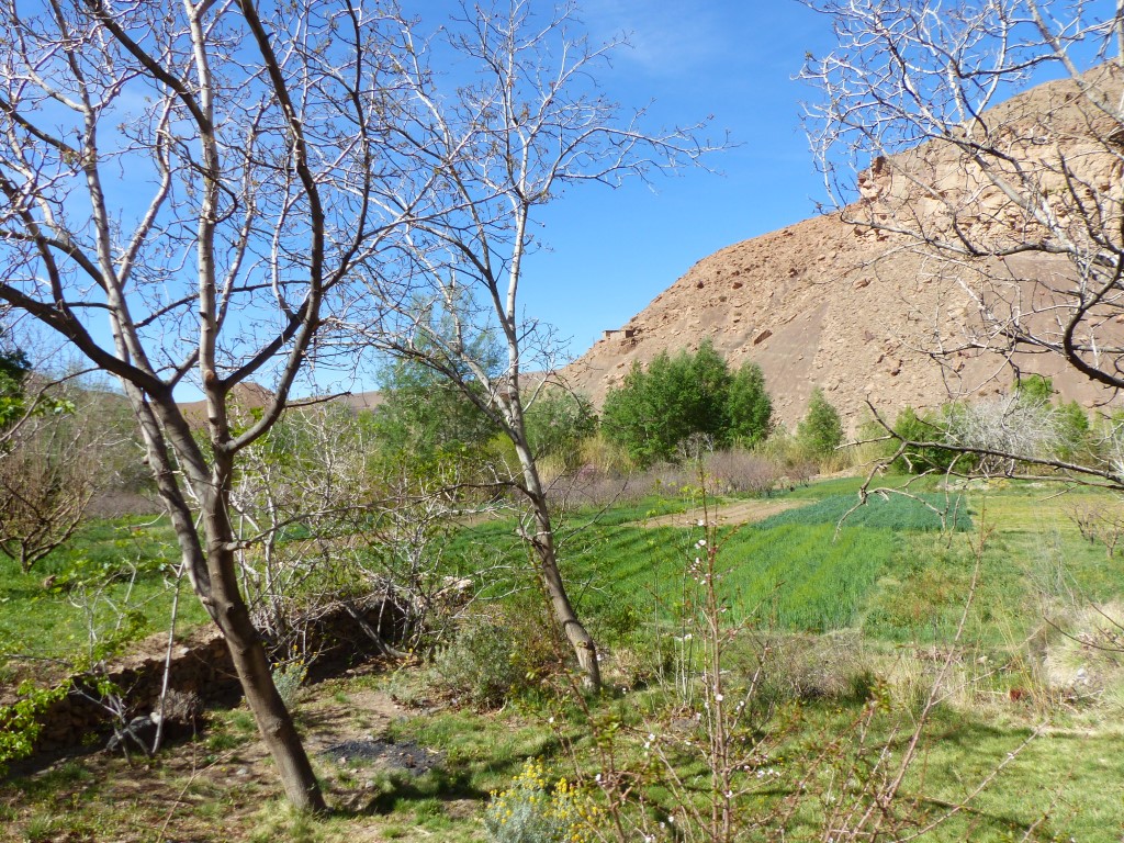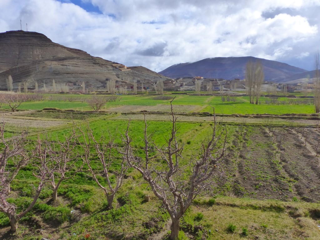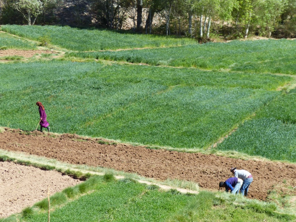 Il y a de l'eau dans cette vallée et les Marocains préparent les champs. Ils bêchent au pied des arbres et ajoutent de la fumure. Sur Agouti, où nous avons dormi et où nous serons encore ce soir, les espaces sont des vergers de noyers, d'abricotiers et de pommiers.