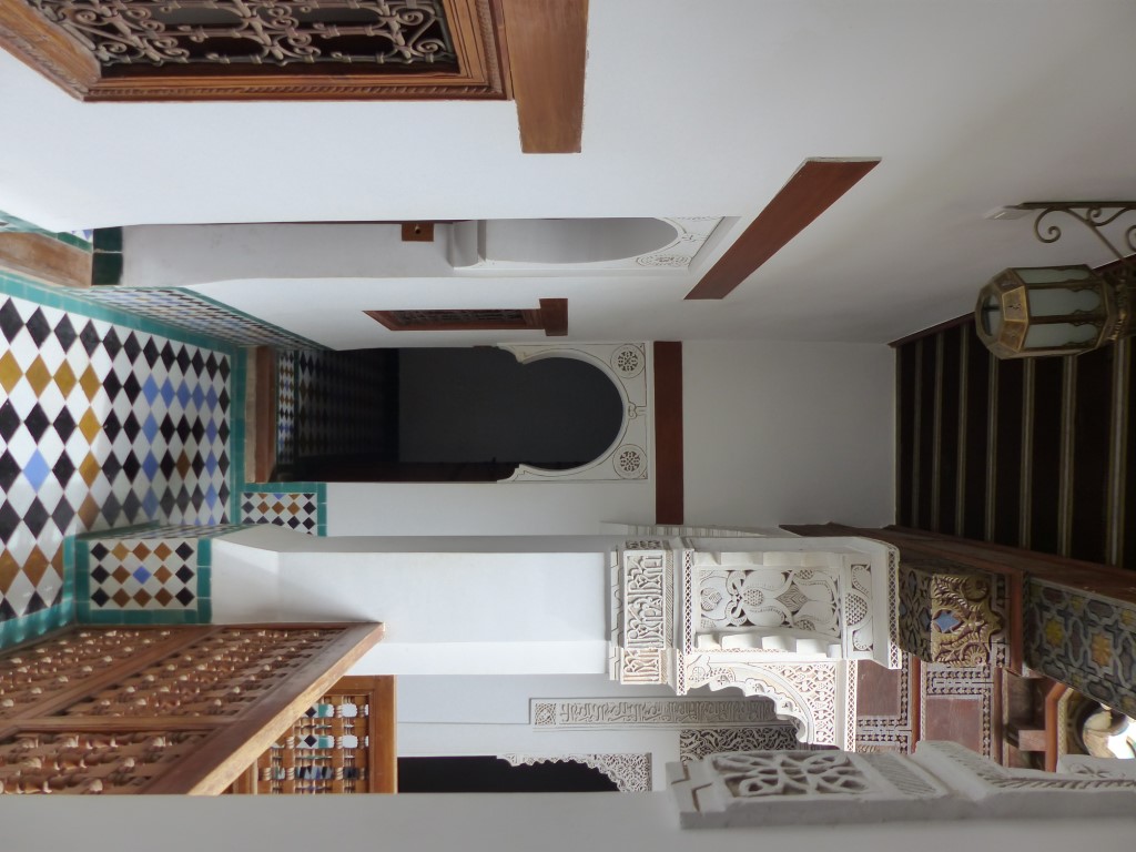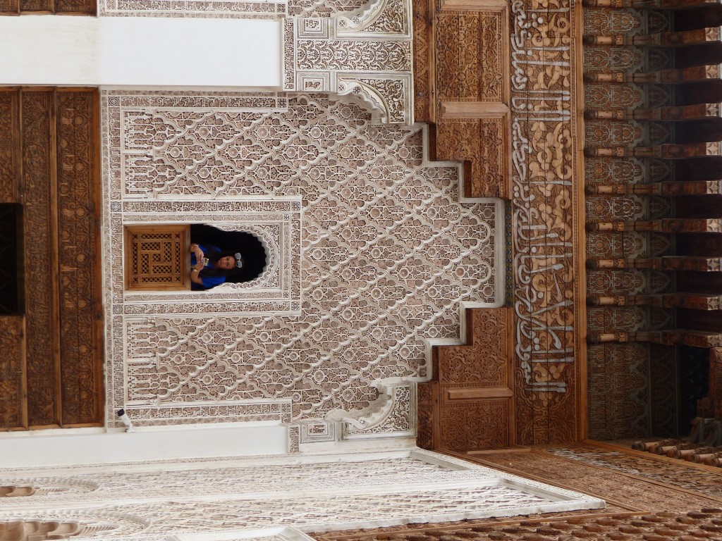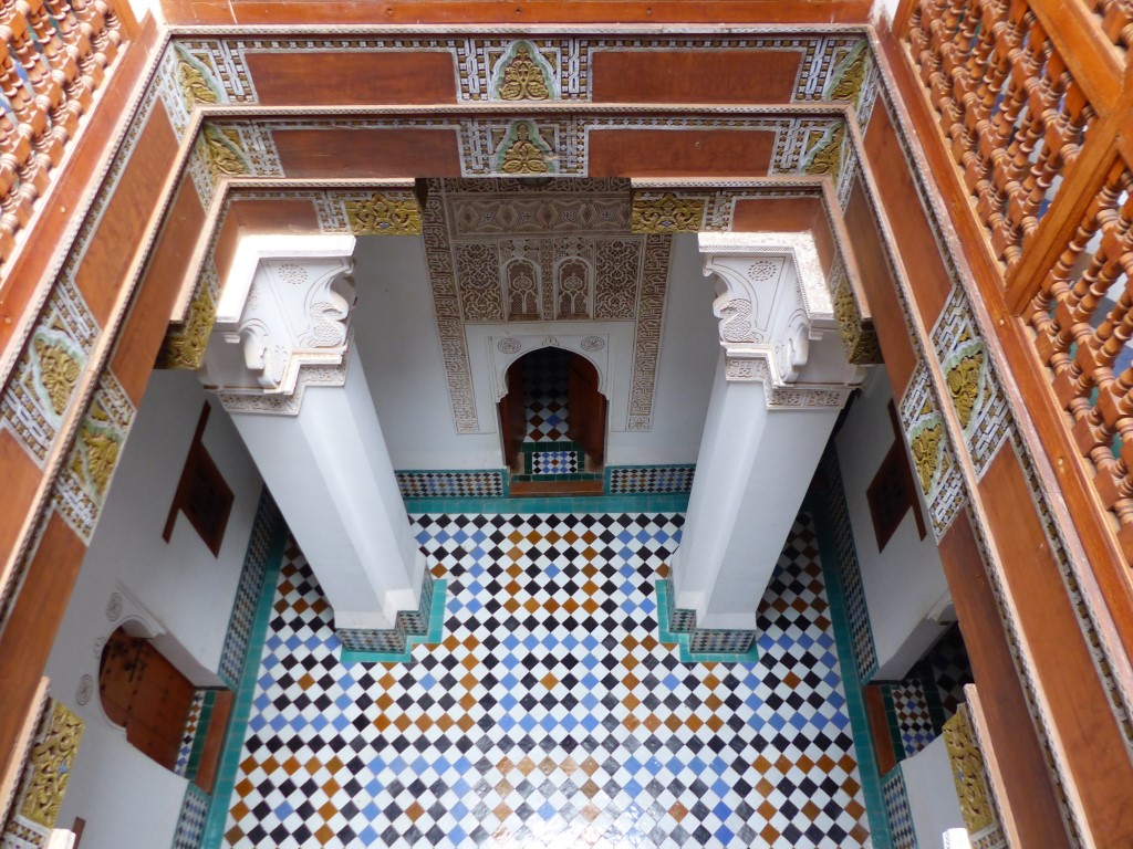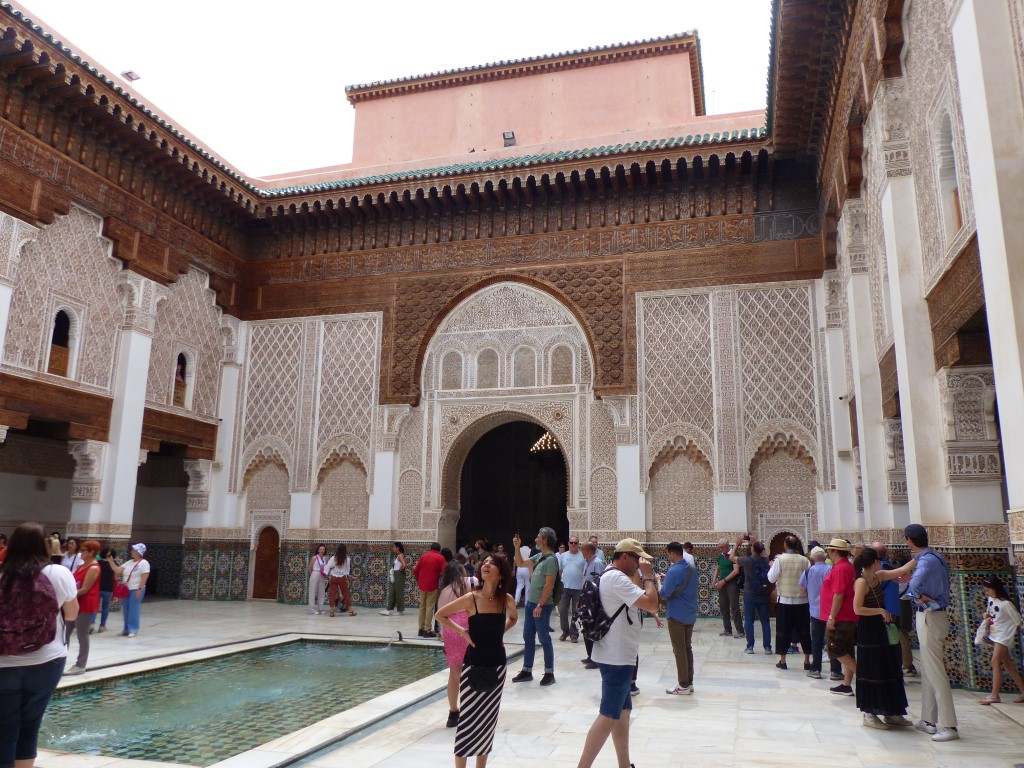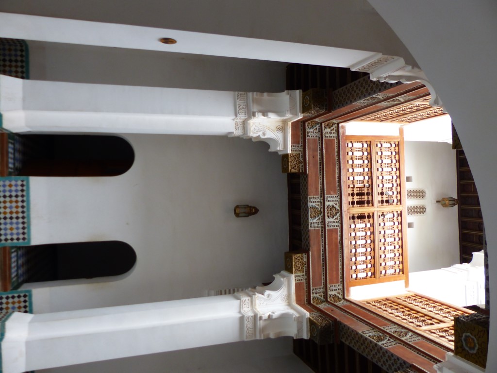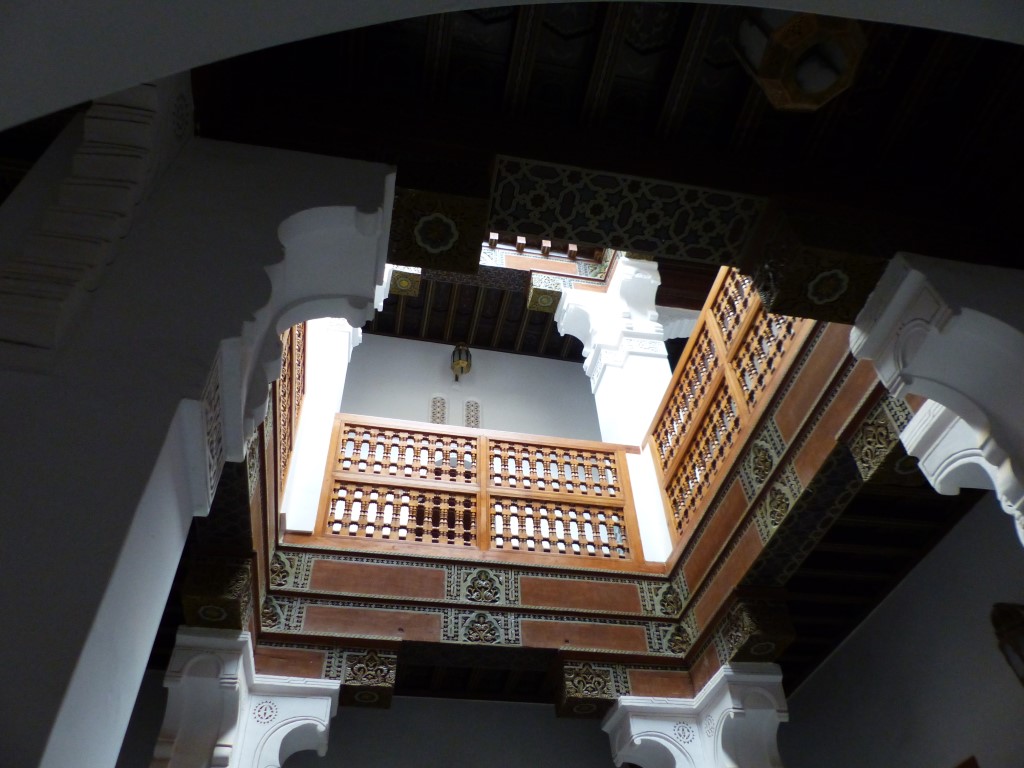 Nous allons visiter la Medersa Ben Youssef. C’est une école scientifique dans « divers domaines, religieux notamment ». Elle date du 16ème siècle et comporte 136 chambres de petite taille, pour 350 étudiants environ.