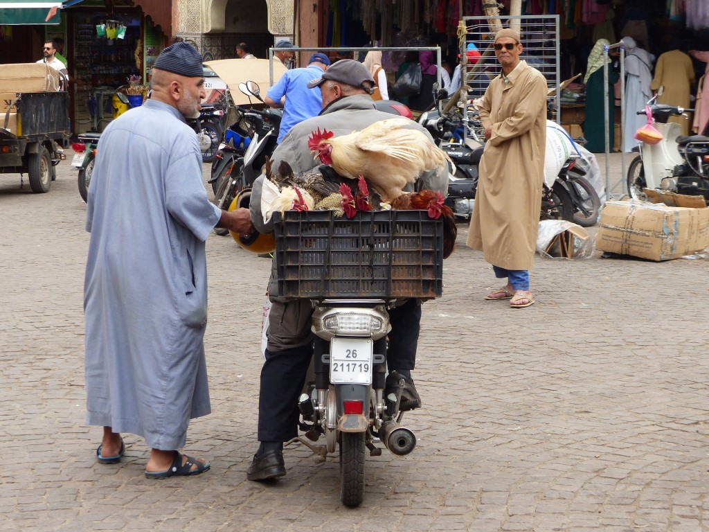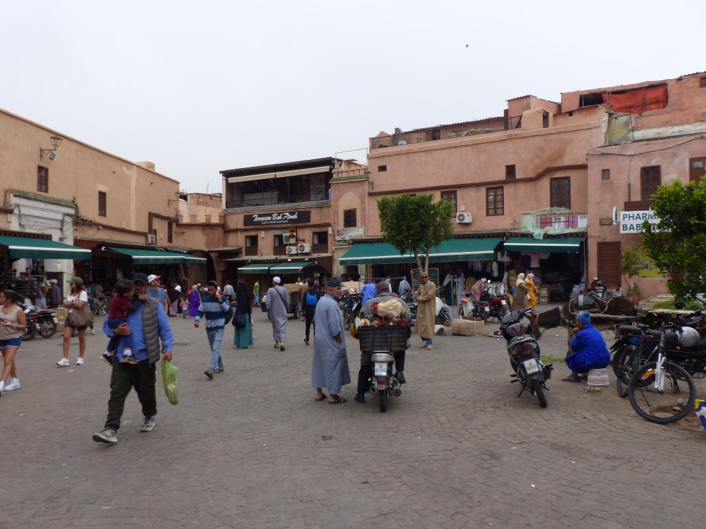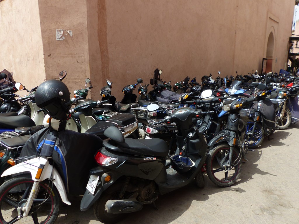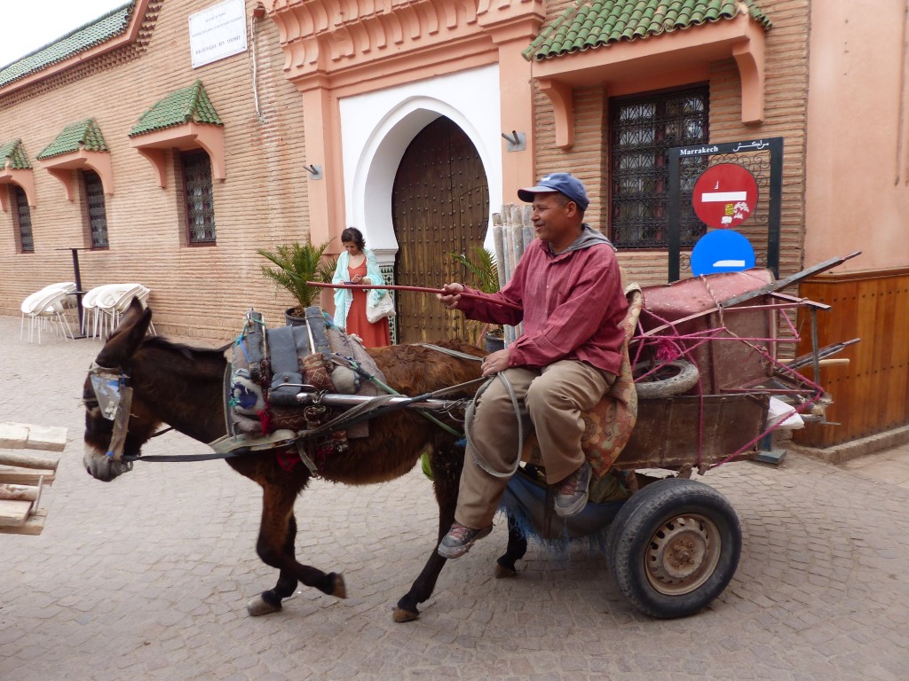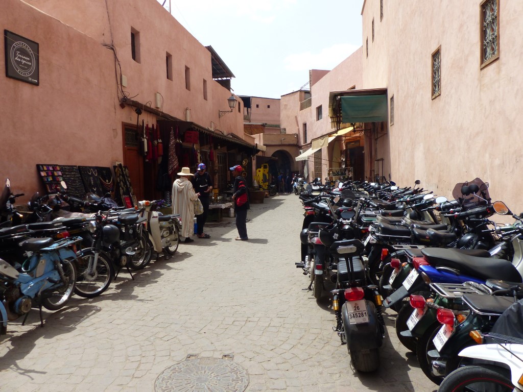 Nous nous rendons à Marrakech pour faire du change (bien meilleur taux qu'à l'aéroport) - compter environ 10 dirhams pour 1 euro. Eh bien c'est du sport Marrakech! Les deux roues comme les voitures ne semblent tenir compte d'aucun code de la route. Il faut surveiller ses rétros de droite et de gauche et faire la sourde oreille aux klaxons qui vous invitent lourdement à changer d'air!