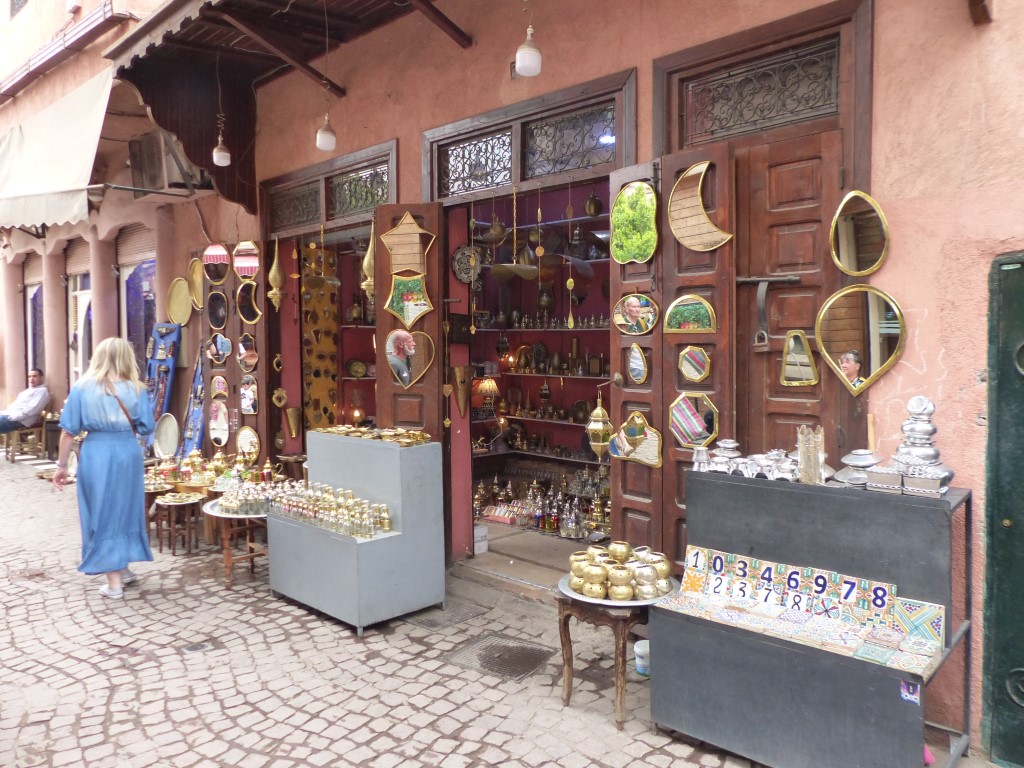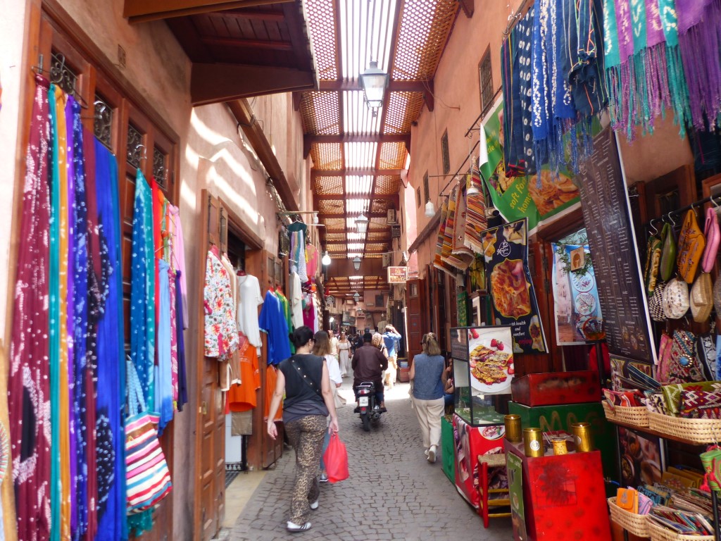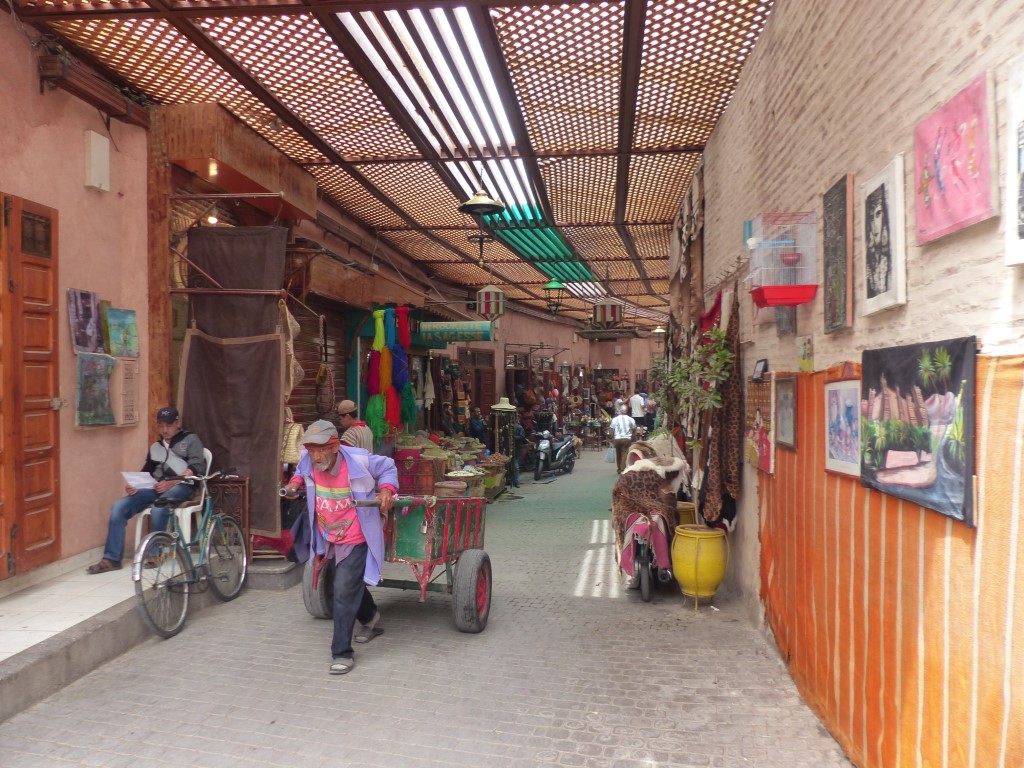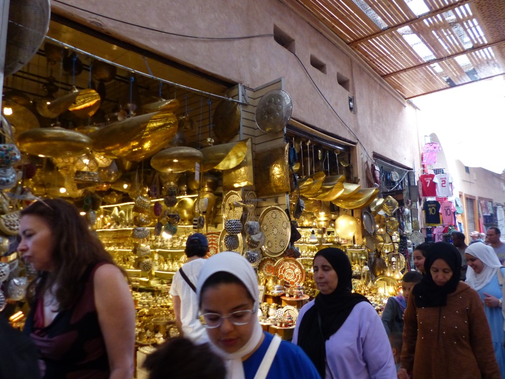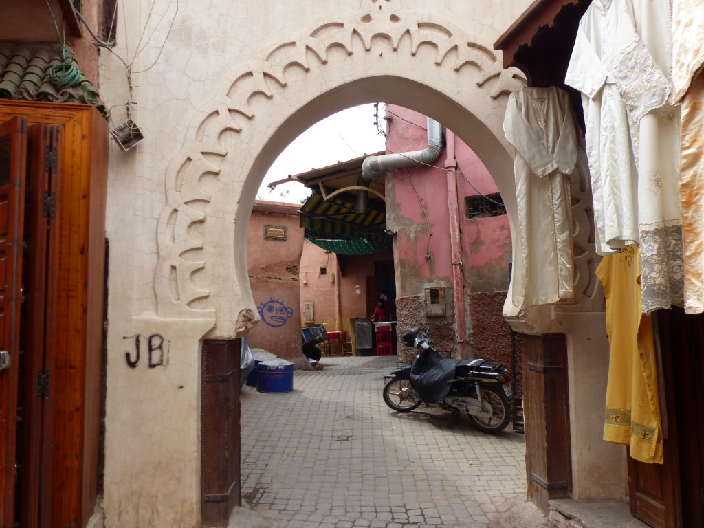Nous nous rendons à Marrakech pour faire du change (bien meilleur taux qu'à l'aéroport) - compter environ 10 dirhams pour 1 euro. Eh bien c'est du sport Marrakech! Les deux roues comme les voitures ne semblent tenir compte d'aucun code de la route. Il faut surveiller ses rétros de droite et de gauche et faire la sourde oreille aux klaxons qui vous invitent lourdement à changer d'air!