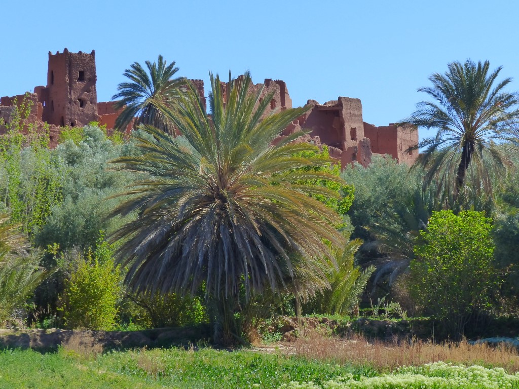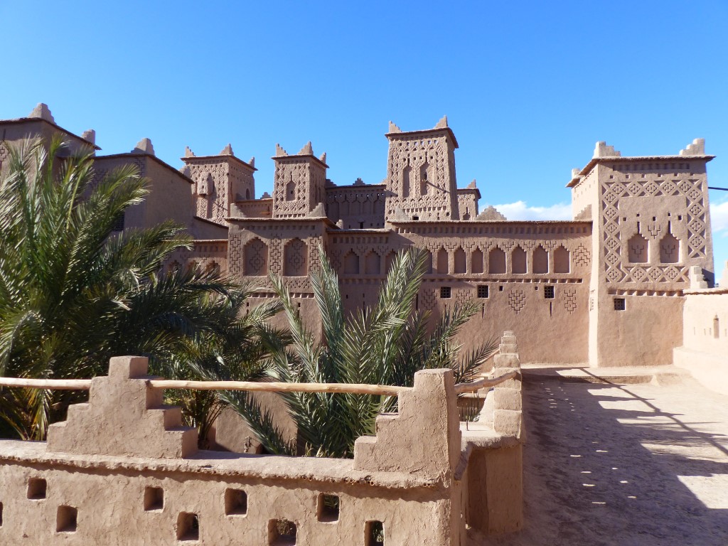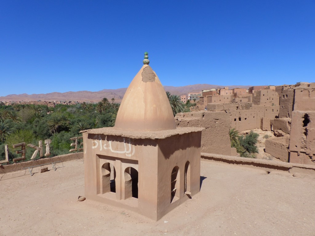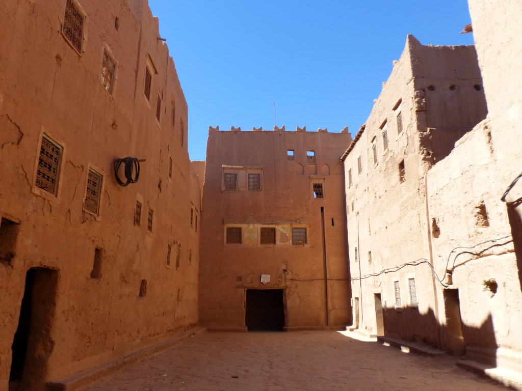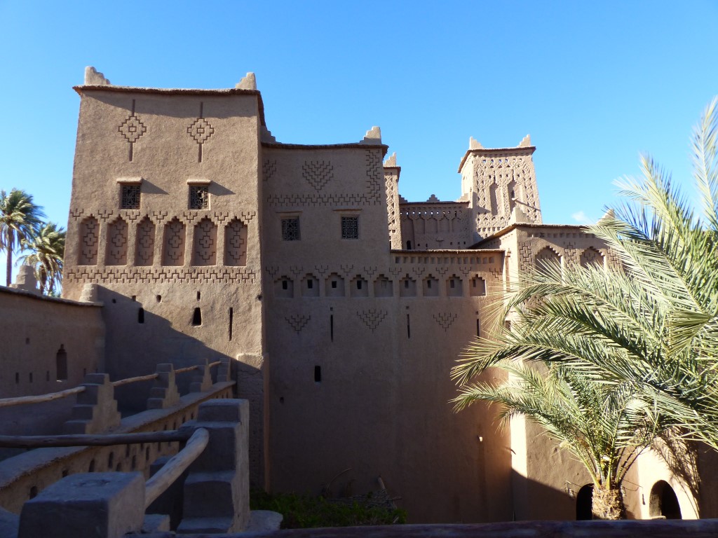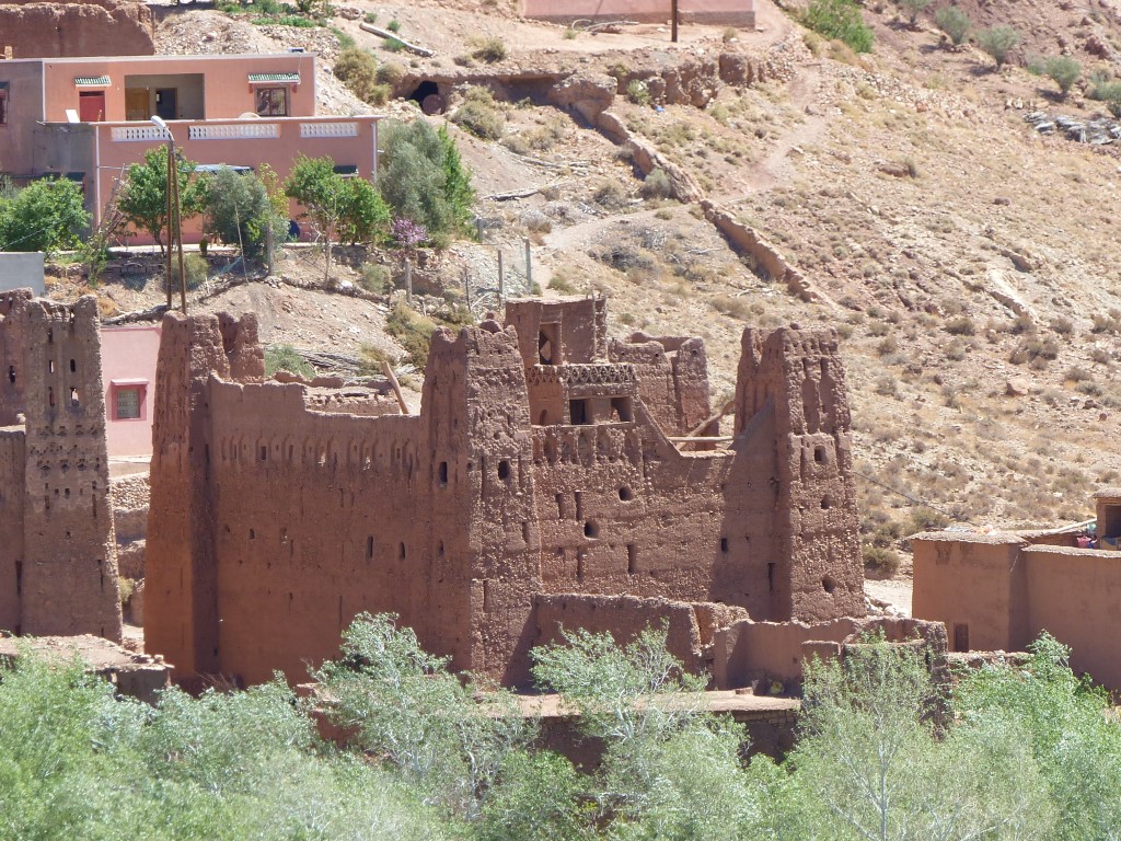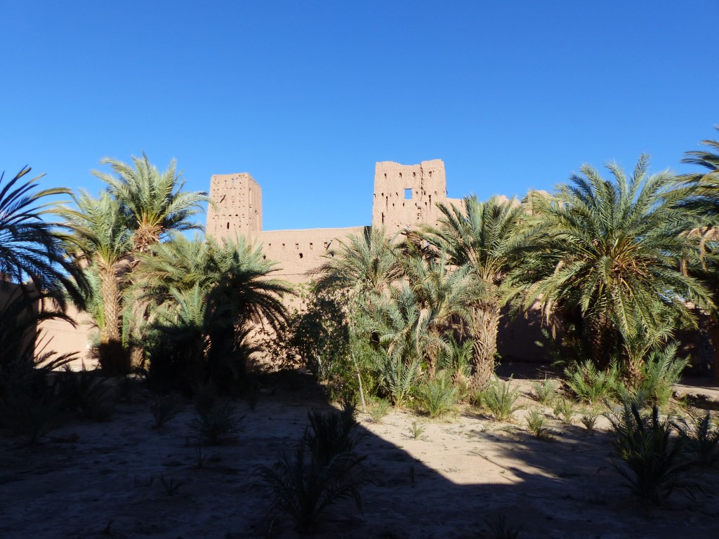 Nous reprenons la voiture et rejoignons les environs de Skoura et sa palmeraie grande de 500 hectares et d’une population de 30 000 habitants. Elle souffre ces dernières années de la sécheresse et d’un ver qui profite de la fatigue des arbres pour proliférer. Nous visitons une Kasbah appartenant à la même famille depuis 7 siècles ! Le guide qui nous accompagne rend cette visite belle et culturelle. Ce lieu figure sur les billets de 50 dirhams. La kasbah est la maison de la famille (jusqu’à 4 épouses pour un homme). Chaque épouse, et sa descendance, dispose d’un espace qui lui est propre (4 cuisines donc + une autre commune pour les jours de réception), chacune se côtoyant mais vivant séparément.