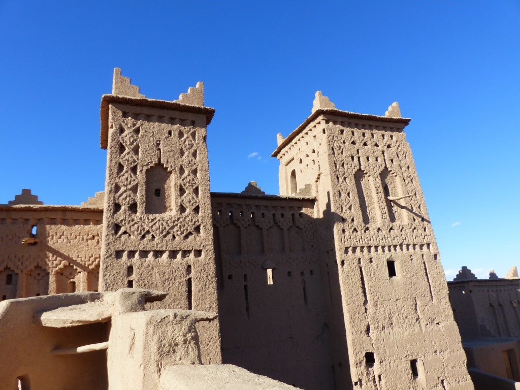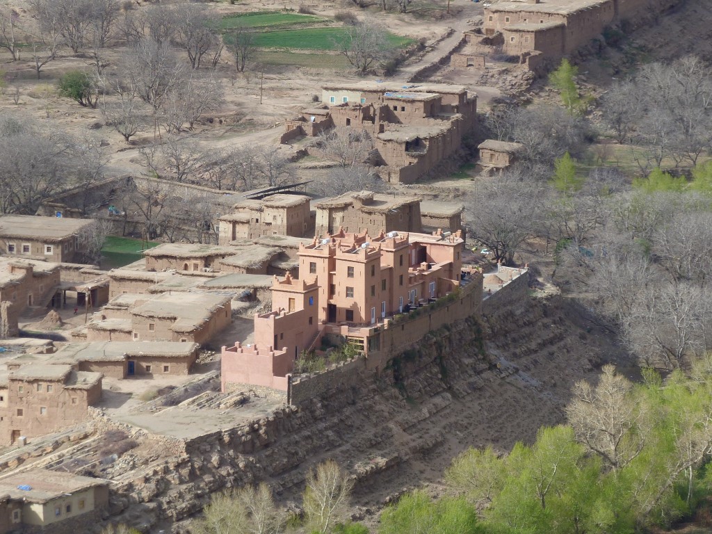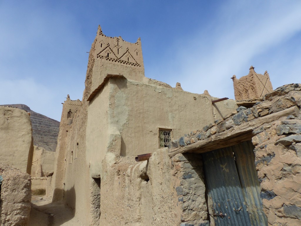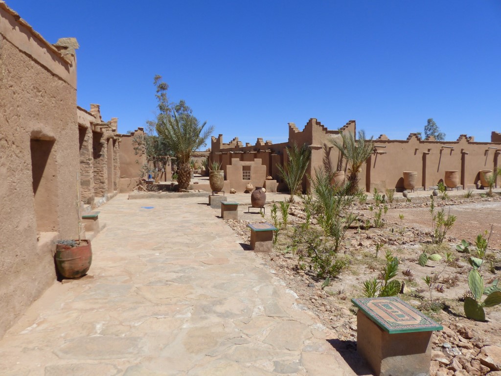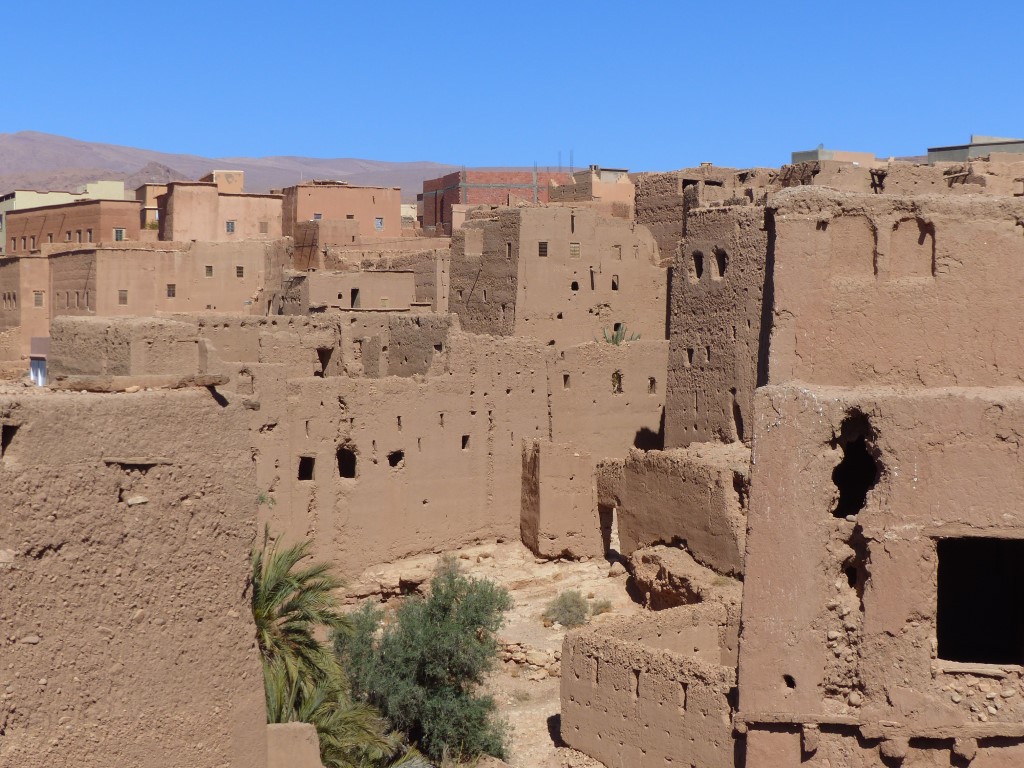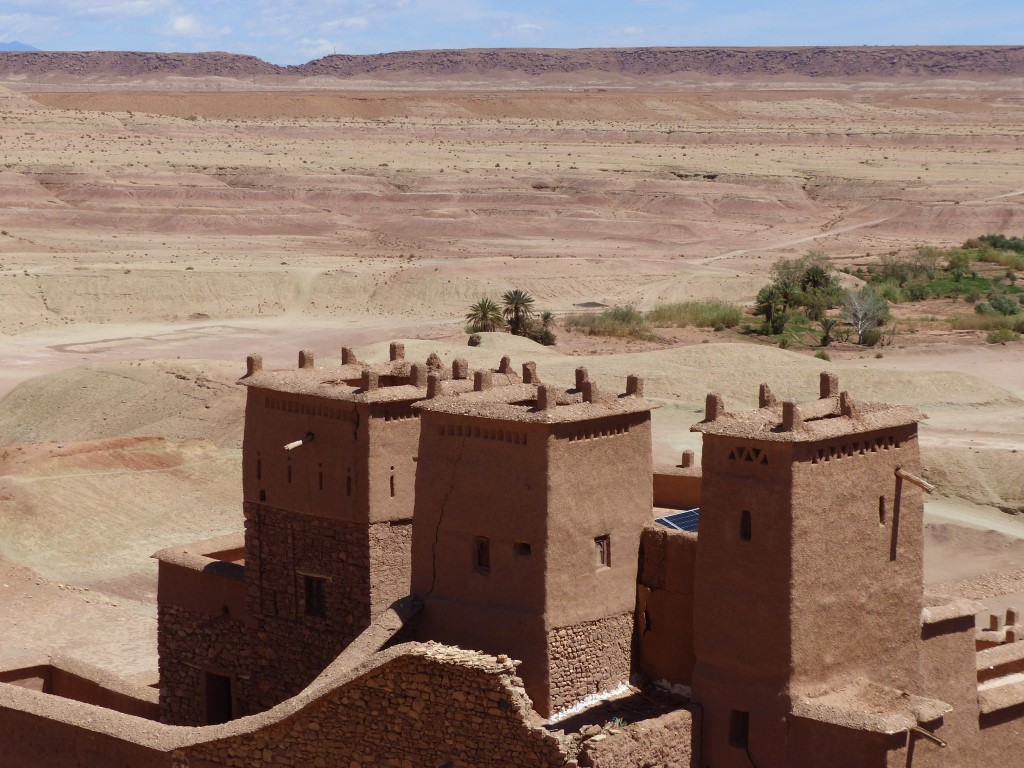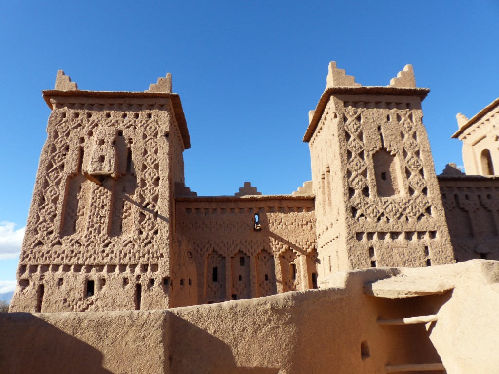 Nous reprenons la voiture et rejoignons les environs de Skoura et sa palmeraie grande de 500 hectares et d’une population de 30 000 habitants. Elle souffre ces dernières années de la sécheresse et d’un ver qui profite de la fatigue des arbres pour proliférer. Nous visitons une Kasbah appartenant à la même famille depuis 7 siècles ! Le guide qui nous accompagne rend cette visite belle et culturelle. Ce lieu figure sur les billets de 50 dirhams. La kasbah est la maison de la famille (jusqu’à 4 épouses pour un homme). Chaque épouse, et sa descendance, dispose d’un espace qui lui est propre (4 cuisines donc + une autre commune pour les jours de réception), chacune se côtoyant mais vivant séparément.