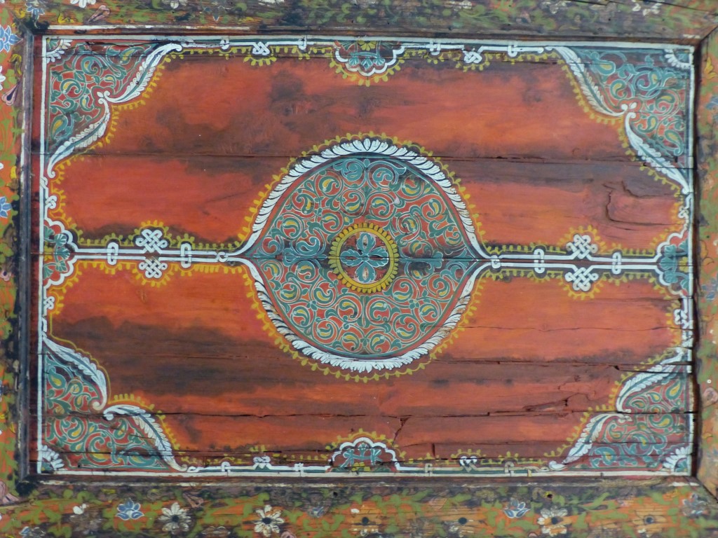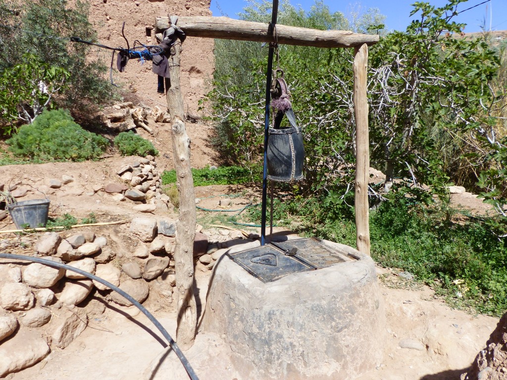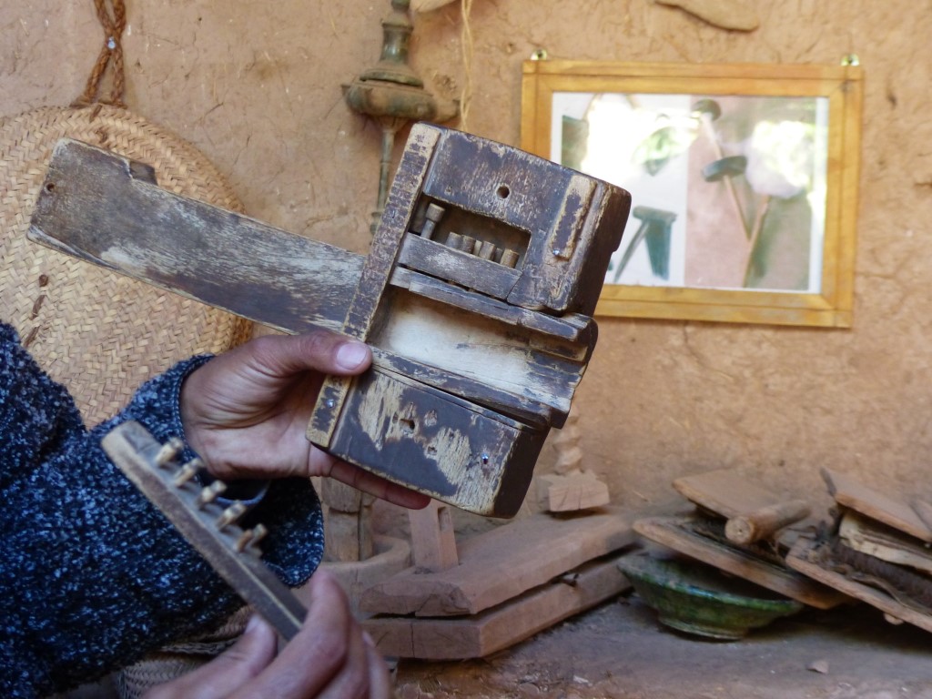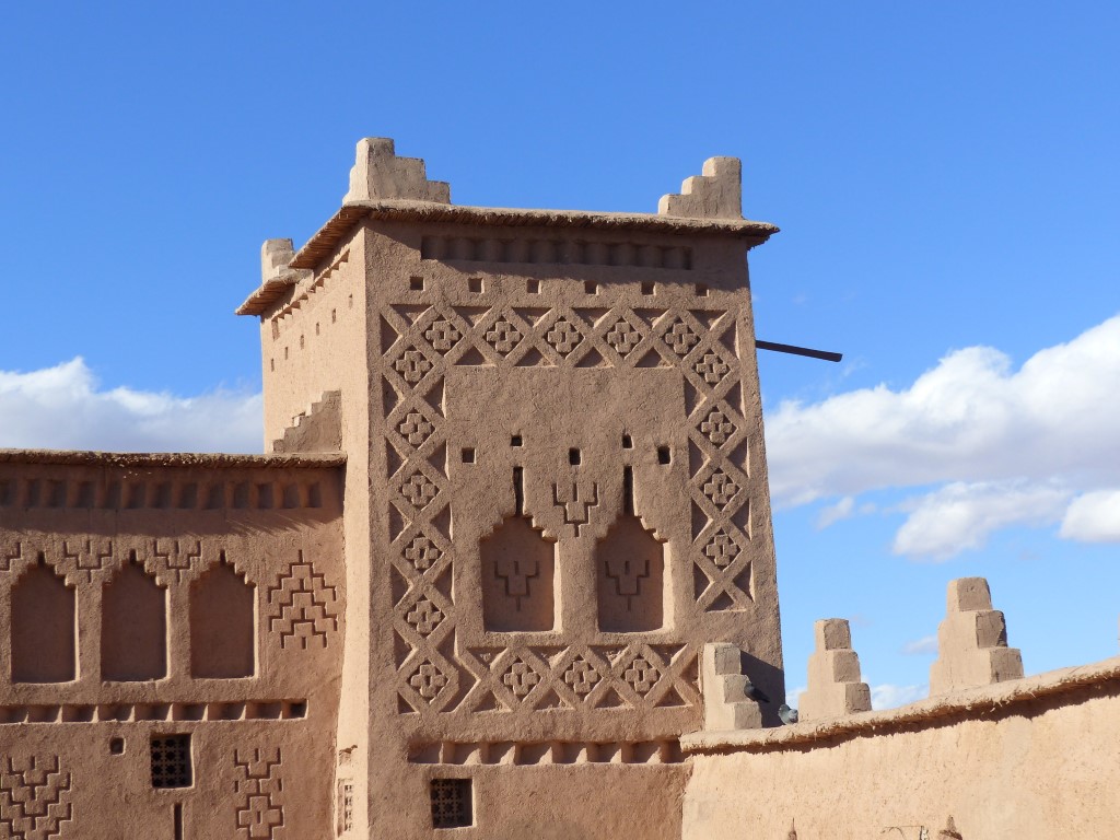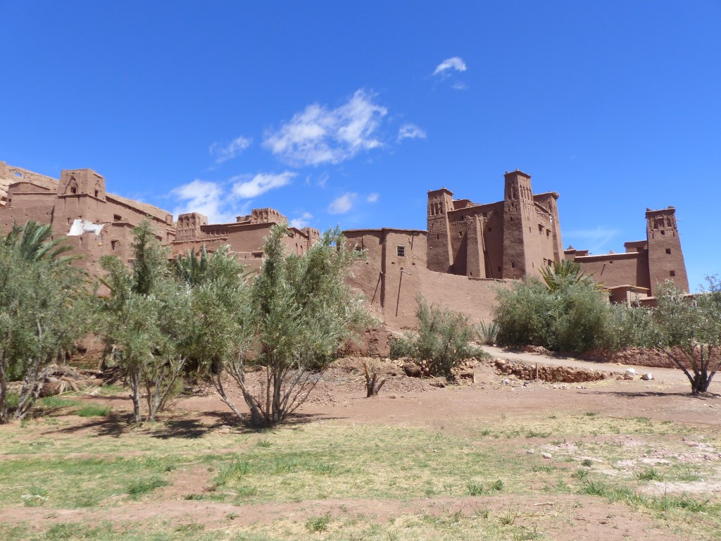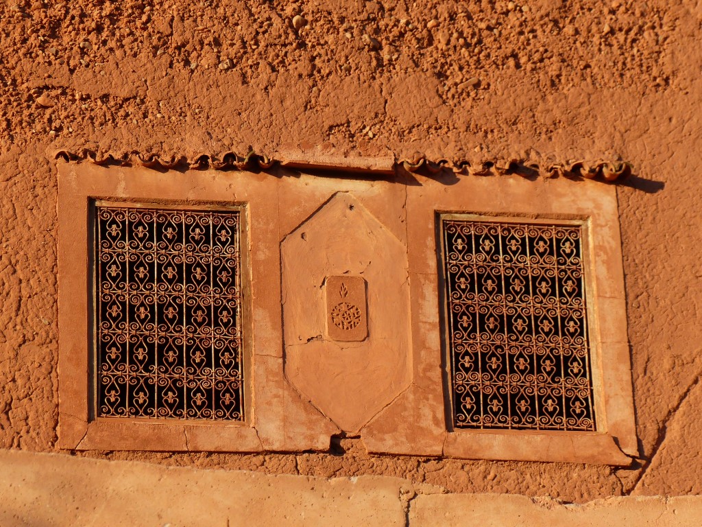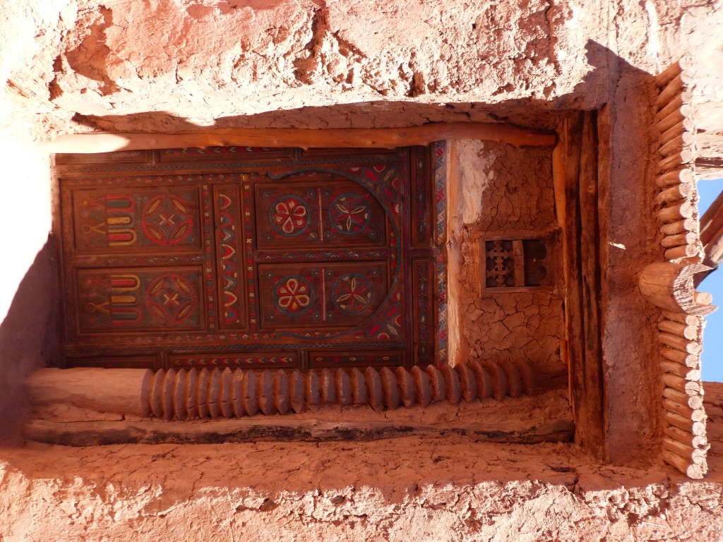 Nous reprenons la voiture et rejoignons les environs de Skoura et sa palmeraie grande de 500 hectares et d’une population de 30 000 habitants. Elle souffre ces dernières années de la sécheresse et d’un ver qui profite de la fatigue des arbres pour proliférer. Nous visitons une Kasbah appartenant à la même famille depuis 7 siècles ! Le guide qui nous accompagne rend cette visite belle et culturelle. Ce lieu figure sur les billets de 50 dirhams. La kasbah est la maison de la famille (jusqu’à 4 épouses pour un homme). Chaque épouse, et sa descendance, dispose d’un espace qui lui est propre (4 cuisines donc + une autre commune pour les jours de réception), chacune se côtoyant mais vivant séparément.
