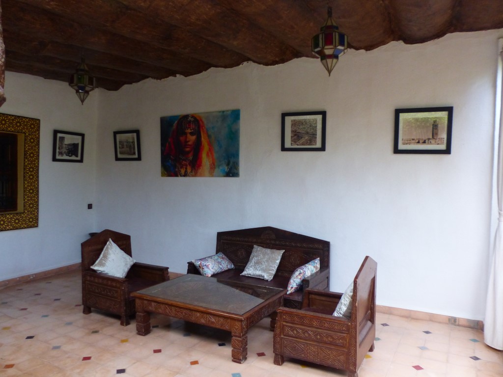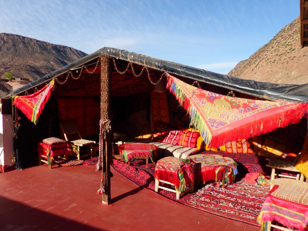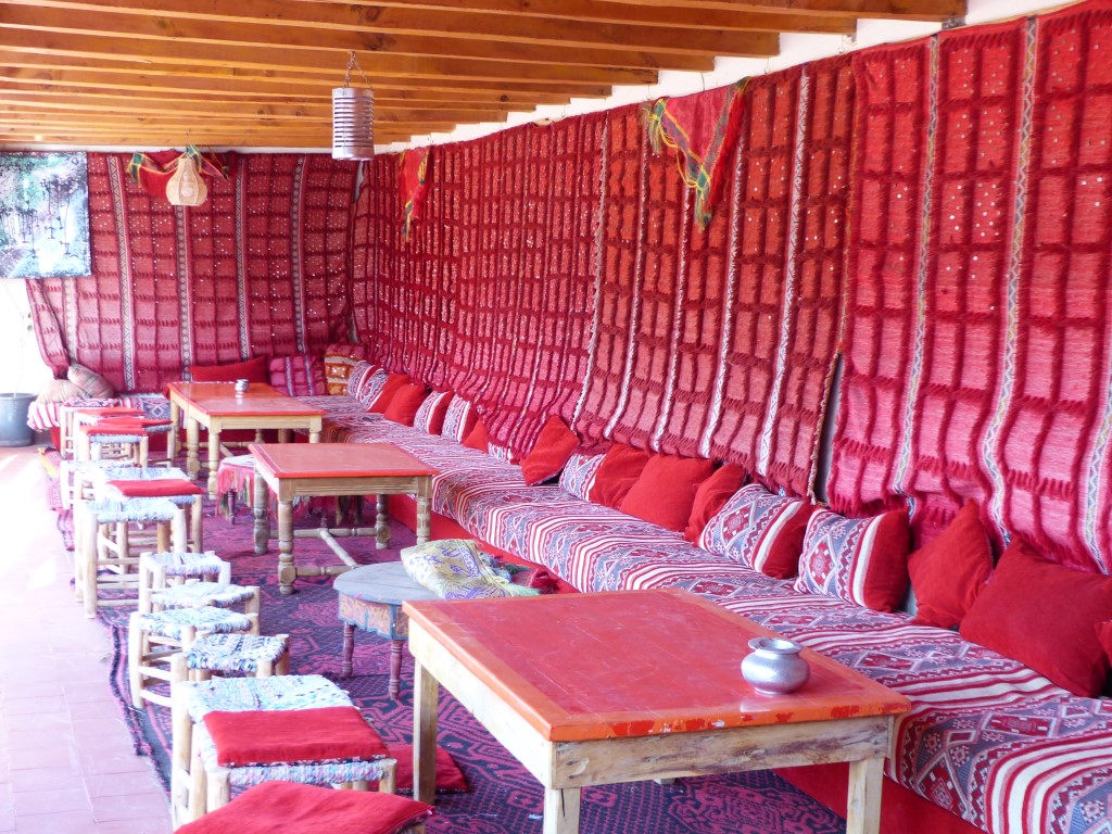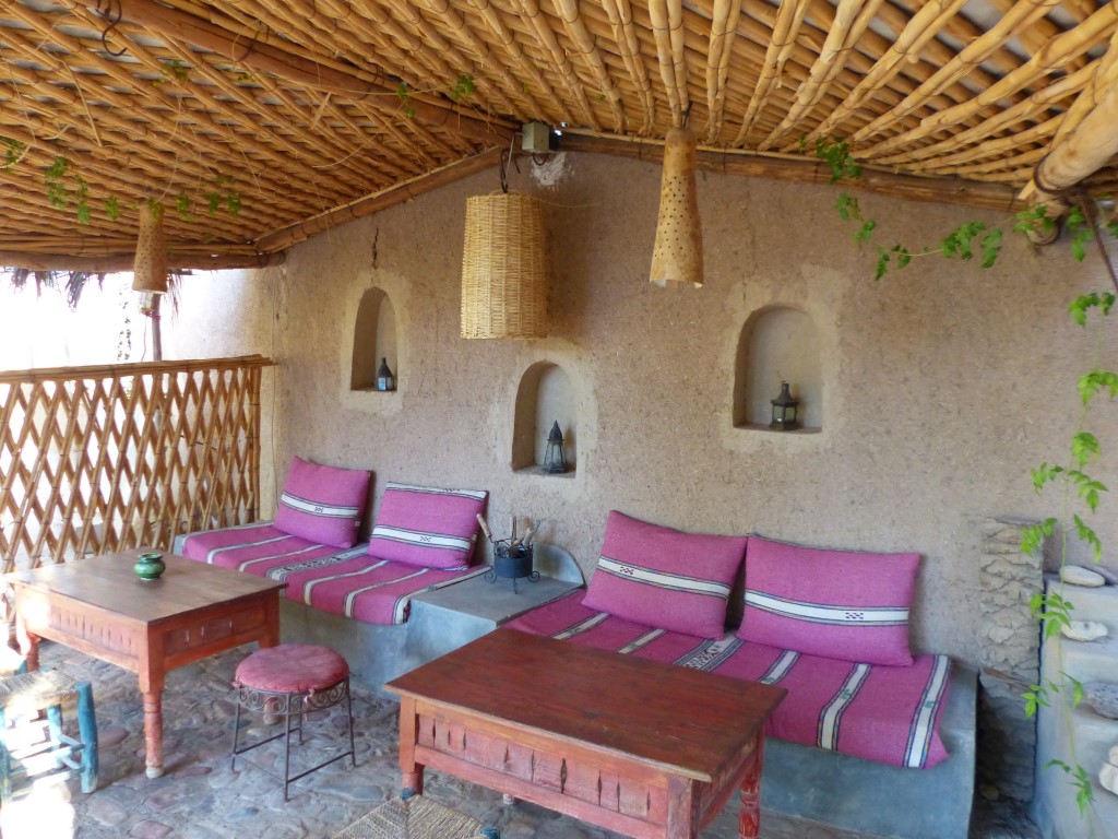Très beau soleil ce matin, il fait même chaud lorsque nous nous rendons sur le toit du gite pour visiter la terrasse où est disposé un espace type "tente berbère" et des canapés.