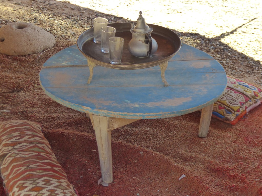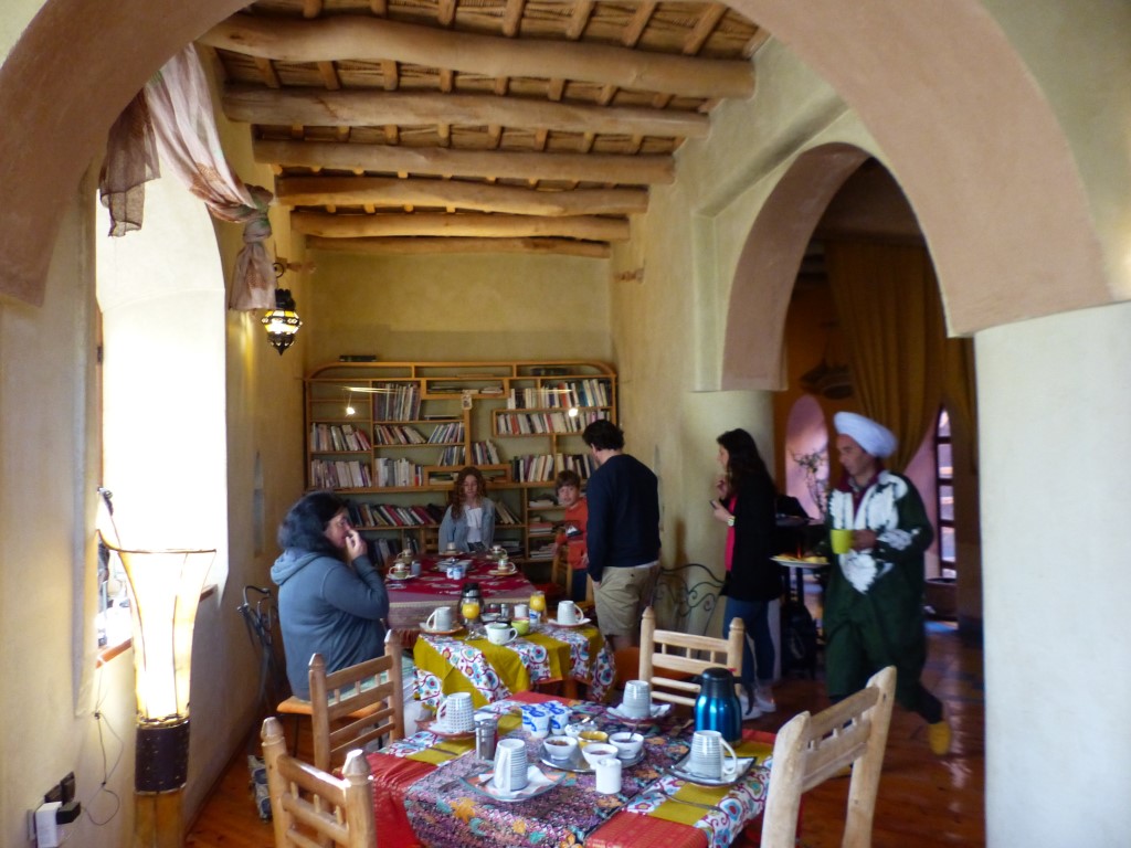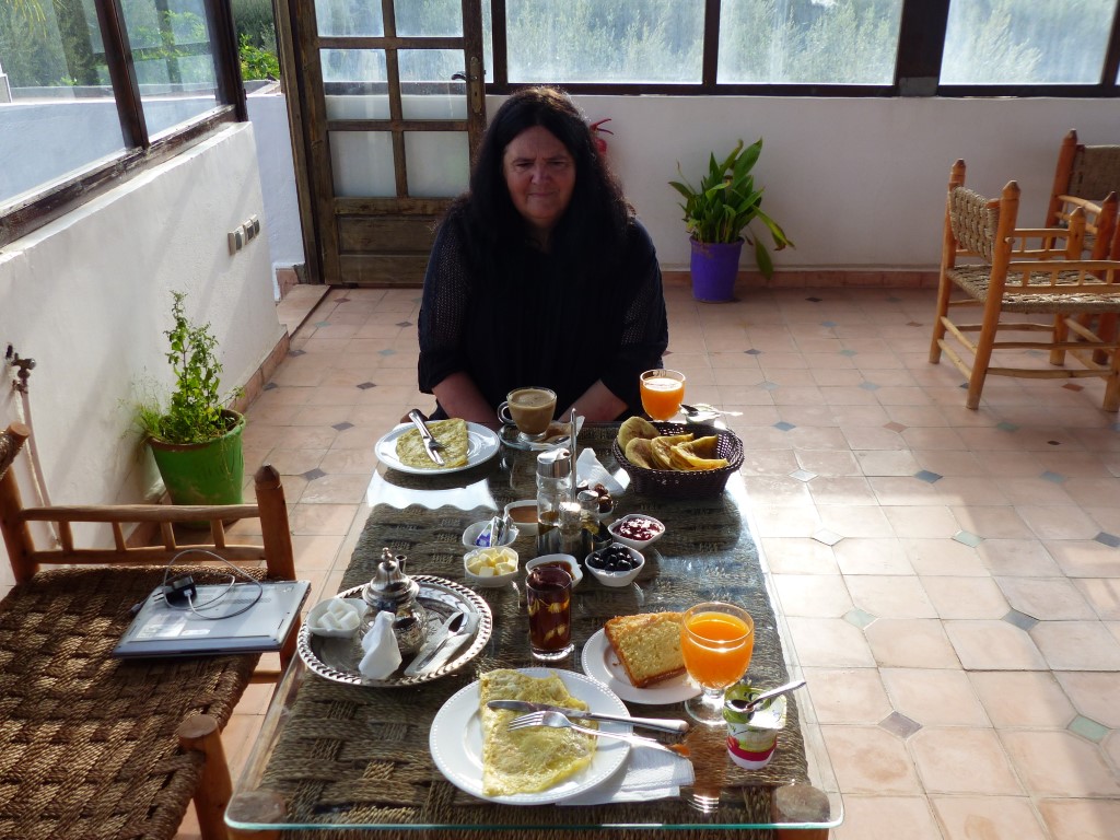 Le petit déjeuner est servi dans le jardin. Cela fait quatre jours qu’il n’en a pas été ainsi selon le propriétaire, un jurassien, car il a plu et il a fait froid jusqu’alors. Inédit de cette étape, nous avons des crêpes « françaises » qui accompagnent les plus traditionnelles crêpes marocaines.