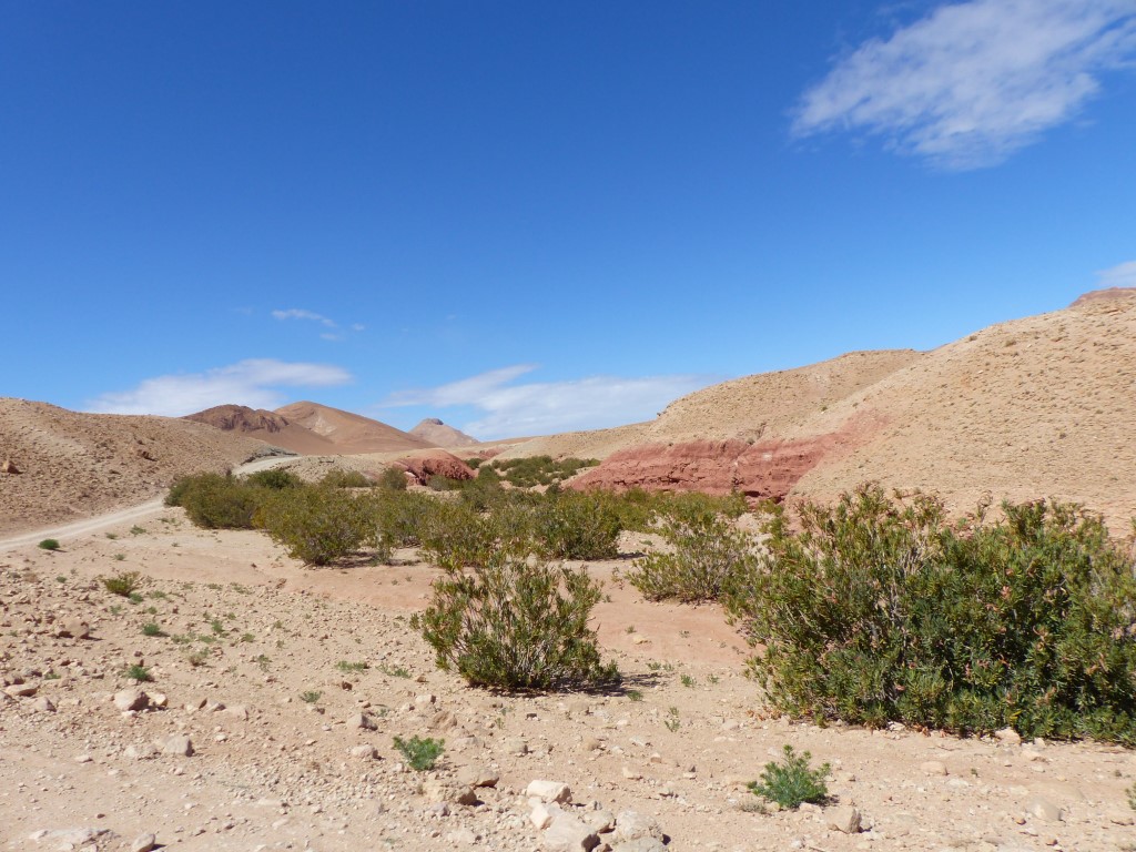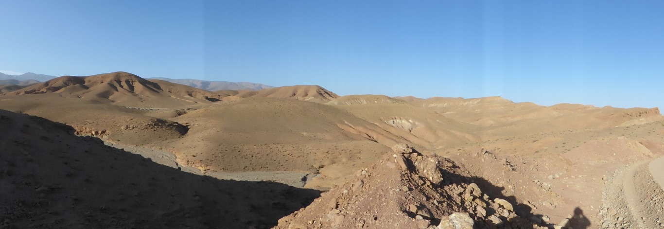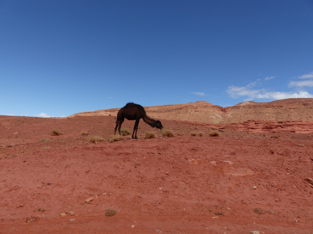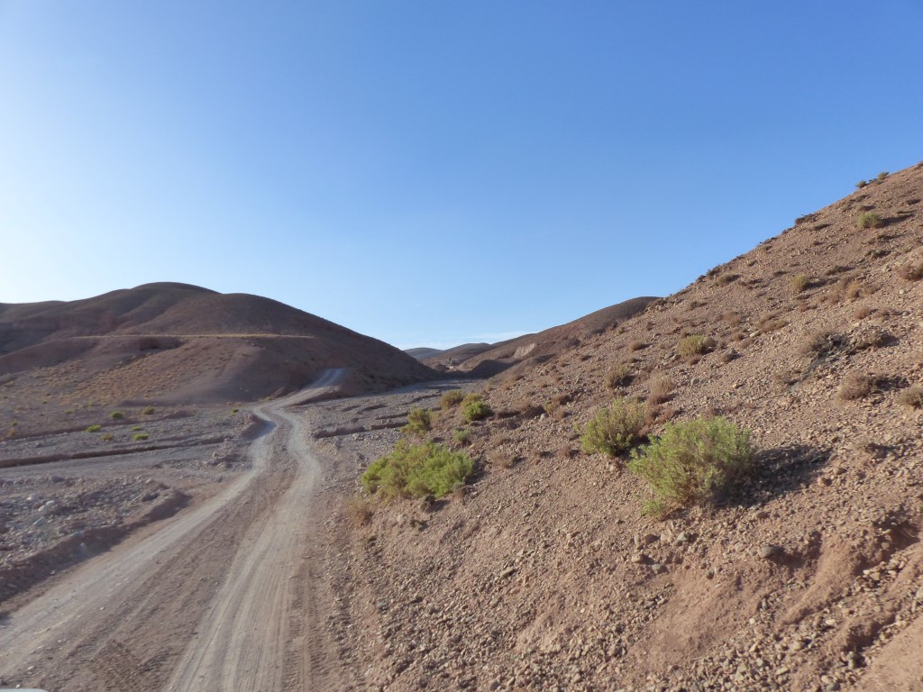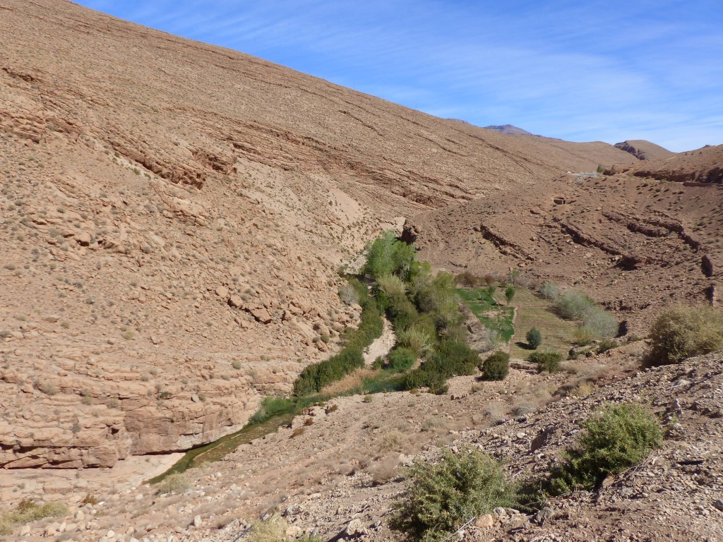 Sur la route nous stoppons à Demnate pour observer une arche naturelle. Il est 15h00, nous déjeunons d'une délicieuse omelette berbère (oignons frits, tomates et oeufs). Nous poursuivons la route vers Tabant en voulant emprunter une piste mentionnée sur le guide de Chris. Si le départ semble bien clair, le parcours ressemble ensuite moyennement à la description du guide; les embranchements n'y sont pas et aucune indication ne nous confirme l'itinéraire. Après presqu'une heure de route, fort jolie, nous décidons de faire demi-tour. Nous ne sommes pas sûrs d'être là où nous voudrions être et il se fait tard.