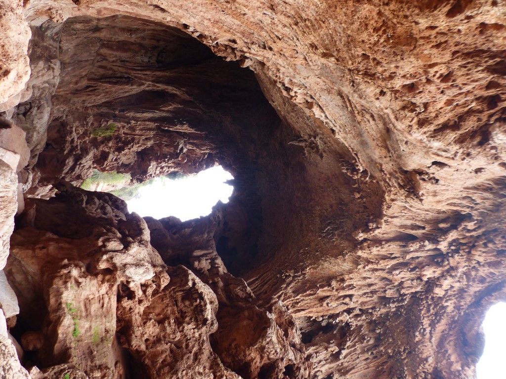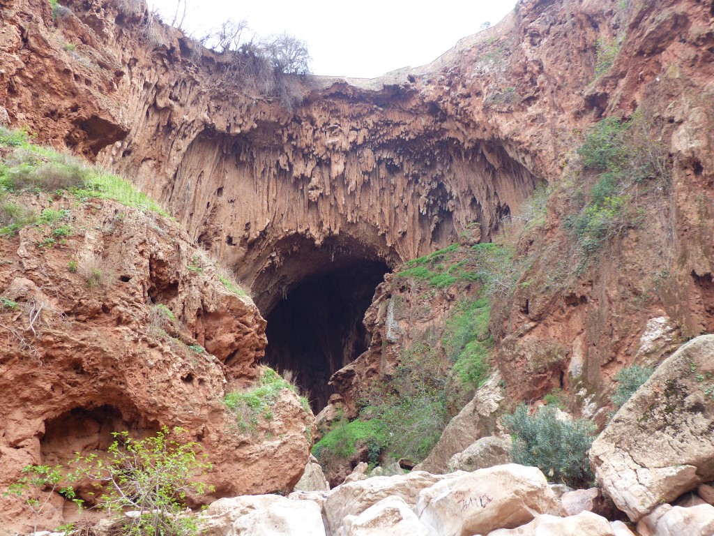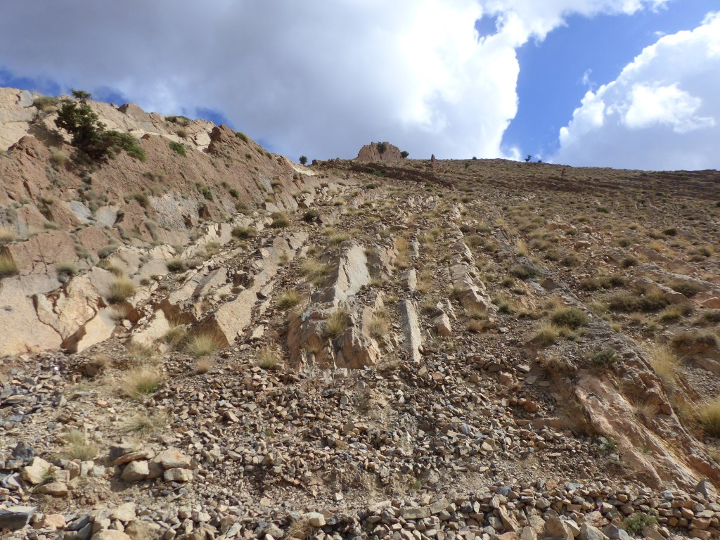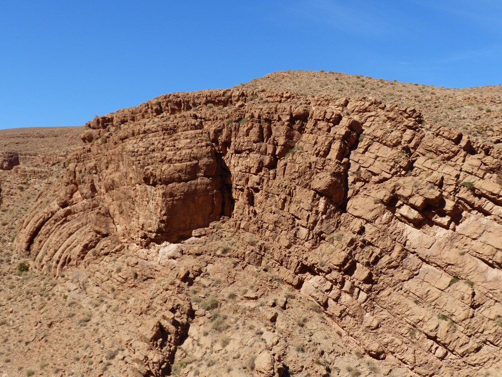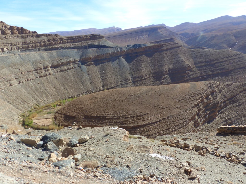Sur la route nous stoppons à Demnate pour observer une arche naturelle. Il est 15h00, nous déjeunons d'une délicieuse omelette berbère (oignons frits, tomates et oeufs). Nous poursuivons la route vers Tabant en voulant emprunter une piste mentionnée sur le guide de Chris. Si le départ semble bien clair, le parcours ressemble ensuite moyennement à la description du guide; les embranchements n'y sont pas et aucune indication ne nous confirme l'itinéraire. Après presqu'une heure de route, fort jolie, nous décidons de faire demi-tour. Nous ne sommes pas sûrs d'être là où nous voudrions être et il se fait tard.