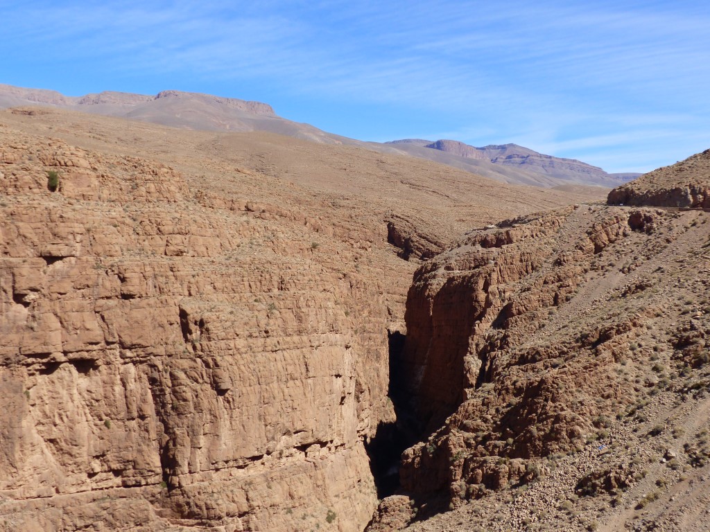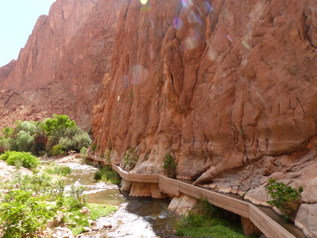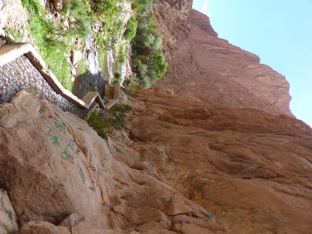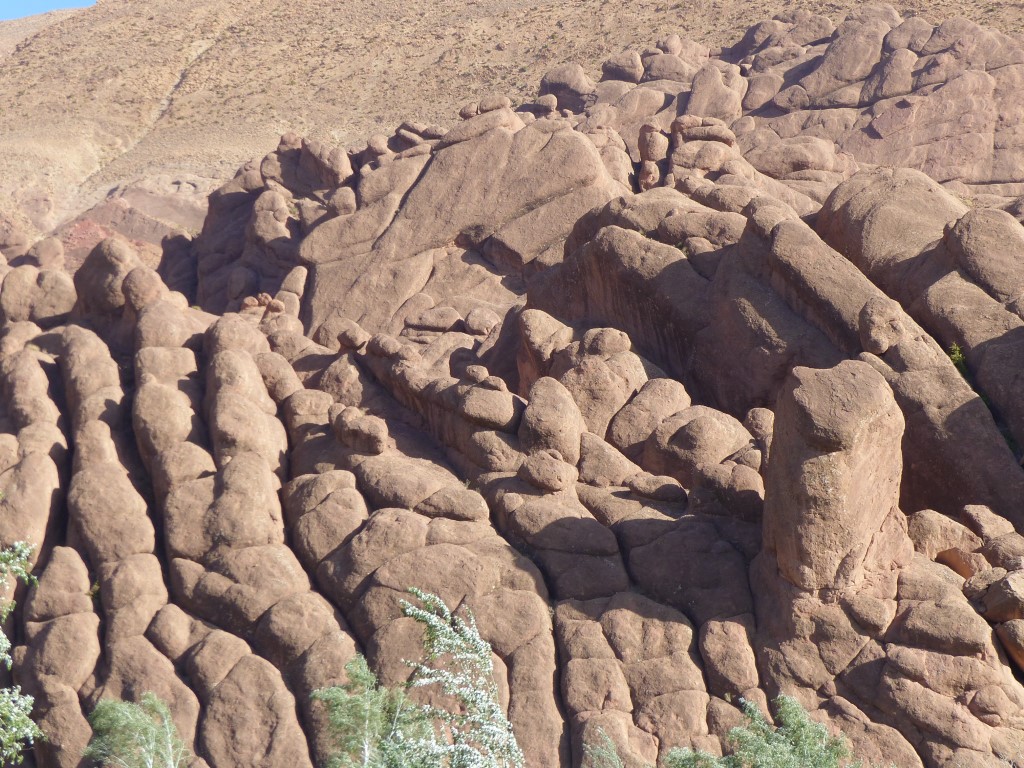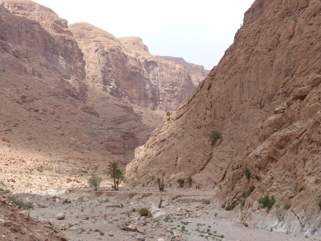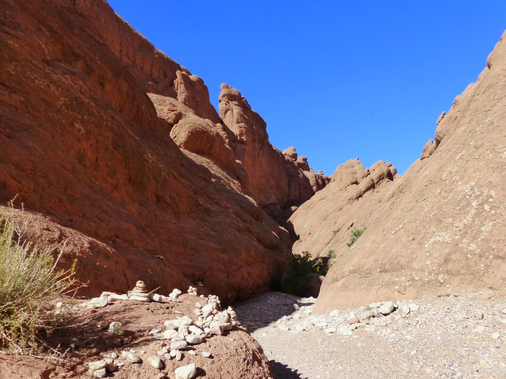 Nous entrons ensuite par la route dans la vallée du Dadès. Elles est bien moins encaissée que celle de la Todra (ou Todgha). Chemin faisant, nous atteignons un lieu donnant accès "aux doigts de singe". Ce lieu est l'occasion d'une randonnée dans un cours d'eau asséché, étroit et pas toujours très accessible. Nous évitons les guides auto-proclamés, mais pour une fois, ils auraient bien eu une utilité, car l’accès est mal indiqué, y compris par le routard. À l’intérieur du défilé, il ne faut pas jouer des épaules sinon ça frotte ! Il faut parfois escalader, parfois s’accroupir pour passer entre les rochers et les roches charriées par le cours d’eau. Le passage est interdit en cas de pluie car l’eau monte très vite et s’est facile à croire. Nous revenons sur nos pas pour retrouver la sortie du défilé (il faut 3 heures pour parcourir le circuit dans son ensemble, nous avons du y rester une bonne heure environ).