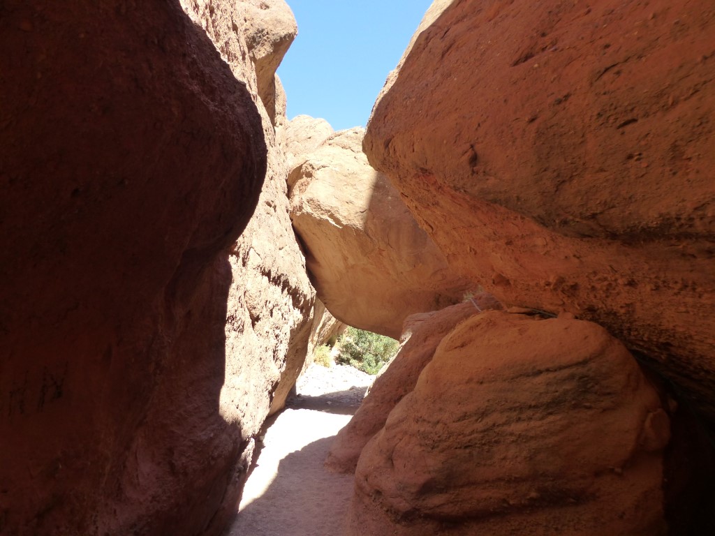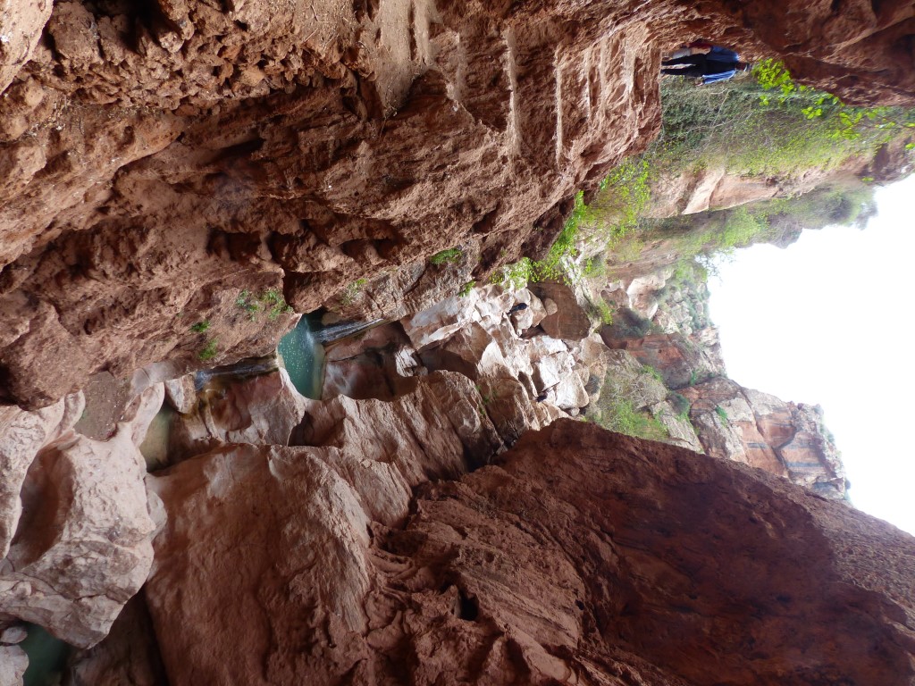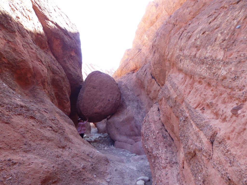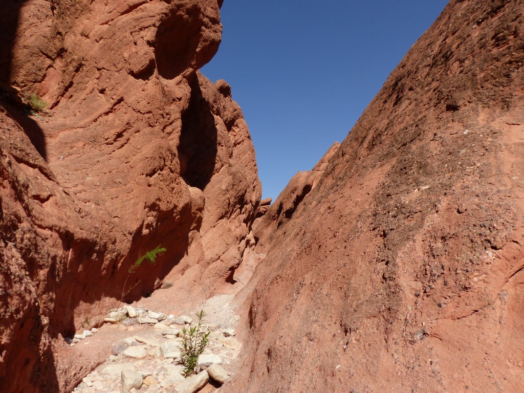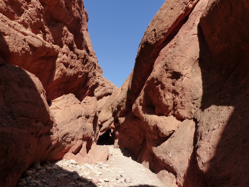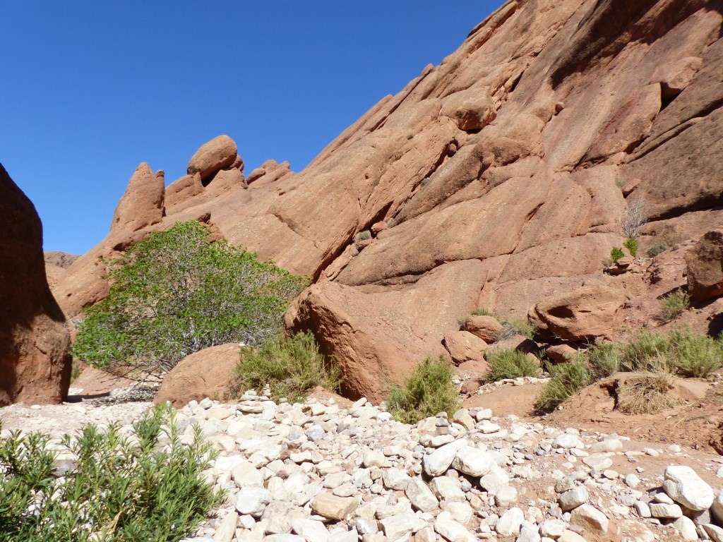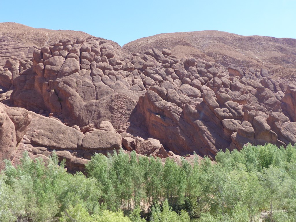 Nous entrons ensuite par la route dans la vallée du Dadès. Elles est bien moins encaissée que celle de la Todra (ou Todgha). Chemin faisant, nous atteignons un lieu donnant accès "aux doigts de singe". Ce lieu est l'occasion d'une randonnée dans un cours d'eau asséché, étroit et pas toujours très accessible. Nous évitons les guides auto-proclamés, mais pour une fois, ils auraient bien eu une utilité, car l’accès est mal indiqué, y compris par le routard. À l’intérieur du défilé, il ne faut pas jouer des épaules sinon ça frotte ! Il faut parfois escalader, parfois s’accroupir pour passer entre les rochers et les roches charriées par le cours d’eau. Le passage est interdit en cas de pluie car l’eau monte très vite et s’est facile à croire. Nous revenons sur nos pas pour retrouver la sortie du défilé (il faut 3 heures pour parcourir le circuit dans son ensemble, nous avons du y rester une bonne heure environ).
