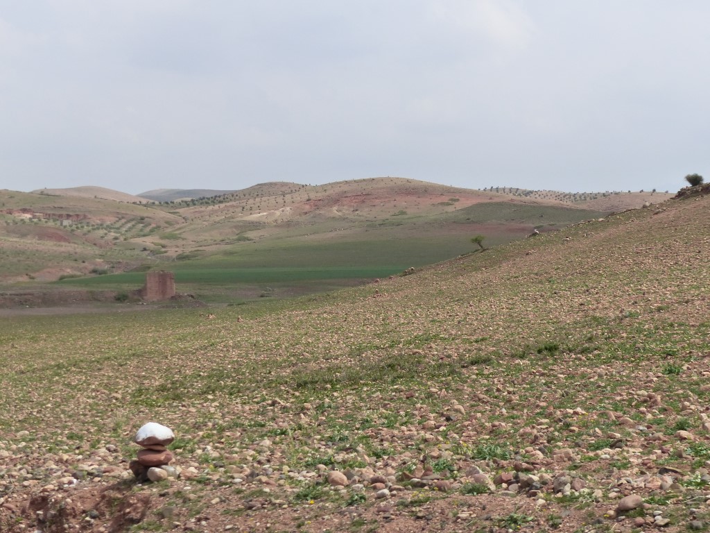 Nous nous perdons dans la campagne à la recherche d’une grotte indiquée sur Google Maps. Nous ne la trouverons pas. Peu importe. Nous continuons en direction du désert d’Agafay qui est encore loin. En route, nous remarquons que la campagne, bien verte, peu devenir brusquement caillouteuse et désertique. Le relief est devenu plat.