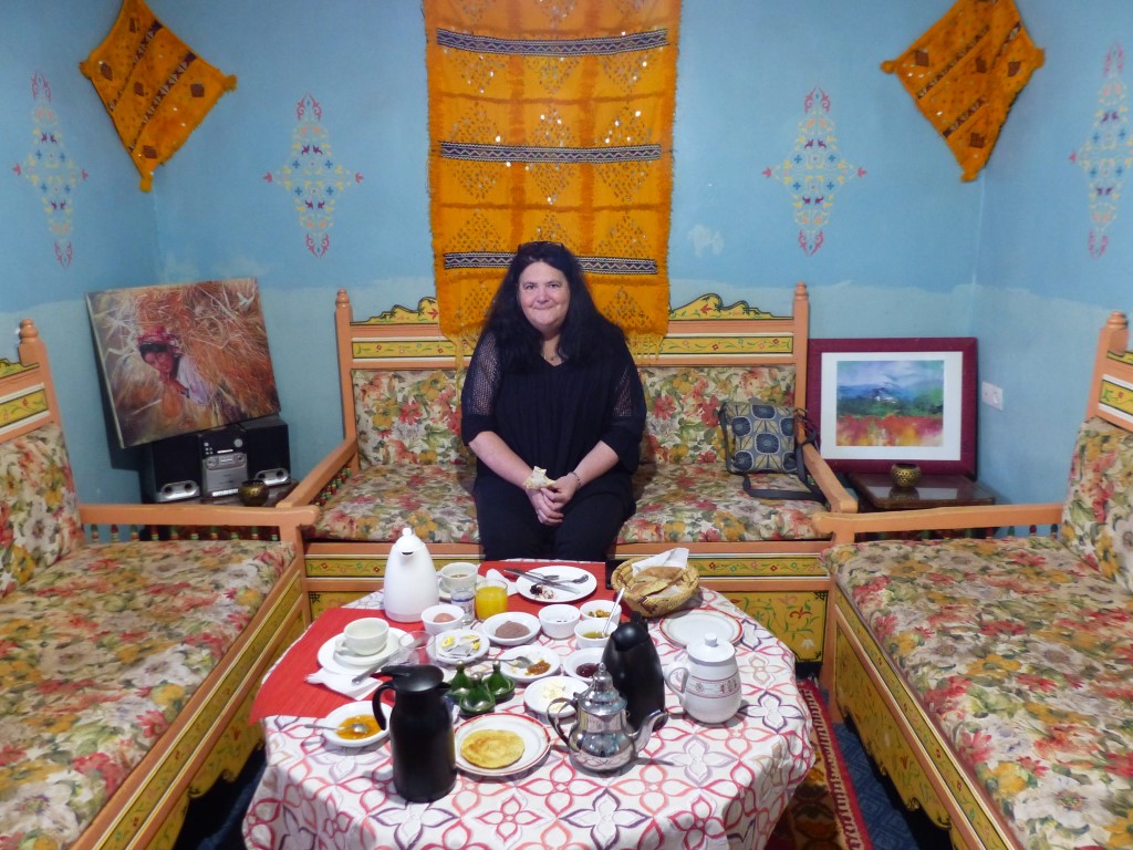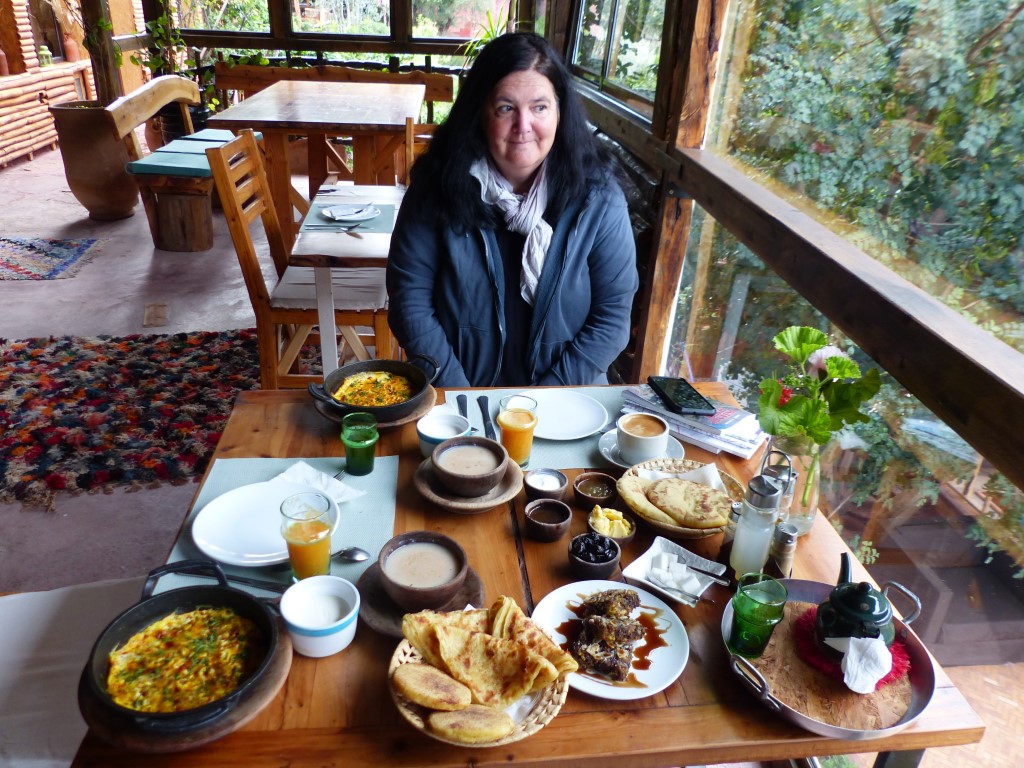 Le petit déjeuner est particulièrement copieux avec soupe d'orge (sorte de porridge), omelette berbère, crêpes, pain spécial (avec pomme de terre ?), miel, olives, gâteau, nous n'avons rien laissé mais nous sommes calés!