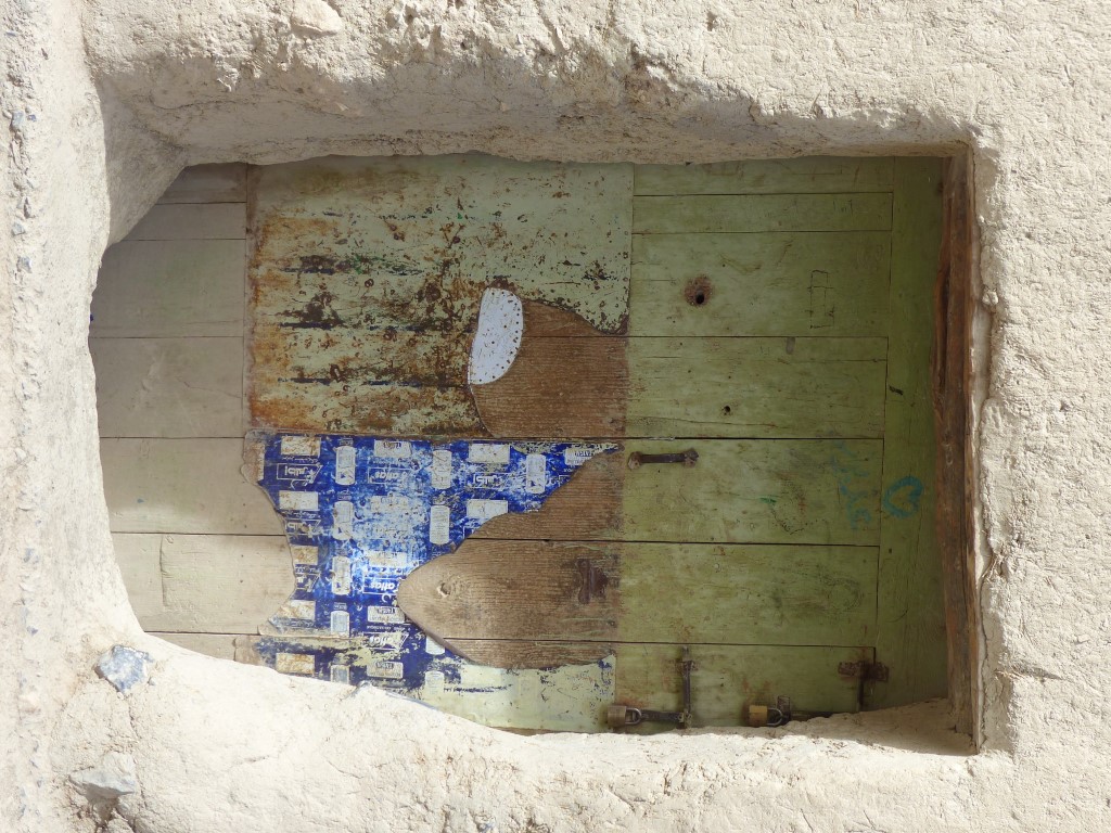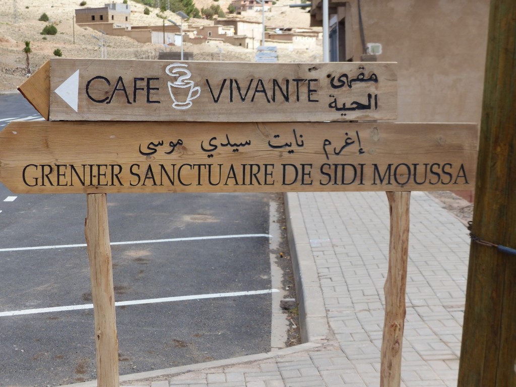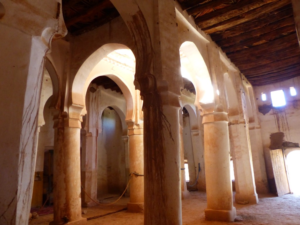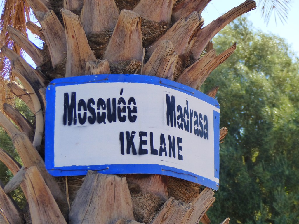 A la mosquée, nous rencontrons Addi, qui est le gardien-architecte des lieux. Il a été élève dans cette mosquée et aujourd'hui, il réhabilite le bâtiment de sa propre initiative et, à son désespoir, sans aide financière. La mosquée est située dans un quartier de la palmeraie aujourd'hui à l'abandon. Les habitations ont été désertées au profit d'un confort moderne (eau courante).