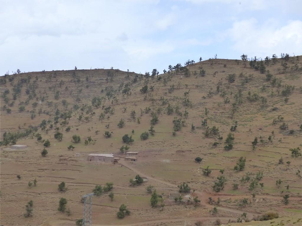 La route devait tourner à gauche au niveau des tentes. Soit le GPS se trompe, soit la route n’existe plus (peu probable), soit les tentes ont accaparé cet espace plat ? Toujours est-il que notre itinéraire n’est pas faisable, il faut faire demi tour et revenir jusqu’au lodge de ce matin. Entre temps, nous avons profité de la relative fraîcheur et de jolis paysages verdoyants et parfois organisés en terrasse.