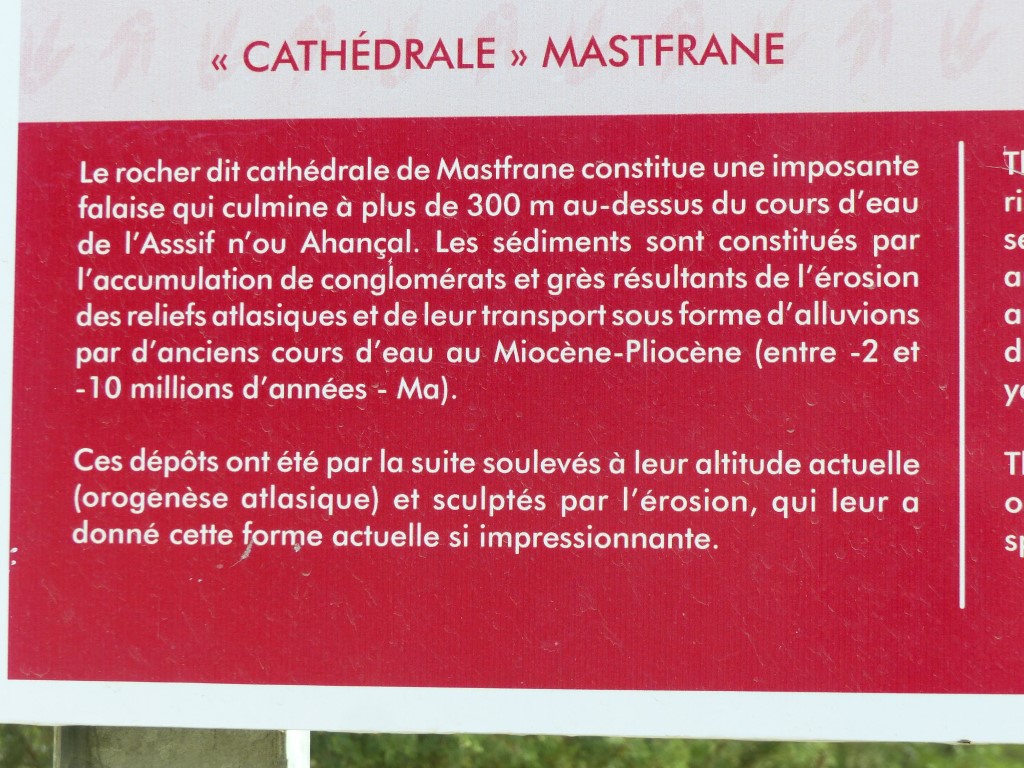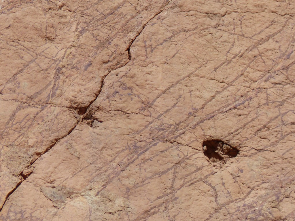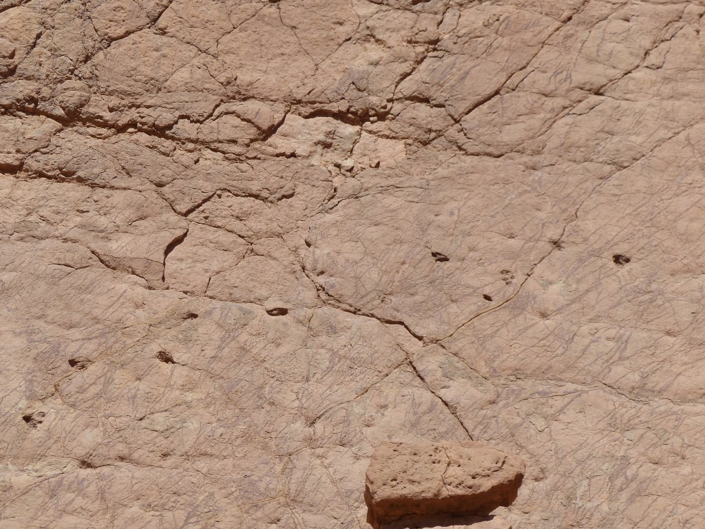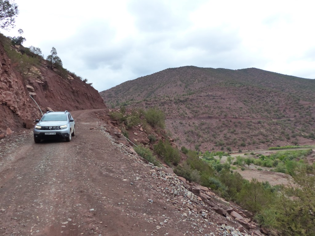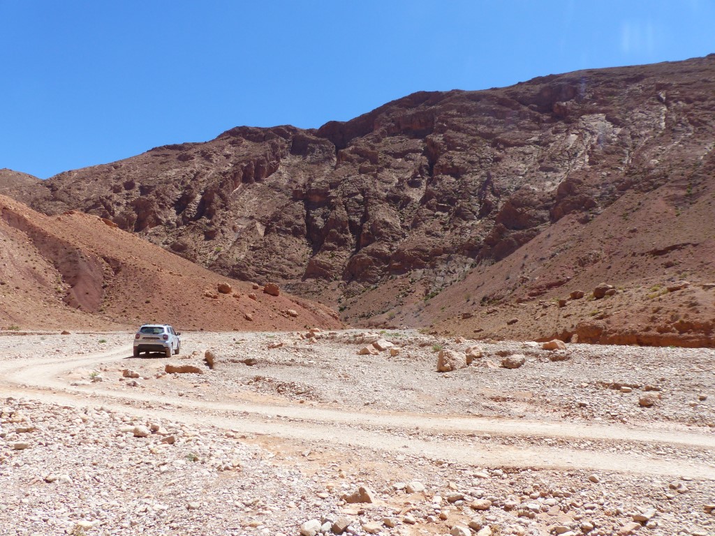 Le début du trajet nous mène en montagne en surplomb d'un cours d'eau. En redescendant à la civilisation, un panneau attire notre attention : « traces de dinosaures ». Il faut prendre un chemin étroit pour ensuite arriver dans un oued très large où une piste sur une voie est aménagée. Elle n’est pas compliquée mais la garde au sol du Duster est juste ce qu’il faut dans quels endroits un peu abimés. Un panneau indique le lieu où il faut observer les traces (un point à 5km du départ de la route et un autre à 30km (où nous n’irons pas). Heureusement que ce panneau est là ; il nous faut un petit temps pour identifier des traces dans la paroi rocheuse. Demi tour pour revenir à la route.